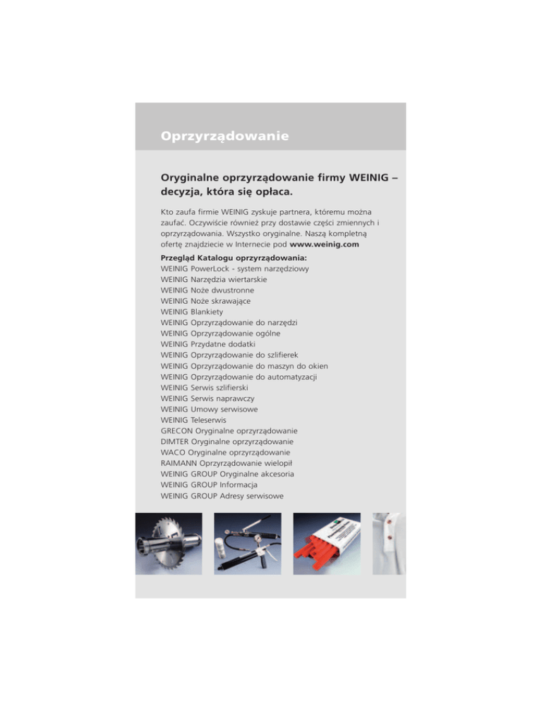 Oprzyrządowanie Oryginalne oprzyrządowanie firmy WEINIG – decyzja, która się opłaca. Kto zaufa firmie WEINIG zyskuje partnera, któremu można zaufać. Oczywiście również przy dostawie części zmiennych i oprzyrządowania. Wszystko oryginalne. Naszą kompletną ofertę znajdziecie w Internecie pod www.weinig.com Przegląd Katalogu oprzyrządowania: WEINIG PowerLock - system narzędziowy WEINIG Narzędzia wiertarskie WEINIG Noże dwustronne WEINIG Noże skrawające WEINIG Blankiety WEINIG Oprzyrządowanie do narzędzi WEINIG Oprzyrządowanie ogólne WEINIG Przydatne dodatki WEINIG Oprzyrządowanie do szlifierek WEINIG Oprzyrządowanie do maszyn do okien WEINIG Oprzyrządowanie do automatyzacji WEINIG Serwis szlifierski WEINIG Serwis naprawczy WEINIG Umowy serwisowe WEINIG Teleserwis GRECON Oryginalne oprzyrządowanie DIMTER Oryginalne oprzyrządowanie WACO Oryginalne oprzyrządowanie RAIMANN Oprzyrządowanie wielopił WEINIG GROUP Oryginalne akcesoria WEINIG GROUP Informacja WEINIG GROUP Adresy serwisowe 16 17 Dzięki unikatowej w tej branży strukturze organizacyjnej gwarantujemy dostawę każdej zamówionej części w najkrótszym czasie. Czasy przestoju Waszej maszyny redukowane są do absolutnego minimum. Co tydzień dostarczamy z Tauberbischofsheim szybko i punktualnie około 20 ton materiału na całym globie. Nasza „Gorąca Linia“ dba abyśmy byli dla Was osiągalni w kilku językach. Naprawy dokonują nasi wyszkoleni specjaliści. A jeżeli potrzebujecie fachowej pomocy WEINIGA na miejscu, mamy do dyspozycji 150 techników serwisowych na całym świecie.