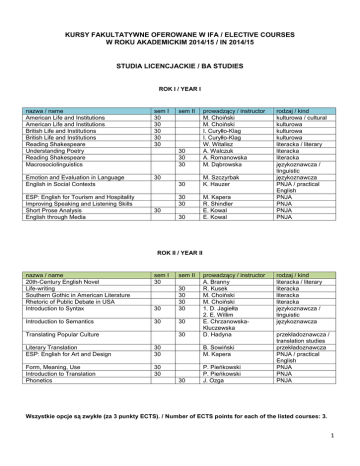 KURSY FAKULTATYWNE OFEROWANE W IFA / ELECTIVE COURSES W ROKU AKADEMICKIM 2014/15 / IN 2014/15 STUDIA LICENCJACKIE / BA STUDIES ROK I / YEAR I nazwa / name American Life and Institutions American Life and Institutions British Life and Institutions British Life and Institutions Reading Shakespeare Understanding Poetry Reading Shakespeare Macrosociolinguistics sem I 30 30 30 30 30 Emotion and Evaluation in Language English in Social Contexts 30 ESP: English for Tourism and Hospitality Improving Speaking and Listening Skills Short Prose Analysis English through Media sem II 30 30 30 prowadzący / instructor M. Choiński M. Choiński I. Curyłło-Klag I. Curyłło-Klag W. Witalisz A. Walczuk A. Romanowska M. Dąbrowska 30 M. Szczyrbak K. Hauzer 30 30 30 30 M. Kapera R. Shindler E. Kowal E. Kowal rodzaj / kind kulturowa / cultural kulturowa kulturowa kulturowa literacka / literary literacka literacka językoznawcza / linguistic językoznawcza PNJA / practical English PNJA PNJA PNJA PNJA ROK II / YEAR II nazwa / name 20th-Century English Novel Life-writing Southern Gothic in American Literature Rhetoric of Public Debate in USA Introduction to Syntax sem I 30 30 30 30 30 30 Introduction to Semantics 30 30 Translating Popular Culture sem II 30 prowadzący / instructor A. Branny R. Kusek M. Choiński M. Choiński 1. D. Jagiełła 2. E. Willim E. ChrzanowskaKluczewska D. Hadyna Literary Translation ESP: English for Art and Design 30 30 B. Sowiński M. Kapera Form, Meaning, Use Introduction to Translation Phonetics 30 30 P. Pieńkowski P. Pieńkowski J. Ozga 30 rodzaj / kind literacka / literary literacka literacka literacka językoznawcza / linguistic językoznawcza przekładoznawcza / translation studies przekładoznawcza PNJA / practical English PNJA PNJA PNJA Wszystkie opcje są zwykłe (za 3 punkty ECTS). / Number of ECTS points for each of the listed courses: 3. 1