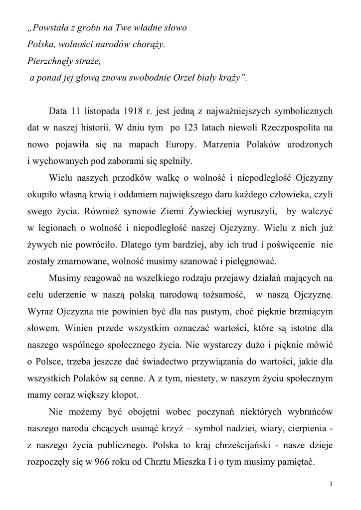 „Powstała z grobu na Twe władne słowo Polska, wolności narodów chorąży. Pierzchnęły straże, a ponad jej głową znowu swobodnie Orzeł biały krąży”. Data 11 listopada 1918 r. jest jedną z najważniejszych symbolicznych dat w naszej historii. W dniu tym po 123 latach niewoli Rzeczpospolita na nowo pojawiła się na mapach Europy. Marzenia Polaków urodzonych i wychowanych pod zaborami się spełniły. Wielu naszych przodków walkę o wolność i niepodległość Ojczyzny okupiło własną krwią i oddaniem największego daru każdego człowieka, czyli swego życia. Również synowie Ziemi Żywieckiej wyruszyli, by walczyć w legionach o wolność i niepodległość naszej Ojczyzny. Wielu z nich już żywych nie powróciło. Dlatego tym bardziej, aby ich trud i poświęcenie nie zostały zmarnowane, wolność musimy szanować i pielęgnować. Musimy reagować na wszelkiego rodzaju przejawy działań mających na celu uderzenie w naszą polską narodową tożsamość, w naszą Ojczyznę. Wyraz Ojczyzna nie powinien być dla nas pustym, choć pięknie brzmiącym słowem. Winien przede wszystkim oznaczać wartości, które są istotne dla naszego wspólnego społecznego życia. Nie wystarczy dużo i pięknie mówić o Polsce, trzeba jeszcze dać świadectwo przywiązania do wartości, jakie dla wszystkich Polaków są cenne. A z tym, niestety, w naszym życiu społecznym mamy coraz większy kłopot. Nie możemy być obojętni wobec poczynań niektórych wybrańców naszego narodu chcących usunąć krzyż – symbol nadziei, wiary, cierpienia z naszego życia publicznego. Polska to kraj chrześcijański - nasze dzieje rozpoczęły się w 966 roku od Chrztu Mieszka I i o tym musimy pamiętać. 1 Krzyż naszemu narodowi towarzyszył przez całe wieki w tragicznych i dobrych chwilach. Ten krzyż w ręku trzymali najwięksi synowie naszego narodu. Błogosławiony Ojciec św. Jan Paweł II, gdy podejmował trudne decyzje dla całego świata i Święty Maksymilian Kolbe, gdy umierał w celi śmierci za drugiego człowieka. W Żywcu krzyż był, jest i będzie w instytucjach publicznych i żądamy jego dalszej obecności w sejmie w senacie i centralnych instytucjach publicznych. O miłości do Ojczyzny można mówić wiele. Trudniej o niej świadczyć. Budując współczesną Żywiecczyznę, powinniśmy ją oprzeć na solidnych fundamentach wywodzących się z narodowej historii, tradycji i kultury. Tylko na takich podwalinach możemy dopiero zacząć pracę nad zapewnieniem lepszej przyszłości naszemu i następnym pokoleniom. W tym dziele wielkie znaczenie ma, spoczywające szczególnie na domu rodzinnym i polskiej szkole, wychowanie dzieci i młodzieży w duchu patriotycznym. Nasza przeszłość naznaczona krwią i ofiarą wielu naszych przodków, zobowiązuje nas szczególnie do dumy z polskiej kultury, tradycji i historii. Do poszanowania niepodległości na każdym skrawku polskiej ziemi. Dzisiaj zaangażowanie patriotyczne nie wymaga od nas ofiary krwi czy dokonywania dramatycznych wyborów pomiędzy życiem prywatnym, a służbą Ojczyźnie. Nie oznacza to jednak, że patriotyzm nie jest potrzebny. Bo właśnie dzisiaj w zjednoczonej Europie ma on dla nas ogromne znaczenie. W tej Europie będziemy tyle znaczyć, na ile potrafimy być odrębni, na ile potrafimy wnieść coś swojego w tworzenie wspólnego europejskiego domu. Wizja Europy zjednoczonej to taka, w której mieści się poszanowanie dla narodowych kultur i regionalnych tradycji. W takiej Europie mają szansę istnieć te narody, które są wolne, niepodległe i szanujące się wzajemnie. 2 Niech wolność, którą w darze dał nam Marszałek Józef Piłsudski i jego legiony, obecni tutaj kombatanci z różnych organizacji zbrojnych i uczestnicy zrywu wolnościowego „Solidarności” - po wsze czasy będzie pielęgnowana i szanowana. Zakończmy narodowe waśnie, nie opluwajmy się nawzajem. Żyjmy z atmosferze merytorycznej, szczerej dyskusji o wszystkim, co nas Polaków boli. Niech prawica nie będzie opozycją wobec prawicy. Niech te pomysły, chęć działania także lewej strony naszej sceny politycznej służące dobru Polski będą należycie wykorzystane przez ludzi sprawujących władzę i cały polski naród. W imieniu władz samorządowych Powiatu Żywieckiego i Miasta Żywca Starosty Andrzeja Zielińskiego, Przewodniczącego Rady Powiatu Edwarda Płonki, Przewodniczącego Rady Miejskiej Krzysztofa Grenia i swoim własnym dziękuję proboszczom i księżom żywieckich parafii z księdzem Infułatem Władysławem Fidelusem za Mszę Świętą i modlitwę razem z nami w intencji naszej Ojczyzny. Dziękuję pocztom sztandarowym, kombatantom, mieszkańcom, Pani Poseł, radnym wszystkich szczebli, młodzieży z ich nauczycielami, służbom mundurowym ( policji, służby celnej, straży granicznej, straży miejskiej), przedstawicielom organizacji politycznych i społecznych, przedstawicielom firm prywatnych i państwowych oraz instytucji samorządowych za udział. Szczególne słowa podziękowania kieruję do orkiestry dętej, Towarzystwa Miłośników Oręża Polskiego, a także żywieckich harcerzy za uświetnienie dzisiejszej uroczystości. Dziękuję dyrektorowi Miejskiego Centrum Kultury i jego pracownikom za przygotowanie dzisiejszych obchodów rocznicy odzyskania niepodległości. Na ten dzień naszego narodowego świętowania pozdrawiam jeszcze raz wszystkich. 3 4