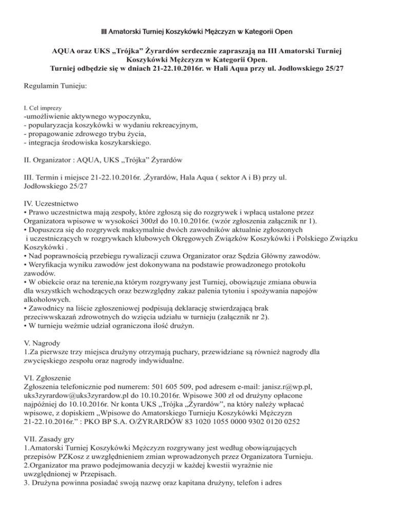III Amatorski Turniej Koszykówki Mężczyzn w Kategorii Open AQUA oraz UKS „Trójka” Żyrardów serdecznie zapraszają na III Amatorski Turniej Koszykówki Mężczyzn w Kategorii Open. Turniej odbędzie się w dniach 21-22.10.2016r. w Hali Aqua przy ul. Jodłowskiego 25/27 Regulamin Tunieju: I. Cel imprezy -umożliwienie aktywnego wypoczynku, - popularyzacja koszykówki w wydaniu rekreacyjnym, - propagowanie zdrowego trybu życia, - integracja środowiska koszykarskiego. II. Organizator : AQUA, UKS „Trójka” Żyrardów III. Termin i miejsce 21-22.10.2016r. ,Żyrardów, Hala Aqua ( sektor A i B) przy ul. Jodłowskiego 25/27 IV. Uczestnictwo • Prawo uczestnictwa mają zespoły, które zgłoszą się do rozgrywek i wpłacą ustalone przez Organizatora wpisowe w wysokości 300zł do 10.10.2016r. (wzór zgłoszenia załącznik nr 1). • Dopuszcza się do rozgrywek maksymalnie dwóch zawodników aktualnie zgłoszonych i uczestniczących w rozgrywkach klubowych Okręgowych Związków Koszykówki i Polskiego Związku Koszykówki . • Nad poprawnością przebiegu rywalizacji czuwa Organizator oraz Sędzia Główny zawodów. • Weryfikacja wyniku zawodów jest dokonywana na podstawie prowadzonego protokołu zawodów. • W obiekcie oraz na terenie,na którym rozgrywany jest Turniej, obowiązuje zmiana obuwia dla wszystkich wchodzących oraz bezwzględny zakaz palenia tytoniu i spożywania napojów alkoholowych. • Zawodnicy na liście zgłoszeniowej podpisują deklarację stwierdzającą brak przeciwwskazań zdrowotnych do wzięcia udziału w turnieju (załącznik nr 2). • W turnieju weźmie udział ograniczona ilość drużyn. V. Nagrody 1.Za pierwsze trzy miejsca drużyny otrzymają puchary, przewidziane są również nagrody dla zwycięskiego zespołu oraz nagrody indywidualne. VI. Zgłoszenie Zgłoszenia telefonicznie pod numerem: 501 605 509, pod adresem e-mail: [email protected], [email protected] do 10.10.2016r. Wpisowe 300 zł od drużyny opłacone najpóźniej do 10.10.2016r. Nr konta UKS „Trójka „Żyrardów”, na który należy wpłacać wpisowe, z dopiskiem „Wpisowe do Amatorskiego Turnieju Koszykówki Mężczyzn 21-22.10.2016r.” : PKO BP S.A. O/ŻYRARDÓW 83 1020 1055 0000 9302 0120 0252 VII. Zasady gry 1.Amatorski Turniej Koszykówki Mężczyzn rozgrywany jest według obowiązujących przepisów PZKosz z uwzględnieniem zmian wprowadzonych przez Organizatora Turnieju. 2.Organizator ma prawo podejmowania decyzji w każdej kwestii wyraźnie nie uwzględnionej w Przepisach. 3. Drużyna powinna posiadać swoją nazwę oraz kapitana drużyny, telefon i adres kontaktowy oraz skład osobowy – do rozgrywek można zgłosić 7- 12 zawodników. 4.Skład drużyny należy dostarczyć do stolika sędziowskiego min. 15 min.przed rozpoczęciem spotkania (zał.3). 5. Drużyna powinna posiadać jednolity strój sportowy. Każdy zawodnik obowiązany jest posiadać numer na koszulce. 6. Czas gry: 4 x 10 min. , przerwa pomiędzy 1 i 2 oraz 3 i 4 ma długość 1 min. przerwa pomiędzy 2 i 3 kwartą ma długość 3min. Czas zatrzymywany na czas dla trenera i w ostatnich 2 min. IV kwarty. Jeżeli wynik nie jest rozstrzygnięty po zakończeniu czwartej kwarty meczu, zarządza się dogrywkę 3 min. 7.Drużyny mają do dyspozycji 2 przerwy na żądanie w każdej połowie meczu. 8.Na ławce rezerwowych zespołu mogą znajdować się tylko zawodnicy rezerwowi zespołu oraz trener drużyny. Wszystkie osoby postronne związane z zespołem mają obowiązek zająć miejsca na widowni sali. 9. Pozostałe przepisy zgodnie z zasadami gier ustanowionymi przez PZKosz. VIII. Postanowienia dotyczące dyscypliny. 1. Ogół zachowań zawodników i drużyn biorących udział w zawodach jest oceniany przez dwójkę arbitrów prowadzących spotkanie. 2. Drużyny uczestniczące w rozgrywkach, ich opiekunowie, trenerzy oraz osoby towarzyszące obowiązani są przestrzegać postanowień, przepisów gry i regulaminu. 3. Drużyna i jej zawodnicy ponoszą pełną odpowiedzialność materialną za szkody wyrządzone przez jej zawodników, kibiców i osoby towarzyszące podczas rozgrywek. 4. Regulamin zobowiązuje wszystkich arbitrów do bezwzględnego karania zawodników, trenerów i osób towarzyszących drużynie za wszelkie objawy niesportowego zachowania. Jednocześnie wzywa się arbitrów do wypraszania z sali osób, które utrudniają prowadzenie zawodów lub zakłócają ich sportowy charakter. 5. Zawodnik ukarany dyskwalifikacją jest automatycznie ukarany odsunięciem od jednego spotkania. Za następne przewinienie dyskwalifikujące automatycznie ukarany zostaje odsunięciem od dwóch spotkań. 6. Zawodnik ukarany przewinieniem technicznym może zostać ukarany odsunięciem od występów w Turnieju w zależności od okoliczności, w których zostało otrzymane przewinienie. IX. Postanowienia końcowe 1. We wszystkich sprawach spornych-organizacyjnych głos decydujący ma przedstawiciel organizatora 2.We wszystkich sprawach dotyczących sędziowania, wyniku, weryfikacji zawodników głos decydujący ma sędzia główny turnieju. 3. System i terminarz gier oraz wszelkie sprawy inne organizacyjne zostaną przedstawione po zgłoszeniu się odpowiedniej ilości drużyn 4.Organizator zapewnia opiekę medyczną podczas turnieju, 3 butelki wody na mecz.