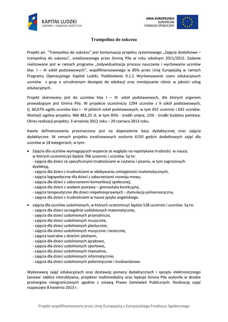 Trampolina do sukcesu Projekt pn. "Trampolina do sukcesu" jest kontynuacja projektu systemowego „Zajęcia dodatkowe – trampoliną do sukcesu”, zrealizowanego przez Gminę Piła w roku szkolnym 2011/2012. Zadanie realizowane jest w ramach programu „Indywidualizacja procesu nauczania i wychowania uczniów klas I – III szkół podstawowych”, współfinansowanego w 85% przez Unię Europejską w ramach Programu Operacyjnego Kapitał Ludzki, Poddziałanie 9.1.2 Wyrównywanie szans edukacyjnych uczniów z grup o utrudnionym dostępie do edukacji oraz zmniejszanie różnic w jakości usług edukacyjnych. Projekt skierowany jest do uczniów klas I – III szkół podstawowych, dla których organem prowadzącym jest Gmina Piła. W projekcie uczestniczy 1294 uczniów z 9 szkół podstawowych, tj. 60,67% ogółu uczniów klas I - III pilskich szkół podstawowych, w tym 652 uczennic i 642 uczniów. Wartość ogólna projektu: 966 881,25 zł, w tym 85% - środki unijne, 15% - środki budżetu państwa. Okres realizacji projektu: 3 września 2012 roku – 29 czerwca 2013 roku. Kwota dofinansowania przeznaczona jest na doposażenie bazy dydaktycznej oraz zajęcia dydaktyczne. W ramach projektu zrealizowanych zostanie 6150 godzin dodatkowych zajęć dla uczniów w 18 kategoriach, w tym: Zajęcia dla uczniów wymagających wsparcia ze względu na napotykane trudności w nauce, w których uczestniczyć będzie 766 uczennic i uczniów. Są to: - zajęcia dla dzieci ze specyficznymi trudnościami w czytaniu i pisaniu, w tym zagrożonych dysleksją, - zajęcia dla dzieci z trudnościami w zdobywaniu umiejętności matematycznych, - zajęcia logopedyczne dla dzieci z zaburzeniami rozwoju mowy, - zajęcia dla dzieci z zaburzeniami komunikacji społecznej, - zajęcia dla dzieci z wadami postawy – gimnastyka korekcyjna, - zajęcia terapeutyczne dla dzieci niepełnosprawnych - stymulacja polisensoryczna, - zajęcia dla dzieci z trudnościami w nauce języka angielskiego. zajęcia dla uczniów uzdolnionych, w których uczestniczyć będzie 528 uczennic i uczniów. Są to: - zajęcia dla dzieci szczególnie uzdolnionych matematycznie, - zajęcia dla dzieci uzdolnionych przyrodniczo, - zajęcia dla dzieci uzdolnionych muzycznie, - zajęcia dla dzieci uzdolnionych plastycznie, - zajęcia dla dzieci uzdolnionych muzycznie i tanecznie, - zajęcia teatralne z dziećmi zdolnymi, - zajęcia dla dzieci uzdolnionych językowo, - zajęcia dla dzieci uzdolnionych sportowo, - zajęcia dla dzieci uzdolnionych manualnie, - zajęcia dla dzieci uzdolnionych informatycznie, - zajęcia dla dzieci uzdolnionych polonistycznie i środowiskowo. Wykonawcę zajęć edukacyjnych oraz dostawcę pomocy dydaktycznych i sprzętu elektronicznego (zestaw: tablica interaktywna, projektor multimedialny oraz laptop) Gmina Piła wyłoniła w drodze przetargów nieograniczonych zgodnie z ustawą Prawo Zamówień Publicznych. Realizację zajęć rozpoczęto 8 kwietnia 2013 r. Projekt współfinansowany przez Unię Europejską z Europejskiego Funduszu Społecznego