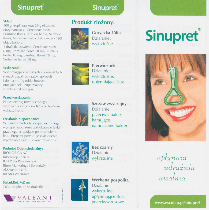Skład: 100 g kropli zawiera: 29 g ekstraktu otrzymanego z: Gentianae radix, Primulae flores, Rumicis herba, Sambuci flores, Verbenae herba. Lek zawiera 19% obj. alkoholu. 1 drażetka zawiera: Genlianae radix 6 mg, Primulae flores 18 mg, Rumicis herba 18 mg, Sambuci flores 18 mg, Verbenae herba 18 mg. Wskazania: Wspomagająco w ostrych i przewlekłych stanach zapalnych zatok, górnych i dolnych dróg oddechowych oraz jako lek uzupełniający wantybiotykoterapii. Przeciwwskazania: Nie zaleca się równoczesnego stosowania innych środków o działaniu wykrztuśnym. Działania niepożądane: W bardzo rzadkich przypadkach mogą wystąpić zaburzenia żołądkowe o lekkim przebiegu ustępujące po odstawieniu leku. Preparat powoduje zwiększenie wydzielania śluzu i soków trawiennych. Podmiot Odpowiedzialny: BIONORICA AG Informacji udziela: ICN Polfa Rzeszów S.A. Biuro Marketingu i Sprzedaży A1.Szucha 13.15 Goryczka żółta Działanie: wykrztuśne Pierwiosnek Działanie: wykrztuśne, upłynniające śluz Szczaw zwyczajny Działanie: przeciwzapalne, hamujące namnażanie bakterii Bez czarny Działanie: wykrztuśne 00-580 Warszawa Świad.Rej. MZ nr: 7637 krople, 7638 drażetki Sinupret ® Werbena pospolita Działanie: wykrztuśne, upłynniające śluz, przeciwwirusowe upłynnia udrażnia uwalnia www.esculap.pl/sinupret Sinupret ® • Stany zapalne dolnych i górnych dróg oddechowych • Uzupełniająco w antybiotykoterapii Dorośli 3 x dziennie 50 kropli Dzieci w wieku szkolnym 3 x dziennie 25 kropli U dzieci poniżej 6 r.ż. preparat można stosować wyłącznie w porozumieniu z lekarzem: 3 x dziennie 15 kropli W szczególnych przypadkach dawkę można zwiększyć dwukrotnie. Podczas pobierania leku buteleczkę trzymać pionowo w dół. • • • i Sl~~ref 1-- I 50 drażetek 100 drażetek 100 mi krople Poprawia drożność i wentylację zatok Zmniejsza obrzęk błon śluzowych górnych dróg oddechowych Ułatwia oczyszczanie dróg oddechowych Dorośli 3 x dziennie 2 drażetki Dzieci w wieku szkolnym 3 x dziennie 1 drażetkę W szczególnych przypadkach dawkę można zwiększyć dwukrotnie. Drażetki powinny być połykane w całości z niewielką ilością wody. Sinupret nadaje się do długotrwałej terapii Lek można podawać w ciąży i w okresie karmienia piersią