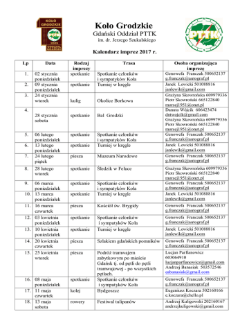 Koło Grodzkie Gdański Oddział PTTK im. dr. Jerzego Szukalskiego Kalendarz imprez 2017 r. Lp 1. 2. 3. Data 02 stycznia poniedziałek 09 stycznia poniedziałek 24 stycznia wtorek Rodzaj imprezy spotkanie Trasa spotkanie Spotkanie członków i sympatyków Koła Turniej w kręgle kulig Okolice Borkowa 28 stycznia sobota spotkanie Bal Grodzki 06 lutego poniedziałek 13 lutego poniedziałek 24 lutego piątek spotkanie spotkanie Spotkanie członków i sympatyków Koła Turniej w kręgle piesza Muzeum Narodowe 4. 5. 6. 7. Osoba organizująca imprezę Genowefa Franczak 500652137 [email protected] Janek Lewicki 501088816 [email protected] Grażyna Skowrońska 609979336 Piotr Skowroński 665122840 [email protected] Danuta Wójcik 606423474 [email protected] Grażyna Skowrońska 609979336 Piotr Skowroński 665122840 [email protected] Genowefa Franczak 500652137 [email protected] Janek Lewicki 501088816 [email protected] Genowefa Franczak 500652137 [email protected] Grażyna Skowrońska 609979336 Piotr Skowroński 665122840 [email protected] Genowefa Franczak 500652137 [email protected] Janek Lewicki 501088816 [email protected] 8. 28 lutego wtorek spotkanie Śledzik w Feluce 9. 06 marca poniedziałek 13 marca poniedziałek 16 marca czwartek 03 kwietnia poniedziałek 10 kwietnia poniedziałek 20 kwietnia czwartek 25 kwietnia wtorek spotkanie spotkanie Spotkanie członków i sympatyków Koła Turniej w kręgle piesza Kościół św. Brygidy Genowefa Franczak 500652137 [email protected] spotkanie Genowefa Franczak 500652137 [email protected] spotkanie Spotkanie członków i sympatyków Koła Turniej w kręgle piesza Szlakiem gdańskich pomników Genowefa Franczak 500652137 [email protected] piesza Lucjan Parfianowicz 603064910 [email protected] Andrzej Banasiak 503572546 [email protected] kolej Podróż tramwajem zabytkowym po mieście Gdańsk tj. od pętli do pętli tramwajowej - po wszystkich pętlach. Spotkanie członków i sympatyków Koła Bydgoszcz rowery Festiwal tulipanów 10. 11. 12. 13. 14. 15. 16. 08 maja poniedziałek 17. 11 maja czwartek 18. 13 maja sobota spotkanie Janek Lewicki 501088816 [email protected] Genowefa Franczak 500652137 [email protected] Eugeniusz Koczara 502160166 [email protected] Andrzej Kuligowski 202160167 [email protected] Janek Lewicki 501088816 [email protected] Eugeniusz Koczara 502160166 [email protected] 19. 15 maja poniedziałek 20. 22-25 maja pon-czwartek spotkanie Turniej w kręgle Kolejautokar Gdańsk-Lublin-Zamość-Lwów 21. 30 maja wtorek 22. 05 czerwca poniedziałek 23. 09 czerwca piątek 24. 12 czerwca poniedziałek 25. 17 czerwca sobota 26. 23 czerwca piątek 27. 2 27 czerwca 7 wtorek rowery Gdańsk – Park polodowcowy spotkanie spotkanie Spotkanie członków i sympatyków Koła Poznajemy szlaki turystyczne okolic Trójmiasta: I etap Turniej w kręgle autokar Kaszuby Północne II etap autokar Świecie-Chełmno piesza Targ Rybny, Osiek i Muzeum II Wojny Światowej 28. 03 lipca poniedziałek spotkanie Spotkanie członków i sympatyków Koła 29. 05 lipca środa 30. 010 lipca poniedziałek 31. 15 lipca sobota 32. m19 lipca asśroda kr 33. y 22 lipca sobota piesza Tramwaj wodny Żabi Kruk – Twierdza Wisłoujście+ognisko Turniej w kręgle kolej Lęborskie Dni Jakubowe 604560216 [email protected] 34. 26 lipca środa 35. 07 sierpnia poniedziałek rowery Grabina Zameczek-Wiślina spotkanie Spotkanie członków i sympatyków Koła Danuta Wójcik 606423474 [email protected] Genowefa Franczak 500652137 [email protected] 36. 14 sierpnia poniedziałek 37. 15 sierpnia wtorek 38. 23 sierpnia środa spotkanie Turniej w kręgle kajaki Krępiec piesza Nordic wal king piesza spotkanie piesza piesza Poznajemy szlaki turystyczne okolic Trójmiasta: II etap Górny Sopot Danuta Wójcik 606423474 [email protected] Genowefa Franczak 500652137 [email protected] Janek Lewicki 501088816 [email protected] Janek Lewicki 501088816 [email protected] Manuela 661728851 [email protected] Majka Ścisk 505966666 [email protected] Lucjan Parfianowicz 603064910 [email protected] Andrzej Banasiak 503572546 [email protected] Genowefa Franczak 500652137 [email protected] Genowefa Franczak 500652137 [email protected] Janek Lewicki 501088816 [email protected] Janek Lewicki 501088816 [email protected] Genowefa Franczak 500652137 [email protected] Krystyna Maćkowska 39. 26 sierpnia sobota 40. 02 września do potwierdzenia Sobota piesza Poznajemy szlaki turystyczne okolic Trójmiasta: III etap kolej+PKS Babie Lato i Święto Miodu 41. 03 września niedziela kolej Janek Lewicki 501088816 [email protected] Zbyszek Wójcicki 693463281 [email protected] Grażyna Skowrońska 609979336 Piotr Skowroński 665122840 [email protected] Janek Lewicki 501088816 [email protected] Krystyna Maćkowska 604560216 [email protected] Krojanty Zbyszek Wójcicki 693463281 [email protected] 42. 04 września poniedziałek 43. 08 września piątek 44. 11 września poniedziałek 45. 11-15 września pon-piątek 46. 21 września czwartek 47. 26-27 września 48. 30 września sobota 49. 02 październik poniedziałek 50. 09 październik poniedziałek 51. 17 październik wtorek spotkanie Genowefa Franczak 500652137 [email protected] Genowefa Franczak 500652137 [email protected] Janek Lewicki 501088816 [email protected] autokar Spotkanie członków i sympatyków Koła Zielona Wieś spotkanie Turniej w kręgle autokar Bieszczady Manuela 661728851 [email protected] piesza Ognisko z akordeonistą Gołębiewo Kołobrzeg i okolice Eugeniusz Koczara 502160166 [email protected] autokar piesza Lucjan Parfianowicz 603064910 [email protected] Janek Lewicki 501088816 [email protected] spotkanie Poznajemy szlaki turystyczne okolic Trójmiasta: IV etap Spotkanie członków i sympatyków Koła Turniej w kręgle piesza Akwarium w Gdyni Maria Mischke 601490313 [email protected] 52. 21 październik sobota piesza Poznajemy szlaki turystyczne okolic Trójmiasta: V etap Janek Lewicki 501088816 [email protected] 53. 03 listopada piątek piesza Cm