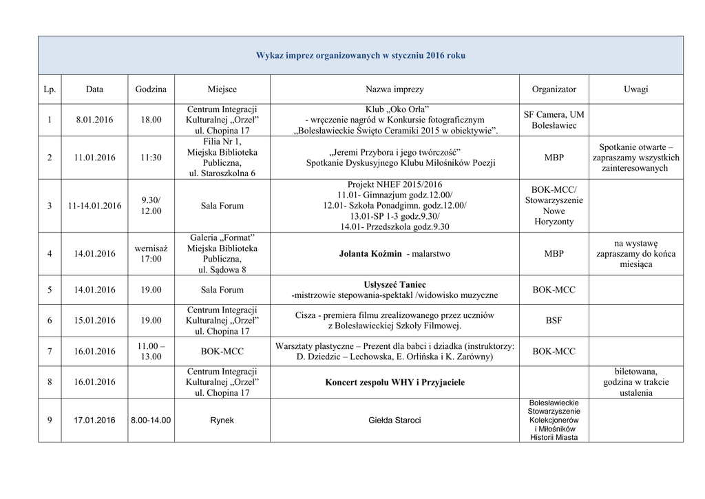 Wykaz imprez organizowanych w styczniu 2016 roku Lp. Data Godzina 1 8.01.2016 18.00 2 11.01.2016 11:30 3 11-14.01.2016 Miejsce Nazwa imprezy Organizator Centrum Integracji Kulturalnej „Orzeł” ul. Chopina 17 Filia Nr 1, Miejska Biblioteka Publiczna, ul. Staroszkolna 6 Klub „Oko Orła” - wręczenie nagród w Konkursie fotograficznym „Bolesławieckie Święto Ceramiki 2015 w obiektywie”. SF Camera, UM Bolesławiec „Jeremi Przybora i jego twórczość” Spotkanie Dyskusyjnego Klubu Miłośników Poezji MBP 9.30/ 12.00 Sala Forum Projekt NHEF 2015/2016 11.01- Gimnazjum godz.12.00/ 12.01- Szkoła Ponadgimn. godz.12.00/ 13.01-SP 1-3 godz.9.30/ 14.01- Przedszkola godz.9.30 Jolanta Koźmin - malarstwo MBP BOK-MCC/ Stowarzyszenie Nowe Horyzonty 4 14.01.2016 wernisaż 17:00 Galeria „Format” Miejska Biblioteka Publiczna, ul. Sądowa 8 5 14.01.2016 19.00 Sala Forum Usłyszeć Taniec -mistrzowie stepowania-spektakl /widowisko muzyczne BOK-MCC 6 15.01.2016 19.00 Centrum Integracji Kulturalnej „Orzeł” ul. Chopina 17 Cisza - premiera filmu zrealizowanego przez uczniów z Bolesławieckiej Szkoły Filmowej. BSF 7 16.01.2016 11.00 – 13.00 BOK-MCC Warsztaty plastyczne – Prezent dla babci i dziadka (instruktorzy: D. Dziedzic – Lechowska, E. Orlińska i K. Zarówny) BOK-MCC 8 16.01.2016 Centrum Integracji Kulturalnej „Orzeł” ul. Chopina 17 Koncert zespołu WHY i Przyjaciele Rynek Giełda Staroci 9 17.01.2016 8.00-14.00 Bolesławieckie Stowarzyszenie Kolekcjonerów i Miłośników Historii Miasta Uwagi Spotkanie otwarte – zapraszamy wszystkich zainteresowanych na wystawę zapraszamy do końca miesiąca biletowana, godzina w trakcie ustalenia Galeria „Format” Miejska Biblioteka Publiczna, ul. Sądowa 8 Centrum Integracji Kulturalnej „Orzeł” ul. Chopina 17 „Kochankowie burzy” – spotkanie autorskie z Elżbietą Gizelą Erban MBP Spotkanie otwarte – zapraszamy wszystkich zainteresowanych Koncert dla przedszkolaków z Niepublicznego Przedszkola Nibyladia i Zielona Nibylandia. Nibylandia, Zielona Nibylandia wynajem 10 18.01.2016 11:00 11 19.01.2016 14.00 12 21.01.2016 17.00 Sala Forum Koncert Noworoczny Państwowej Szkoły Muzycznej I stopnia im.W. Lutosławskiego w Bolesławcu PSM/ BOKMCC 13 22.01.2016 6.00-15.00 Sala Forum Spektakle teatralne godz.8.30 „Mity greckie”, godz.10.10 „Dzieci króla baśni”, godz.11.40 „Dziady II” Teatr Artenes Wrocław Centrum Integracji Kulturalnej „Orzeł” ul. Chopina 17 Obchody 5. lecia powstania Stowarzyszenia Reemigrantów z Bośni ich Potomków oraz Przyjaciół w Bolesławcu. 18.00 Galeria „Mała Biała” Wernisaż pracowni Stanisława Bracha z ASP Warszawa Zima w domku pod lasem z cyklu „Opowiadania na cztery pory roku” Dziecięcy Dyskusyjny Klub Książki Stare i nowe hity bajkowe MBP Impreza dla grup zorganizowanych - dzieci wraz z rodzicami i opiekunami Wernisaż wystawy „Pocztówki zakochanych” ze zbiorów prof. dr hab. P. Banasia Muzeum Ceramiki w Bolesławcu wstęp bezpłatny 14 22.01.2016 15 22.01.2016 16 25.01.2016 9:30 Czytelnia Oddziału dla Dzieci, Mediateka Miejska Biblioteka Publiczna ul. Sądowa 8 17 26.01.2016 17.00 Muzeum Ceramiki ul. Kutuzowa 14 18.00 Centrum Integracji Kulturalnej „Orzeł” ul. Chopina 17 18 19 20 26.01.2016 27.01.2016 28.01.2016 16:00 17:00 Sala Multimedialna Miejska Biblioteka Publiczna ul. Sądowa 8 Sala Multimedialna Miejska Biblioteka Publiczna ul. Sądowa 8 Koncert muzyki filmowej i musicalowej z elementami teatru w wykonaniu uczestników Pracowni Wokalnej Barbary Lendzian oraz Pracowni Teatralnej „hallo grupa” Urszuli Frąszczak-Matyjewicz. Spotkanie Klubu Głuchego Czytelnika „Sztuka pakowania prezentów” Prezentacja multimedialna i wystawka książek tematycznych ze zbiorów biblioteki. Jakub Małecki : „Dygot” Spotkanie Dyskusyjnego Klubu Książki Stowarzyszenie Reemigrantów godzina w trakcie ustalania BOK-MCC BOK-MCC MBP Spotkanie otwarte – zapraszamy wszystkich zainteresowanych MBP Spotkanie otwarte – zapraszamy wszystkich zainteresowanych 21 30.01.2016 22 Od 02.01.2016 do 31.01.2016 23 Od 02.01.2016 do 31.01.2016 24 Od 02.01.2016 do 31.01.2016 12.00 Od wtorku do soboty 10.00-16.00 w niedziele 11.00-16.00 Od wtorku do soboty 10.00-16.00 w niedziele 11.00-16.00 Od wtorku do soboty 10.00-16.00 w niedziele 11.00-16.00 Sala Forum Bajka baletowa: Dziadek do orzechów- spektakl BOK-MCC Muzeum Ceramiki ul. A. Mickiewicza 13 Wystawa stała Działu Ceramiki Muzeum Ceramiki w Bolesławcu Bilet normalny 4 zł Bilet ulgowy 2 zł Dla dzieci i młodzieży 1 zł Muzeum Ceramiki ul. A. Mickiewicza 13 Wystawa czasowa „Huta Josephine w Szklarskiej Porębie na Śląsku w I poł. XX w. Wyroby szklane z ze zbiorów Muzeum Karkonoskiego w Jeleniej Górze” Muzeum Ceramiki w Bolesławcu Bilet normalny 4 zł Bilet ulgowy 2 zł Dla dzieci i młodzieży 1 zł Wystawa stała Działu Historii Miasta Muzeum Ceramiki w Bolesławcu Bilet normalny 4 zł Bilet ulgowy 2 zł Dla dzieci i młodzieży 1 zł Muzeum Ceramiki ul. Kutuzowa 14 Wystawa czasowa „Szopki polskie” Muzeum Ceramiki w Bolesławcu, Muzeum Wsi Opolskiej w Opolu, Muzeum Historyczne Miasta Krakowa Bilet normalny 4 zł Bilet ulgowy 2 zł Dla dzieci i młodzieży 1 zł Muzeum Ceramiki ul. Kutuzowa 14 Wystawa „Pocztówki zakochanych” ze zbiorów prof. dr hab. P. Banasia Muzeum Ceramiki w Bolesławcu Bilet normalny 4 zł Bilet ulgowy 2 zł Dla dzieci i młodzieży 1 zł MBP Zapraszamy do Biblioteki po odbiór nowego loginu – ważny od 1 stycznia do 30 czerwca MBP Zapraszamy do Biblioteki po odbiór nowego loginu – ważny Muzeum Ceramiki ul. Kutuzowa 14 Od wtorku 25 Od 02.01.2016 do soboty do 14.01.2016 10.00-16.00 w niedziele 11.00-16.00 26 27.01.201631.01.2016 27 01.01.31.01.2016 28 01.01.31.01.2016 Od wtorku do soboty 10.00-16.00 w niedziele 11.00-16.00 Mediateka Miejska Biblioteka Publiczna ul. Sądowa 8 Filia Nr 1, Miejska Biblioteka Publiczna ul. Staroszkolna 6 Mediateka Miejska Biblio