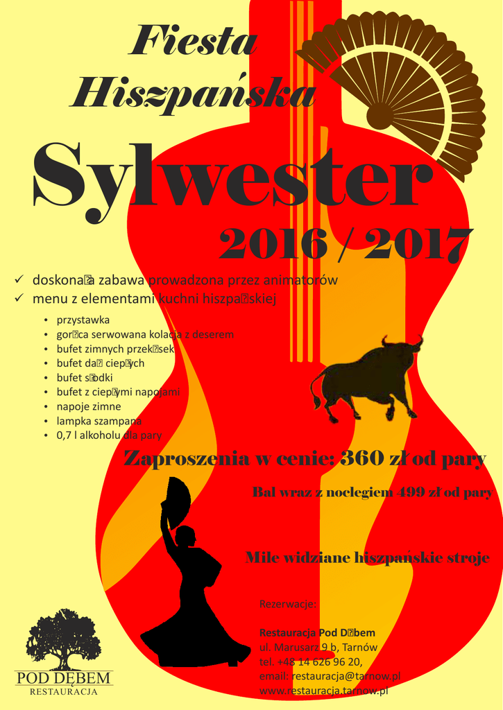 ` Fiesta Hiszpanska Sylwester 2016 / 2017 ü doskonała zabawa prowadzona przez animatorów ü menu z elementami kuchni hiszpańskiej ź ź ź ź ź ź ź ź ź przystawka gorąca serwowana kolacja z deserem bufet zimnych przekąsek bufet dań ciepłych bufet słodki bufet z ciepłymi napojami napoje zimne lampka szampana 0,7 l alkoholu dla pary | Zaproszenia w cenie: 360 zl od pary | Bal wraz z noclegiem 499 zl od pary ` Mile widziane hiszpanskie stroje Rezerwacje: POD DĘBEM RESTAURACJA Restauracja Pod Dębem ul. Marusarz 9 b, Tarnów tel. +48 14 626 96 20, email: [email protected] www.restauracja.tarnow.pl