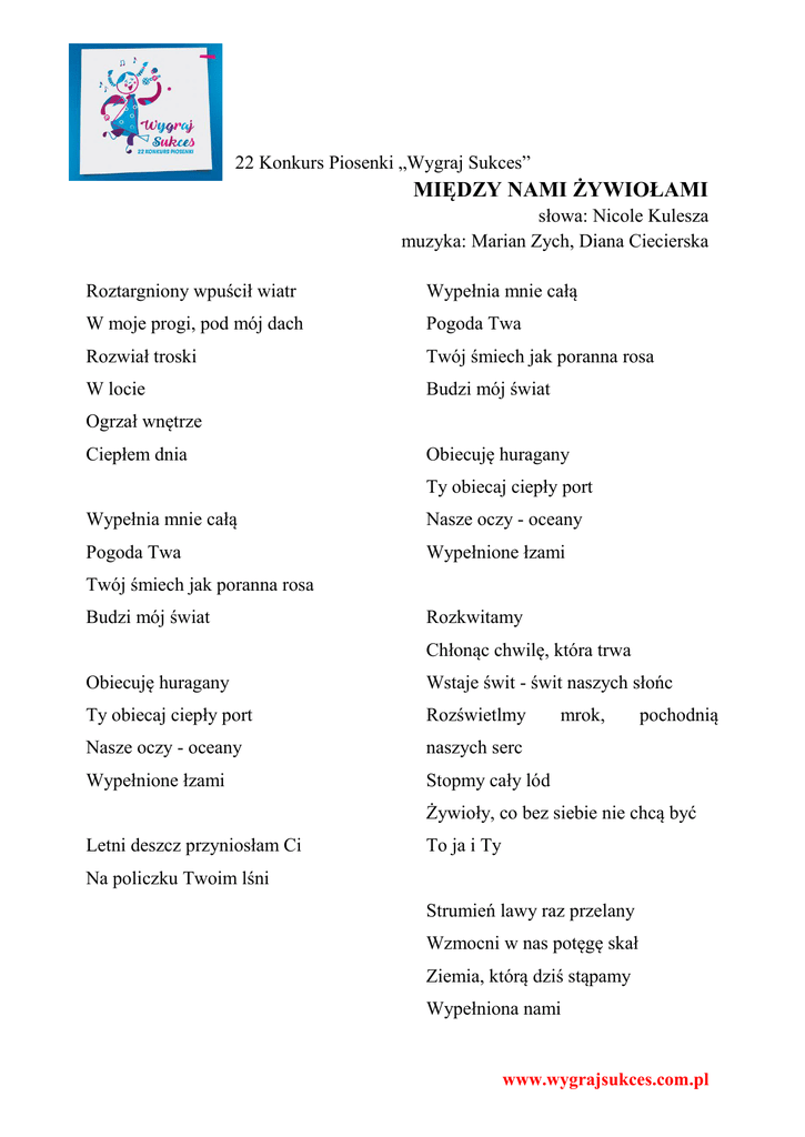 22 Konkurs Piosenki „Wygraj Sukces” MIĘDZY NAMI ŻYWIOŁAMI słowa: Nicole Kulesza muzyka: Marian Zych, Diana Ciecierska Roztargniony wpuścił wiatr Wypełnia mnie całą W moje progi, pod mój dach Pogoda Twa Rozwiał troski Twój śmiech jak poranna rosa W locie Budzi mój świat Ogrzał wnętrze Ciepłem dnia Obiecuję huragany Ty obiecaj ciepły port Wypełnia mnie całą Nasze oczy - oceany Pogoda Twa Wypełnione łzami Twój śmiech jak poranna rosa Budzi mój świat Rozkwitamy Chłonąc chwilę, która trwa Obiecuję huragany Wstaje świt - świt naszych słońc Ty obiecaj ciepły port Rozświetlmy Nasze oczy - oceany naszych serc Wypełnione łzami Stopmy cały lód mrok, pochodnią Żywioły, co bez siebie nie chcą być Letni deszcz przyniosłam Ci To ja i Ty Na policzku Twoim lśni Strumień lawy raz przelany Wzmocni w nas potęgę skał Ziemia, którą dziś stąpamy Wypełniona nami www.wygrajsukces.com.pl Obiecuję huragany Ty obiecaj ciepły port Nasze oczy - oceany Wypełnione łzami www.wygrajsukces.com.pl