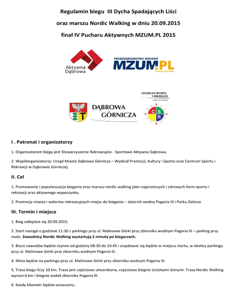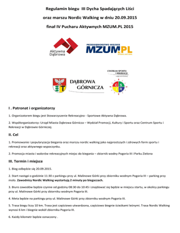 Regulamin biegu III Dycha Spadających Liści oraz marszu Nordic Walking w dniu 20.09.2015 finał IV Pucharu Aktywnych MZUM.PL 2015 I . Patronat i organizatorzy 1. Organizatorem biegu jest Stowarzyszenie Rekreacyjno - Sportowe Aktywna Dąbrowa. 2. Współorganizatorzy: Urząd Miasta Dąbrowa Górnicza – Wydział Promocji, Kultury i Sportu oraz Centrum Sportu i Rekreacji w Dąbrowie Górniczej. II. Cel 1. Promowanie i popularyzacja biegania oraz marszu nordic walking jako najprostszych i zdrowych form sportu i rekreacji oraz aktywnego wypoczynku. 2. Promocja miasta i walorów rekreacyjnych miejsc do biegania – zbiornik wodny Pogoria III i Parku Zielona III. Termin i miejsce 1. Bieg odbędzie się 20.09.2015. 2. Start nastąpi o godzinie 11:30 z parkingu przy ul. Malinowe Górki przy zbiorniku wodnym Pogoria III – parking przy molo. Zawodnicy Nordic Walking wystartują 2 minuty po biegaczach. 3. Biuro zawodów będzie czynne od godziny 08:30 do 10:45 i znajdowad się będzie w miejscu startu, w okolicy parkingu przy ul. Malinowe Górki przy zbiorniku wodnym Pogoria III. 4. Meta będzie na parkingu przy ul. Malinowe Górki przy zbiorniku wodnym Pogoria III. 5. Trasa biegu liczy 10 km. Trasa jest częściowo utwardzona, częściowo biegnie ścieżkami leśnymi. Trasa Nordic Walking wynosi 6 km i biegnie wokół zbiornika Pogoria III. 6. Każdy kilometr będzie oznaczony . 7. Zawodników obowiązuje limit czasu 1:15 minut w biegu oraz 1:15 w nordic walking. 8. Za kolumną zawodników będzie jechad obsługa zamykając stawkę zawodników. 9. Dodatkowo konkurencją będzie Bieg Skrzata. Dzieci będą startowały w dwóch grupach wiekowych 3-5 oraz 6-7 latków. Szczegóły startów zostaną podane w osobnym komunikacie. Dzieci można zgłaszad w dniu zawodów - limit uczestników 100 osób. IV. Uczestnictwo 1. Uczestnictwo w biegu jest otwarte dla każdej osoby która: - zgłosiła swój start i opłaci startowe oraz posiada aktualne badania lekarskie bądź podpisała formularz o zdolności do udziału w biegu na własną odpowiedzialnośd (dostępne będzie w biurze zawodów) 2. Każdy zawodnik musi zostad zweryfikowany w Biurze Zawodów. W trakcie weryfikacji zawodnicy muszą okazad dokument potwierdzający tożsamośd. Weryfikacja zawodników oraz wydawanie numerów startowych odbędzie się w Biurze Zawodów. 3. Każdy zawodnik musi posiadad numer startowy. Osoba bez numeru startowego nie będzie klasyfikowana. 4. Pomiar czasu będzie wykonywany za pomocą chipów. 5. Wpisowe wynosi: - przy rejestracji elektronicznej 30 zł dla biegu, 25 zł nordic walking, płatne do 14.09.2015 na konto Stowarzyszenia: 16 2030 0045 1110 0000 0394 7620 BGŻ SRS Aktywna Dąbrowa ul. Morcinka 16/91 Dąbrowa Górnicza w tytule prosimy podad: imię, nazwisko i dopisek „Dycha Spadających Liści” lub imię nazwisko marsz Nordic Walking, 20.09.2015” - w dniu zawodów 45 zł w Biurze Zawodów uczestnicy biegu , - zawodnicy nordic walking płacą w dniu zawodów 40 zł. 6. O wysokości startowego będzie decydowała data wpłynięcia na konto stowarzyszenia. Jeśli wpłynie ona później niż 14.09.2015 zawodnik jest zobowiązany do wyrównania różnicy w kwocie za opłatę startową. 7. Opłata raz wniesiona nie podlega zwrotowi. 8. Osoby niepełnoletnie muszą przedstawid zgodę rodziców na uczestnictwo w zawodach. O zakwalifikowaniu do uczestnictwa w zawodach będzie decydowała data urodzenia zawodników. 9. Pakiet startowy będzie zawierał: numer startowy, chip, kupon na poczęstunek. 10. Z opłaty startowej zwolnieni są zawodnicy z kategorii wiekowych 16-19 kobiet i mężczyzn w biegu, nordic walking oraz kategorie wiekowe K-50 i starsze, M-60 i starsi w biegu. Również zwalniamy z opłaty startowej Panie z pozostałych konkurencji, które ukooczą w dniu zawodów 50 lat i mężczyzn, którzy w dniu zawodów ukooczą 60 lat. 11. Zawodnik kooczący bieg otrzyma pamiątkowy medal. V. Zgłoszenie 1. Imienne zgłoszenia są przyjmowane poprzez wypełnienie formularza zgłoszeniowego na stronach www.aktywnadabrowa.pl . Zgłoszenia internetowe będą przyjmowane do dnia 14.09.2015. 2. Zgłoszenie w dniu zawodów w godzinach pracy Biura Zawodów od 8:30 do 10:45. VI. Klasyfikacja 1. Prowadzona będzie klasyfikacja w biegu: - generalna mężczyzn - generalna kobiet - w kategoriach wiekowych kobiet i mężczyzn KOBIETY: MĘŻCZYŹNI: K-16: 16-19 M-16: 16-19 K-20: 20-29 M-20: 20-29 K-30: 30-39 M-30: 30-39 K-40: 40-49 M-40: 40-49 K-50: 50 i starsze M-50: 50-59 M-60: 60 i starsi Kategorie wiekowe w biegu będą utworzone w momencie zarejestrowania się minimum 3 zawodników. 2. W Nordic Walking: - generalna mężczyzn - generalna kobiet - w kategoriach wiekowych kobiet i mężczyzn KOBIETY: MĘŻCZYŹNI: K-16:16-19 M-16: 16-19 K-20: 20-29 M-20: 20-29 K-30: 30-45 M-30: 30-45 K-40: 46 i starsze M-40: 46 i starsi Kategorie wiekowe w nordic walking zostaną utworzone w momencie zarejestrowaniu się minimum 4 zawodników. VII. Nagrody 1. Nagrody przyznawane są: - I-III kat. OPEN puchary, - I-III kat. wiek. statuetki, Nagrody nie mogą się dublowad, zawodnicy w kat. OPEN nie będą dekorowani w poszczególnych kategoriach wiekowych. 2. Wśród wszystkich uczestników, którzy ukooczą bieg zostaną rozlosowane nagrody – jednak są one uzależnione od hojności sponsorów. VIII. Postanowienia koocowe 1. Organizator zastrzega sobie prawo do zmian w regulaminie, o których zobowiązuje się poinformowad uczestników zawodów przed rozpoczęciem zawodów. Zmiany zostaną opublikowane na stronie stowarzyszenia. Ostateczny regulamin wywieszony będzie w Biurze Zawodów. Ostateczna interpretacja regulaminu należy do Biura Zawodów, a sprawy nie ujęte w regulaminie będą rozstrzygane przez Organizatora 2. Wyniki koocowe będą ogłoszone na stronie internetowej www.aktywnadabrowa.pl. 3. Zawody odbędą się bez względu na warunki atmosferyczne. 5. Organizator zastrzega sobie prawo do zmiany terminu zawodów. 