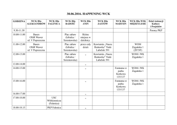 30.06.2016. HAPPENING WCK GODZINA WCK filia ALEKSANDRÓW WCK filia FALENICA WCK filia RADOŚĆ WCK filia ANIN WCK filia ZASTÓW WCK filia MARYSIN WCK filia WSK MIĘDZYLESIE 9.30-11.30 Dział Animacji Kultury i Projektów Perony PKP 10.00-11.00 Basen OSiR Wawer ul. V Poprzeczna Plac zabaw (Izbicka / Szreniawska) Różne miejsca w dzielnicy 11.00-12.00 Basen OSiR Wawer ul. V Poprzeczna Plac zabaw (Izbicka / Szreniawska) przez cały dzień Kawiarnia „Nasza Huśtawka” Trakt Lubelski 391 WOM Żegańska 1 (20'/30') Plac zabaw (Izbicka / Szreniawska) „ Kawiarnia „Nasza Huśtawka” Trakt Lubelski 391 WOM i WK Żegańska 1 12.00-13.00 13.00-14.00 „ 14.00-15.00 „ Fontanna w parku Korkowa 135/137 WOM i WK Żegańska 1 15.00-16.00 „ Fontanna w parku Korkowa 135/137 WOM i WK Żegańska 1 16.00-17.00 „ 17.00-18.00 USC Włókiennicza (Falenica) „ 18.00-18.15 PKP Falenica „ OPIS DZIAŁAŃ DZIAŁ ANIMACJI KULTURY I PROJEKTÓW Czytanie książek na leżakach na peronach PKP ALEKSANDRÓW Basen w Aninie, zabawy ze zwierzętami z „Ogrodu zwierząt” FALENICA 1. EKO WARSZTATY PLASTYCZNE dla dzieci - instalacja na ogrodzeniu z wykorzystaniem starych banerów, prowadzenie Edyta Bystroń, godz. 17.00-18.00, ogrodzenie Urzędu Dzielnicy Wawer, ul. Bysławska/Włókiennicza, Falenica 2. KONCERT PERONOWY - "Piosenki z Teatru", na stacji PKP Falenica, peron I, przy wejściu do Kinokawiarni, godz. 18.00 (czas trwania ok. 15 min.), przygotowanie Szczepan Szczykno. RADOŚĆ - warsztaty malarskie ,, Mój Wawer'' malowanie farbami na białym płótnie- praca zespołowa Prowadzi Urszula Marciniak - malowanie buziek, prowadzi wolontariuszka Ola Osiak - warsztaty muzyczno- rytmiczne ,,Orkiestra podwórkowa''wykorzystanie instrumentów: grzechotki, talerze, bębenki, kołatki, trójkąty prowadzi Jerzy Ostrowski - warsztaty plastyczne ,, Letnia łąka'' z wykorzystanie szklanych kuleczek moczonych w różnych kolorach farb, a następnie twarzy się kolorowa piękna łąka Prowadzi Elżbieta Osiak Zabawy ruchowe z wykorzystaniem chusty Clanzy, obręczy, liny, itp ZASTÓW „Tęczowe animacje” Działania Animatorów Filii Zastów: 1. Teatrzyk z drewnianego okienka Kamishibai- „Mój przyjaciel Kemushi” 2. Animacje z chustą Klanza 3. Pokaz dużych i małych baniek mydlanych 4. Warsztaty plastyczne „Kolorowe uliczki”- technika wycinanka ANIN Animatorzy będą krążyli po dzielnicy przez cały dzień MARYSIN 14.00 – baśniowy orszak wyrusza z klubu na osiedle pod fontannę. 14.15 – uczestnicy happeningu przychodzą pod fontannę 14.30 – rozpoczynamy słuchowisko – „Kopciuszek” – bajką muzyczna 14.45 – po wysłuchaniu bajki – konkursy i zabawy dla dzieci: - oddziel „groch” od „maku” - zgadywanki - rymowanki - puszczanie baniek mydlanych - mini koncert M. Drausa na keyboardzie - malowanie bajkowych postaci - układanie puzzli - muzyczna gimnastyka 16.00 – zakończenie MIĘDZYLESIE 11.00-11.30 – Jacek Kawa (gitara) 12.00-12.15 – Występ grupy tanecznej Shock Dance w Wydziale Komunikacji UD Wawer 12.20-12.35 – Występ grupy tanecznej Shock Dance w Wydziale Obsługi Mieszkańców UD Wawer 14.00-16.00 – Malowanie obrazu przez Magdę Magrzyk w WOM lub przed Urzędem Dzielnicy (w zależności od pogody)