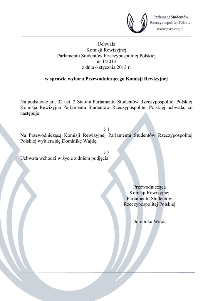 Uchwała Komisji Rewizyjnej Parlamentu Studentów Rzeczypospolitej Polskiej nr 1/2013 z dnia 6 stycznia 2013 r. w sprawie wyboru Przewodniczącego Komisji Rewizyjnej Na podstawie art. 32 ust. 2 Statutu Parlamentu Studentów Rzeczypospolitej Polskiej Komisja Rewizyjna Parlamentu Studentów Rzeczypospolitej Polskiej uchwala, co następuje: §1 Na Przewodniczącą Komisji Rewizyjnej Parlamentu Studentów Rzeczypospolitej Polskiej wybiera się Dominikę Wajdę. §2 Uchwała wchodzi w życie z dniem podjęcia. Przewodnicząca Komisji Rewizyjnej Parlamentu Studentów Rzeczypospolitej Polskiej Dominika Wajda