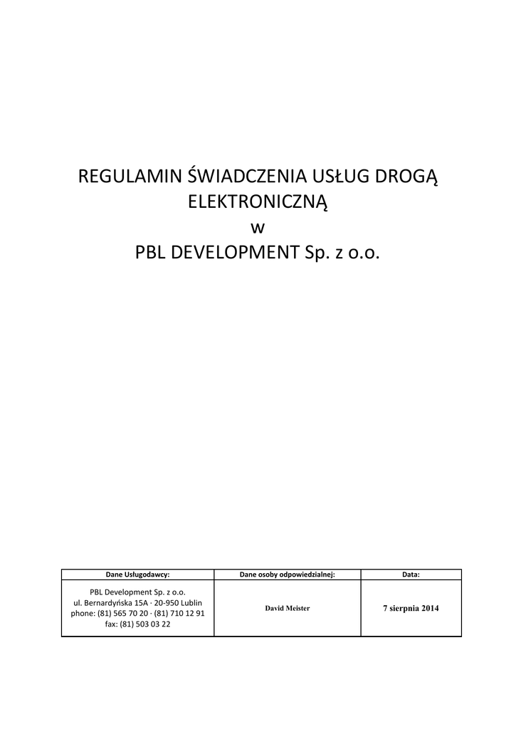 REGULAMIN ŚWIADCZENIA USŁUG DROGĄ ELEKTRONICZNĄ w PBL DEVELOPMENT Sp. z o.o. Dane Usługodawcy: Dane osoby odpowiedzialnej: Data: PBL Development Sp. z o.o. ul. Bernardyńska 15A · 20-950 Lublin phone: (81) 565 70 20 · (81) 710 12 91 fax: (81) 503 03 22 David Meister 7 sierpnia 2014 WSTĘP Realizując postanowienia Ustawy z dnia 18 lipca 2002r. o świadczeniu usług drogą elektroniczną (Dz. U. z 2013 r., poz. 1422) PBL DEVELOPMENT Sp. z o.o. wprowadza niniejszy Regulamin określający w szczególności rodzaje i zakres świadczonych usług droga elektroniczną, warunki świadczenia tych usług, w tym wymagania techniczne oraz zakazy dostarczania treści bezprawnych, politykę prywatności, warunki zawierania i rozwiązywania umów o świadczenie usług droga elektroniczną, warunki przesyłania informacji handlowej oraz tryb postępowania reklamacyjnego. Rozdział 1 Postanowienia ogólne 1. Definicje pojęć użytych w Regulaminie: a. Ustawa - Ustawa o świadczeniu usług drogą elektroniczną z dnia 18 lipca 2002 r. (Dz. U. z 2013 r., poz. 1422), b. System teleinformatyczny - zespół współpracujących ze sobą urządzeń informatycznych i oprogramowania, zapewniający przetwarzanie i przechowywanie, a także wysyłanie i odbieranie danych poprzez sieci telekomunikacyjne za pomocą właściwego dla danego rodzaju sieci urządzenia końcowego w rozumieniu prawa telekomunikacyjnego, c. Usługi świadczone drogą elektroniczną - wykonanie usługi, które następuje przez wysyłanie i odbieranie danych za pomocą systemów teleinformatycznych, na indywidualne żądanie Usługobiorcy, bez jednoczesnej obecności stron, przy czym dane te są transmitowane za pośrednictwem sieci publicznych w rozumieniu prawa telekomunikacyjnego, d. Środki komunikacji elektronicznej - rozwiązania techniczne, w tym urządzenia teleinformatyczne i współpracujące z nimi narzędzia programowe, umożliwiające indywidualne porozumiewanie się na odległość przy wykorzystaniu transmisji danych między systemami teleinformatycznymi, a w szczególności pocztę elektroniczną, e. Usługodawca - PBL DEVELOPMENT Sp. z o.o. f. Usługobiorca - podmiot korzystający z usług Usługodawcy, który jest stroną umowy o świadczeniu usług będący osobą fizyczną, osobą prawną albo jednostką organizacyjną nie posiadającą osobowości prawnej, który zobowiąże się do przestrzegania niniejszego regulaminu. Usługobiorcą jest również podmiot, który zamówi świadczenie określonych usług drogą elektroniczną na zasadach poniżej określonych. g. Specyfikacja techniczna - zbiór informacji o systemie teleinformatycznym Usługodawcy oraz wymaganiach technicznych niezbędnych do współpracy z tym systemem. 2. Wyrażenie zgody na przestrzeganie niniejszego Regulaminu przy uruchamianiu usługi, przy użyciu strony WWW lub złożenie zamówienia drogą poczty elektronicznej jest równoznaczne z pełną akceptacją warunków regulaminu bez konieczności sporządzenia odrębnej umowy. Rozdział 2 Rodzaje i zakres świadczonych usług drogą elektroniczną 1. Usługodawca świadczy usługi drogą elektroniczną, a w szczególności: a. formularz Rekrutacja b. formularz Kontakt 2. Usługodawca świadczy również usługi na podstawie odrębnych umów, których przedmiotem jest świadczenie usług drogą elektroniczną. REGULAMIN ŚWIADCZENIA USŁUG DROGĄ ELEKTRONICZNĄ w PBL DEVELOPMENT Sp. z o.o. 2 Rozdział 3 Warunki świadczenia usług drogą elektroniczną. 1. Usługodawca świadczy usługi na rzecz Usługobiorcy w zakresie i na warunkach określonych w niniejszym regulaminie lub indywidualnej ofercie, jeśli taka została złożona i przyjęta przez Usługobiorcę. 2. Usługobiorca zobowiązuje się do przestrzegania niniejszego regulaminu. 3. Usługobiorca zobowiązany jest do przestrzegania zakazu nadużywania środków komunikacji elektronicznej oraz nie dostarczania przez lub do systemów teleinformatycznych Usługodawcy następujących treści: a. Powodujących zachwianie pracy lub przeciążenie systemów teleinformatycznych Usługodawcy lub innych podmiotów biorących bezpośredni lub pośredni udział w świadczeniu usług drogą elektroniczną, b. Naruszają dobra osób trzecich, ogólnie przyjęte normy społeczne lub są niezgodne z powszechnie obowiązującymi przepisami prawa. 4. Usługodawca zastrzega sobie prawo do prowadzenia prac konserwacyjnych systemu teleinformatycznego, mogących powodować utrudnienia lub uniemożliwienie Usługobiorcom korzystania z usług. Terminy prac i przewidywany czas ich trwania będzie publikowany na stronie WWW przed rozpoczęciem prac. 5. W przypadkach szczególnych mających wpływ na bezpieczeństwo lub stabilność systemu teleinformatycznego, Usługodawca ma prawo do czasowego zaprzestania lub ograniczenia świadczenia usług, bez wcześniejszego powiadomienia i przeprowadzenia prac konserwacyjnych mających na celu przywrócenie bezpieczeństwa i stabilności systemu teleinformatycznego. 6. Usługodawca zapewnia Usługobiorcom tajemnicę komunikacji zwaną "tajemnicą telekomunikacyjną", która obejmuje informacje przekazywane w publicznej sieci Internet, dane dotyczące i wprowadzone przez Usługobiorców tylko w obrębie systemu teleinformatycznego Usługodawcy i tylko w przypadku, w którym informacje objęte "tajemnicą telekomunikacyjną" nie są jawne z zasady lub ich ujawnienie nie jest niezbędne dla prawidłowego świadczenia usługi, której dotyczą. Informacje objęte "tajemnicą telekomunikacyjną" mogą zostać ujawnione jedynie w przypadkach określonych umową lub w przepisach prawa. 7. Informacje objęte "tajemnicą telekomunikacyjną" mogą być przetwarzane przez Usługodawcę tylko wówczas, gdy przetwarzanie ich jest przedmiotem usługi świadczonej Usługobiorcom, jest niezbędne do jej prawidłowego wykonania lub nadzoru nad prawidłowym działaniem systemu teleinformatycznego Usługodawcy. 8. Dostęp do informacji, o zm