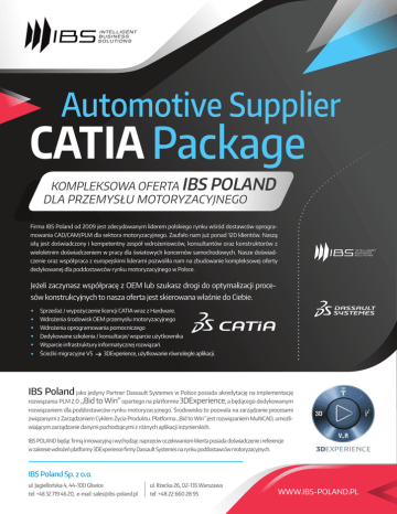 Automotive Supplier CATIA Package KOMPLEKSOWA OFERTA IBS POLAND DLA PRZEMYSŁU MOTORYZACYJNEGO Firma IBS Poland od 2009 jest zdecydowanym liderem polskiego rynku wśród dostawców oprogramowania CAD/CAM/PLM dla sektora motoryzacyjnego. Zaufało nam już ponad 120 klientów. Naszą siłą jest doświadczony i kompetentny zespół wdrożeniowców, konsultantów oraz konstruktorów z wieloletnim doświadczeniem w pracy dla światowych koncernów samochodowych. Nasze doświadczenie oraz współpraca z europejskimi liderami pozwoliła nam na zbudowanie kompleksowej oferty dedykowanej dla poddostawców rynku motoryzacyjnego w Polsce. Jeżeli zaczynasz współpracę z OEM lub szukasz drogi do optymalizacji procesów konstrukcyjnych to nasza oferta jest skierowana właśnie do Ciebie. Sprzedaż / wypożyczenie licencji CATIA wraz z Hardware. Wdrożenia środowisk OEM przemysłu motoryzacyjnego Wdrożenia oprogramowania pomocniczego Dedykowane szkolenia / konsultacje/ wsparcie użytkownika Wsparcie infrastruktury informatycznej rozwiązań. Ścieżki migracyjne V5 3DExperience, użytkowanie równoległe aplikacji. IBS Poland jako jedyny Partner Dassault Systemes w Polsce posiada akredytację na implementację rozwiązania PLM 2.0 „Bid to Win” opartego na platformie 3DExperience, a będącego dedykowanym rozwiązaniem dla poddostawców rynku motoryzacyjnego. Środowisko to pozwala na zarządzanie procesami związanymi z Zarządzaniem Cyklem Życia Produktu. Platforma „Bid to Win” jest rozwiązaniem MultiCAD, umożliwiającym zarządzanie danymi pochodzącymi z różnych aplikacji inżynierskich. IBS POLAND będąc firmą innowacyjną i wychodząc naprzeciw oczekiwaniom klienta posiada doświadczenie i referencje w zakresie wdrożeń platformy 3DExperience firmy Dassault Systemes na rynku poddostawców motoryzacyjnych. IBS Poland Sp. z o.o. ul. Jagiellońska 4, 44-100 Gliwice ul. Iłżecka 26, 02-135 Warszawa tel: +48 32 719 46 20, e-mail: [email protected] tel: +48 22 660 28 95 WWW.IBS-POLAND.PL