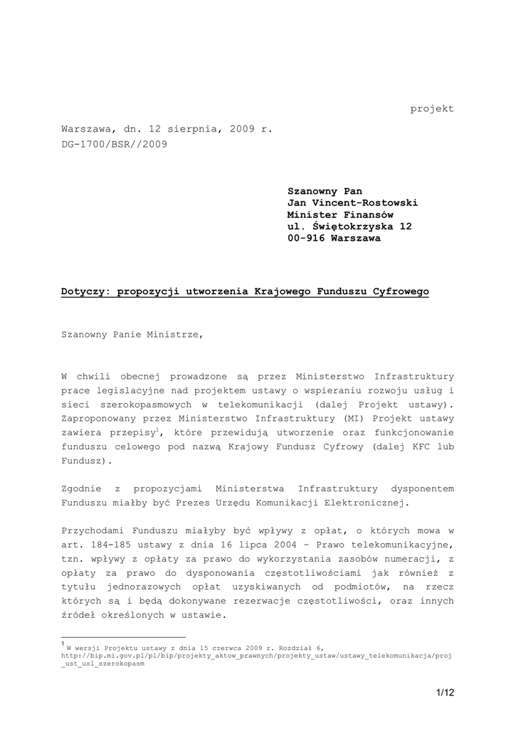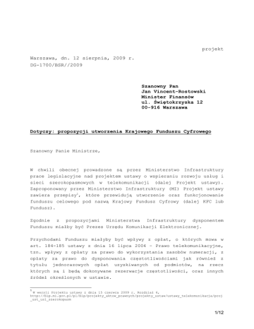 projekt Warszawa, dn. 12 sierpnia, 2009 r. DG-1700/BSR//2009 Szanowny Pan Jan Vincent-Rostowski Minister Finansów ul. Świętokrzyska 12 00-916 Warszawa Dotyczy: propozycji utworzenia Krajowego Funduszu Cyfrowego Szanowny Panie Ministrze, W chwili obecnej prowadzone są przez Ministerstwo Infrastruktury prace legislacyjne nad projektem ustawy o wspieraniu rozwoju usług i sieci szerokopasmowych w telekomunikacji (dalej Projekt ustawy). Zaproponowany przez Ministerstwo Infrastruktury (MI) Projekt ustawy zawiera przepisy1, które przewidują utworzenie oraz funkcjonowanie funduszu celowego pod nazwą Krajowy Fundusz Cyfrowy (dalej KFC lub Fundusz). Zgodnie z propozycjami Ministerstwa Infrastruktury dysponentem Funduszu miałby być Prezes Urzędu Komunikacji Elektronicznej. Przychodami Funduszu miałyby być wpływy z opłat, o których mowa w art. 184-185 ustawy z dnia 16 lipca 2004 – Prawo telekomunikacyjne, tzn. wpływy z opłaty za prawo do wykorzystania zasobów numeracji, z opłaty za prawo do dysponowania częstotliwościami jak również z tytułu jednorazowych opłat uzyskiwanych od podmiotów, na rzecz których są i będą dokonywane rezerwacje częstotliwości, oraz innych źródeł określonych w ustawie. 1 W wersji Projektu ustawy z dnia 15 czerwca 2009 r. Rozdział 6, http://bip.mi.gov.pl/pl/bip/projekty_aktow_prawnych/projekty_ustaw/ustawy_telekomunikacja/proj _ust_usl_szerokopasm 1/12 2/12 Zadaniami Funduszu, zgodnie z Projektem ustawy, maja być: - finansowanie zadań wynikających telekomunikacyjnej państwa; - finansowanie zadań informacyjnego; - zapewnienie wsparcia dla społeczeństwa przy zakupie urządzeń konsumenckich służących do odbioru cyfrowych transmisji radiofonicznych i telewizyjnych; - współfinansowanie kampanii informacyjnej przechodzenia z nadawania analogowego na cyfrowe. związanych z z realizacji rozwojem polityki społeczeństwa dotyczącej W związku z powyższym chcielibyśmy zwrócić uwagę Pana Ministra na zasadnicze braki oraz negatywne konsekwencje zaproponowanego przez Ministerstwo Infrastruktury rozwiązania, w wyniku którego znaczne środki pieniężne zostaną przesunięte z budżetu państwa do Funduszu w większości na realizację bliżej nieokreślonych (przynajmniej na dzień dzisiejszy) zadań. Gdyby za podstawę obliczeń środków gromadzonych w Funduszu przyjąć wpływy z opłat, o których mowa w art. 184-185 Pt za 2008 r., to budżet Funduszu wynosiłby co najmniej 736 mln zł rocznie2!!!. Tymczasem jedynym precyzyjnie określonym zadaniem, którego koszty zostały przez MI oszacowane, jest ewentualne (jego konieczność nie została bowiem jeszcze przesądzona) wsparcie społeczeństwa przy zakupie urządzeń do odbioru naziemnej telewizji cyfrowej. Koszty takiej ewentualnej pomocy zostały oszacowane na kwotę od 337, 5 mln do 475 mln, w zależności od przyjętego kryterium. Według naszej wiedzy brak jest także na dzień dzisiejszy szczegółowych programów określających zasady wydatkowania środków z Funduszu. Dlatego rezerwowanie tak ogromnych środków pieniężnych w Funduszu jest przejawem nieracjonalnej gospodarki środkami publicznymi i jest niedopuszczalne w obecnej sytuacji budżetowej. Koncepcja utworzenia Funduszu nie tylko nie została należycie uzasadniona przez projektodawcę, ale również przewidziana interwencja państwa nie jest proporcjonalna, budzi poważne wątpliwości co do zgodności ze wspólnotowymi przepisami prawa odnoszącymi się do pomocy publicznej oraz może prowadzić do zakłócenia konkurencji. 2 Żródło: http://www.uke.gov.pl/_gAllery/16/60/16607/Sprawozdanie_UKE_2008.pdf, uwzględnione wpływy z opłat koncesyjnych oraz opłaty telekomunikacyjnej nie zostały 3/12 Pragniemy zwrócić uwagę, iż każda forma pomocy publicznej powinna być zgodna z odpowiednimi przepisami wspólnotowymi. Komisja Europejska powinna być poinformowana o wszelkich planach przyznania pomocy. W przedmiotowym przypadku, według naszej wiedzy, brak jest odpowiedniego programu pomocy, a KE nie została poinformowana o takich planach pomocy państwowej. Nie jest nam także wiadome, żeby planowana pomoc została zaopiniowana przez Prezesa UOKiK. Należy pamiętać, iż jeśli Komisja stwierdzi, że pomoc przyznana przez Państwo lub przy użyciu zasobów państwowych nie jest zgodna ze wspólnym rynkiem w rozumieniu art. 87, lub że pomoc ta jest nadużywana, może ona podjąć decyzję o zniesieniu lub zmianie tej pomocy przez dane Państwo. Dlatego, w naszej ocenie, wprowadzanie jakichkolwiek środków, bez uzyskania uprzedniej opinii Komisji Europejskiej, jest stanowczo przedwczesne. Nie jest także niczym uzasadnione, by główny ciężar przechodzenia z nadawania analogowego na cyfrowe został przeniesiony na przedsiębiorców telekomunikacyjnych. Zgodnie z koncepcją MI zadania Funduszu będą realizowane z wpływów z opłat pochodzących w zdecydowanej większości od tych przedsiębiorców. W związku z powyższym zwracamy się z prośbą o uważną analizę przez Ministerstwo Finansów racjonalności utworzenia, proponowanych zasad funkcjonowania oraz zasadności wysokości finansowania funduszu celowego – Krajowego Funduszu Cyfrowego, którego powołanie i przewiduje projekt ustawy o wspieraniu rozwoju usług i sieci szerokopasmowych w telekomunikacji. W naszej ocenie istnieje poważne ryzyko, że proponowany model funkcjonowania Funduszu będzie prowadzić do nieracjonalnego gospodarowania środkami publicznymi. Uwagi szczegółowe Jedynym precyzyjnie wskazanym w Projekcie ustawy oraz oszacowanym pod względem kosztowym zadaniem, które ma w dodatku stanowić podstawowe uzasadnienie powołania Funduszu, ma być zapewnienie wsparcia dla społeczeństwa przy zakupie urządzeń konsumenckich służących do odbioru cyfrowych transmisji radiofonicznych i telewizyjnych. W ocenie Ministerstwa Infrastruktury zawartej w uzasadnieniu do Projektu ustawy, w zależności od przebiegu cyfryzacj