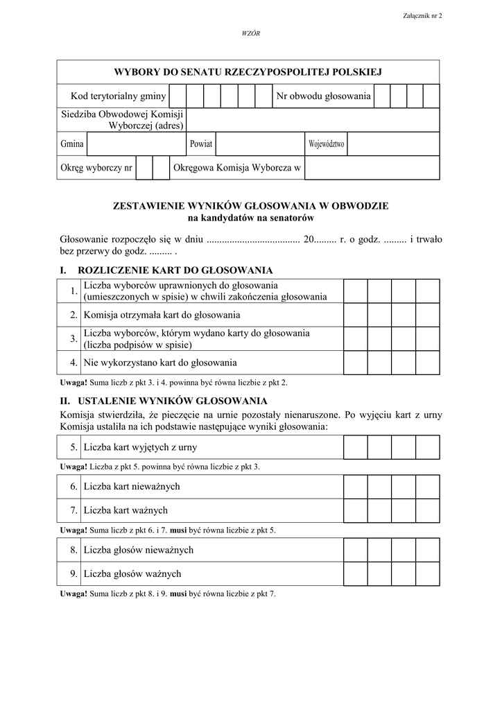 Załącznik nr 2 WZÓR WYBORY DO SENATU RZECZYPOSPOLITEJ POLSKIEJ Kod terytorialny gminy Nr obwodu głosowania Siedziba Obwodowej Komisji Wyborczej (adres) Gmina Powiat Okręg wyborczy nr Województwo Okręgowa Komisja Wyborcza w ZESTAWIENIE WYNIKÓW GŁOSOWANIA W OBWODZIE na kandydatów na senatorów Głosowanie rozpoczęło się w dniu ..................................... 20......... r. o godz. ......... i trwało bez przerwy do godz. ......... . I. ROZLICZENIE KART DO GŁOSOWANIA Liczba wyborców uprawnionych do głosowania 1. (umieszczonych w spisie) w chwili zakończenia głosowania 2. Komisja otrzymała kart do głosowania 3. Liczba wyborców, którym wydano karty do głosowania (liczba podpisów w spisie) 4. Nie wykorzystano kart do głosowania Uwaga! Suma liczb z pkt 3. i 4. powinna być równa liczbie z pkt 2. II. USTALENIE WYNIKÓW GŁOSOWANIA Komisja stwierdziła, że pieczęcie na urnie pozostały nienaruszone. Po wyjęciu kart z urny Komisja ustaliła na ich podstawie następujące wyniki głosowania: 5. Liczba kart wyjętych z urny Uwaga! Liczba z pkt 5. powinna być równa liczbie z pkt 3. 6. Liczba kart nieważnych 7. Liczba kart ważnych Uwaga! Suma liczb z pkt 6. i 7. musi być równa liczbie z pkt 5. 8. Liczba głosów nieważnych 9. Liczba głosów ważnych Uwaga! Suma liczb z pkt 8. i 9. musi być równa liczbie z pkt 7. — — 10. Poszczególni kandydaci otrzymali następujące liczby głosów ważnych: 1. 2. 3. 4. 5. 6. 7. 8. 9. 10. 11. 12. 13. 14. 15. 16. 17. 18. 19. 20. Razem Uwaga! Suma głosów oddanych na wszystkich kandydatów (rubryka „Razem”) nie może być większa od liczby z pkt 9. pomnożonej przez liczbę senatorów wybieranych w okręgu wyborczym. Suma ta nie może być mniejsza od liczby z pkt 9. Liczba głosów uzyskanych przez któregokolwiek z kandydatów nie może być większa niż liczba z pkt 9. — — Przy sporządzeniu zestawienia obecni byli członkowie Komisji: 1) .................................................................................... (nazwisko i imię — imiona, funkcja w Komisji) ................................................... (podpis) 2) .................................................................................... ................................................... 3) .................................................................................... ................................................... 4) .................................................................................... ................................................... 5) .................................................................................... ................................................... 6) .................................................................................... ................................................... 7) .................................................................................... ................................................... 8) .................................................................................... ................................................... 9) .................................................................................... ................................................... 10) .................................................................................... ................................................... 11) .................................................................................... ................................................... (pieczęć Komisji)