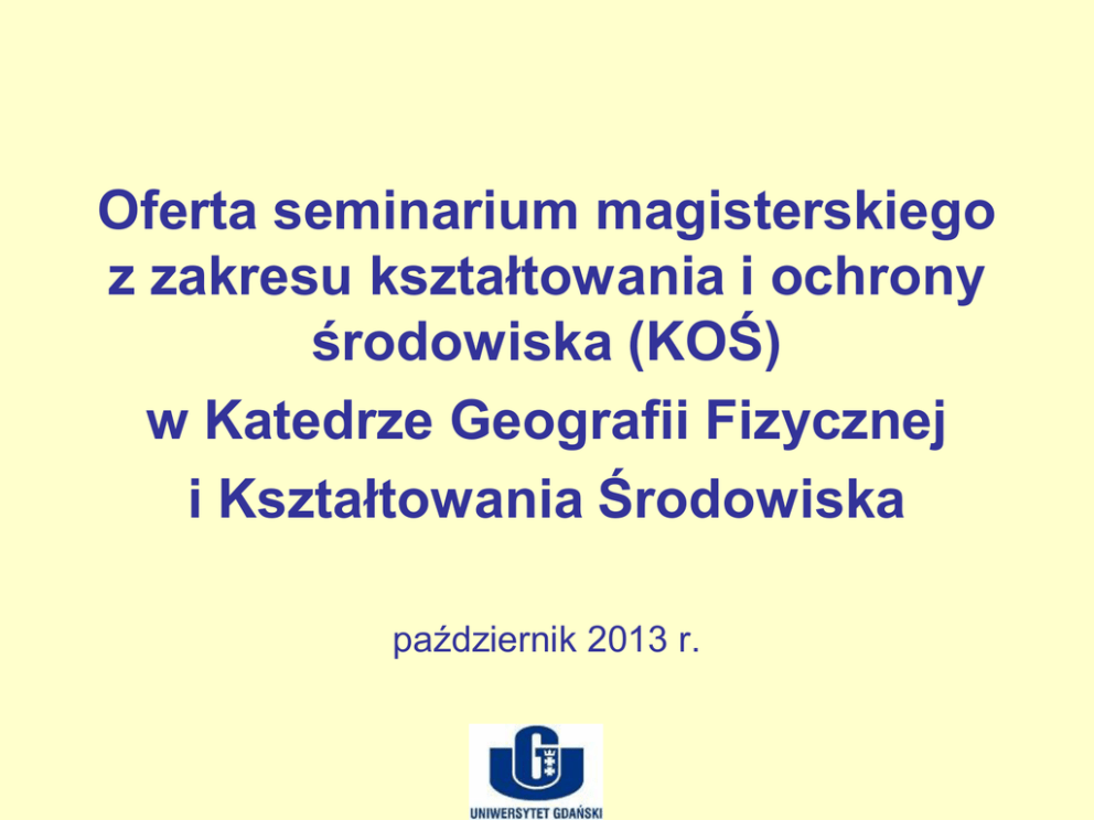 Oferta seminarium magisterskiego z zakresu kształtowania i ochrony środowiska (KOŚ) w Katedrze Geografii Fizycznej i Kształtowania Środowiska październik 2013 r. Katedra Geografii Fizycznej i Kształtowania Środowiska Kierownik Katedry: Prof. UG dr hab. Mariusz Kistowski Profesorowie nadzwyczajni: Prof. UG dr hab. Henryk Andrzej Rachocki, Prof. UG dr hab. Mariusz Kistowski, Pracownicy dydaktyczni: dr Jarosław Czochański, dr Wojciech Staszek, dr Paweł Wiśniewski, mgr Barbara Korwel-Lejkowska, mgr Alicja Kopeć, mgr Bartosz Pępek. http://www.kgfiks.oig.ug.edu.pl Zapisy na specjalizację: mgr Robert Lejkowski pok. B-115 - Składnica map codziennie w godz. 9.00 14.00 Tematyka badań Katedry: • Przyrodnicze podstawy gospodarki przestrzennej; • Ochrona przyrody / ochrona środowiska; • Kształtowanie przestrzeni zurbanizowanych, rekreacyjnych, chronionych; • Przyrodnicze uwarunkowania rozwoju zrównoważonego; • Teoria i praktyka ocen oddziaływania na środowisko przyrodnicze (w szczególności tzw. "strategicznych"); • Kompleksowe (geoekologiczne) badania środowiska przyrodniczego; • Teoria i praktyka kształtowania środowiska; • Relacje człowiek – środowisko oraz zagrożenia i stan środowiska; • Badania krajobrazowe (ekologia krajobrazu); • Zastosowanie systemów informacji geograficznej (GIS) w badaniach i ochronie środowiska; • Monitoring rozwoju regionalnego; • Kompleksowe oceny środowiskowe Szanujemy i lubimy pomysły własne studentów Preferujemy prace z wykorzystaniem GIS Support dla magistrantów: Opiekun prac magisterskich w roku 2013 – dla kierunku Geografia: dr Jarosław Czochański – zagadnienia ochrony przyrody, kształtowanie i ochrona środowiska, oddziaływania antropogeniczne na środowisko – w tym tereny ochrony prawnej, zagadnienia GIS, użytkowanie turystyczne; Pomoc merytoryczna przy realizacji prac: Prof. UG dr hab. Henryk Andrzej Rachocki - zagadnienia metodologiczne, zagadnienia geomorfologiczne; dr Wojciech Staszek – oceny oddziaływań na środowisko, gospodarka przestrzenna, zagadnienia GIS, ekologia krajobrazu (geoekologia); Dr Paweł Wiśniewski – ochrona środowiska, ochrona gleb, melioracje przeciwerozyjne i fitomelioracje, gospodarka odpadami, planowanie ochrony środowiska, gospodarka wodna, rewitalizacja dróg wodnych; mgr Barbara Korwel-Lejkowska – kształtowanie przestrzeni przyrodniczej, rozwój miast i oddziaływania na środowisko, zagadnienia GIS; mgr Bartosz Pępek – zagadnienia technologii GIS PRZEDMIOTY OKOŁOSEMINARYJNE PROWADZONE PRZEZ PRACOWNIKÓW KATEDRY • Przyrodnicze podstawy planowania przestrzennego, • Oceny oddziaływania na środowisko, • Zastosowanie GIS w geografii fizycznej i ochronie środowiska, • Ochrona przyrody i krajobrazu, • Monitoring środowiska, • Zasady polityki ekologicznej i ekorozwoju. OGÓLNA PROBLEMATYKA PRAC MAGISTERSKICH REALIZOWANYCH NA SEMINARIUM • Zastosowanie metod ekologii krajobrazu (geoekologii) w badaniach struktury i dynamiki środowiska. • Przyrodnicze uwarunkowania działalności człowieka w środowisku (np. osadniczej, turystycznej, przemysłowej). • Oceny wpływu na środowisko działalności człowieka prowadzonej na szczeblu regionalnym i lokalnym. • Analiza wizualno-estetycznych wartości i zagrożeń krajobrazu dla potrzeb jego ochrony. • Ocena dokumentów z zakresu polityki ekologicznej i ich spójności z innymi dokumentami dotyczącymi rozwoju regionów. • Delimitacja sieci ekologicznych. OGÓLNA PROBLEMATYKA PRAC MAGISTERSKICH REALIZOWANYCH NA SEMINARIUM • • • • Charakterystyki i dokumentacje ekofizjograficzne gmin. Charakterystyki i projekty obszarów prawnie chronionych. Oceny potencjalnych lokalizacji inwestycji. Wpływ zagospodarowania turystycznego wybranych obszarów na środowisko. • Kształtowanie, ochrona i ocena walor krajobrazowych. • Konflikty przestrzenne i funkcjonalne. PRZYKŁADOWE TEMATY PRAC MAGISTERSKICH ZREALIZOWANYCH NA SEMINARIUM Z KOŚ W ROKU AKADEMICKIM 2012/2013 • Stan i perspektywy rozwoju zagospodarowania turystycznego Łeby i okolic w świetle uwarunkowań środowiskowych. • Wpływ zanieczyszczeń powietrza aglomeracji gdańskiej na wybrane elementy środowiska miejskiego. • Przyrodnicze i społeczne uwarunkowania lokalizacji planowanej elektrowni jądrowej w północnej części województwa pomorskiego. • Analiza i ocena środowiska przyrodniczego gminy Giżycko dla celów turystyki. • Wpływ zagospodarowania i ruchu turystycznego na środowisko przyrodnicze strefy przybrzeżnej jeziora Kalwa. • Kolizje i konflikty przestrzenne jako skutek planowanej lokalizacji farm wiatrowych w gminie Pasłęk. • Antropogeniczne zmiany wybranych elementów środowiska przyrodniczego południowej części aglomeracji gdańskiej • Próba regionalizacji fizycznogeograficznej Pomorza Gdańskiego na tle dotychczasowych podziałów regionu PRZYKŁADOWE TEMATY PRAC MAGISTERSKICH ZREALIZOWANYCH NA SEMINARIUM Z KOŚ W ROKU AKADEMICKIM 2011/2012 • Geneza i proces tworzenia Rezerwatu Biosfery „Bory Tucholskie” • Koncepcja optymalnego systemu zieleni miejskiej Gdańska • Mała retencja jako metoda ochrony i kształtowania zespołów wodnych w zlewniach centralnej części województwa pomorskiego • Rozwój przestrzenny Gardei w latach 1900-2010 w świetle uwarunkowań geograficzno-historycznych • Zmiany modelu funkcjonowania parków krajobrazowych w Polsce w latach 2008-2010 • Uwarunkowania i kierunki rekreacyjnego użytkowania gmin południowo-wschodniej części Pojezierza Kaszubskiego • Zmiany w środowisku przyrodniczym Mierzei Wiślanej jako efekt kolizji i konfliktów funkcjonalnych • Ocena potencjału krajobrazowo-turystycznego rzeki Raduni • Środowiskowe uwarunkowania rozwoju turystyki na Mierzei Wiślanej • Spływy z dróg szybkiego ruchu jako źródło antropopresji na przykładzie obwodnicy Trójmiasta • Modele turystyki w wybranych parkach krajobr