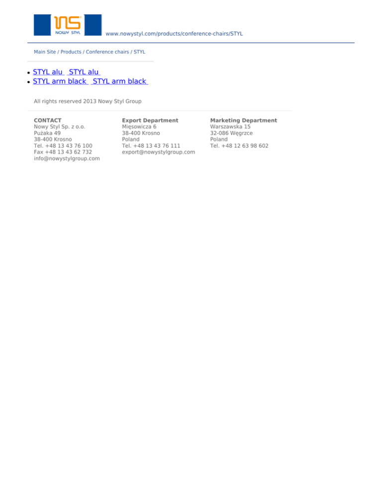 www.nowystyl.com/products/conference-chairs/STYL Main Site / Products / Conference chairs / STYL ● ● STYL alu STYL alu STYL arm black STYL arm black All rights reserved 2013 Nowy Styl Group CONTACT Nowy Styl Sp. z o.o. Pużaka 49 38-400 Krosno Tel. +48 13 43 76 100 Fax +48 13 43 62 732 [email protected] Export Department Mięsowicza 6 38-400 Krosno Poland Tel. +48 13 43 76 111 [email protected] Marketing Department Warszawska 15 32-086 Węgrzce Poland Tel. +48 12 63 98 602