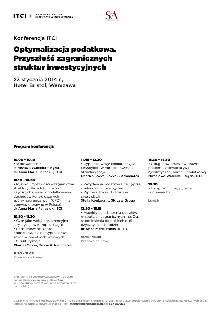 Konferencja ITCI Optymalizacja podatkowa. Przyszłość zagranicznych struktur inwestycyjnych 23 stycznia 2014 r., Hotel Bristol, Warszawa Program konferencji: 10.00 – 10.10 • Wprowadzenie Mirosława Walecka – Agria, dr Anna Maria Panasiuk, ITCI 10.10 – 10.30 • Ryzyko i możliwości – zagraniczne struktury dla polskich osób fizycznych (prawo opodatkowania dochodów kontrolowanych spółek zagranicznych (CFC) i inne obowiązki prawne w Polsce) dr Anna Maria Panasiuk, ITCI 10.30 – 11.30 • Cypr jako wciąż konkurencyjna jurysdykcja w Europie. Część 1. • Podsumowanie zasad opodatkowania na Cyprze oraz zmian w podatkach krajowych • Strukturyzacja Charles Savva, Savva & Associates 11.45 – 12.30 • Cypr jako wciąż konkurencyjna jurysdykcja w Europie. Część 2. Strukturyzacja Charles Savva, Savva & Associates 13.30 – 14.30 • Usługi powiernicze w prawie polskim - z perspektywy cywilistycznej, karnej i podatkowej. Mirosława Walecka – Agria, ITCI • Rezydencja podatkowa na Cyprze i pełnomocnictwa ogólne • Wprowadzenie do trustów cypryjskich. Stella Koukounis, SK Law Group 14.30 • Uwagi końcowe, pytania i odpowiedzi Lunch 12.30 – 13.15 • Aspekty dziedziczenia udziałów w spółkach zagranicznych, np. Cypr, w odniesieniu do polskich osób fizycznych i ich rodzin dr Anna Maria Panasiuk, ITCI 13.15 – 13.30 Przerwa na kawę 11.30 – 11.45 Przerwa na kawę (konferencja będzie prowadzona w j. polskim i angielskim, wystąpienia prelegentów w j. angielskim będą tłumaczone symultanicznie na j. polski.) Udział w konferencji jest bezpłatny, ilość miejsc ograniczona, organizator zastrzega prawo potwierdzenia zgłoszenia udziału zainteresowanych osób. Zgłoszenia udziału przyjmuje Magda Figat, [email protected], tel. 607 857 236 23 stycznia 2014 r., Hotel Bristol, Warszawa Prelegenci: Anna Maria Panasiuk Adwokat, Założyciel Grupy ITCI Jest założycielem grupy ITCI oraz partnerem kancelarii ITCI Panasiuk spółka komandytowa. Od 1999 roku zajmuje się usługami powierniczymi oraz opodatkowaniem inwestycji i transakcji trans granicznych. Kieruje zespołem prawników i księgowych obsługujących międzynarodowe spółki inwestycyjne, w tym również transakcje wyjścia z inwestycji od rozpoczęcia negocjacji do przygotowania nowych struktur koniecznych w zarządzaniu majątkiem. Specjalizuje się usługach powierniczych, tj. fundacji prywatnych oraz trustów, doradza osobom prywatnym, m.in. w kwestii zachowania majątku oraz planowania sukcesji międzypokoleniowej. Absolwentka Wydziału Prawa i Administracji Uniwersytetu Gdańskiego, Szkoły Prawa Amerykańskiego UJ pod patronatem The Catholic University of America w Waszyngtonie Washington DC oraz Executive Studies in Finance Szkoły Głównej Handlowej w Warszawie. Jest doktorem nauk prawnych i autorką publikacji i monografii z dziedziny międzynarodowego prawa podatkowego. Mirosława Walecka-Agria Prawnik, Założyciel Grupy ITCI Założyciel i wspólnik ITCI, gdzie od 2002 r. świadczy usługi dotyczące międzynarodowych podatków oraz planowania korporacyjnego. Od 2000 r. zajmuje się usługami konsultingowymi dotyczącymi planowania podatkowego. Od kilku lat zaczęła łączyć dotychczasowa praktykę tworzenia struktur optymalizacyjnych z planowaniem sukcesji i ochroną majątku. Podejmuje się usług powierniczych, jest kuratorem spadków, ma pieczę nad aktywami w interesie i na rzecz klientów. Wspólnie ze swoim patronem, Mec. Jerzym Jamką, doświadczonym ekspertem w zakresie tzw. white collar crimes buduje strategie obron klientów w tym zakresie. Absolwentka Wydziału Prawa i Administracji Uniwersytetu Warszawskiego. W 2013 roku kończy aplikację adwokacką przy Warszawskiej ORA. Jest członkiem międzynarodowej grupy ekspertów Society of Trust and Estate Practitioners (STEP) gdzie ma możliwość bieżącej wymiany poglądów oraz zdobycia unikalnych doświadczeń w zakresie usług i struktur powierniczych, nie znanych w Polsce. Jej ostatnie działania podejmowane sa w interesie inwestorów polskich, którzy wskutek załamania się bankowości cypryjskiej mają zamrożone i zredukowane aktywa. Charles Savva Dyrektor Zarządzającym Savva & Associates Dyrektor Zarządzający Savva & Associates (Cypr). Posiada uprawnienia Biegłego Rewidenta uzyskane w Wielkiej Brytanii, tytuł MBA w dziedzinie finansów korporacyjnych wydany przez York University, Kanada. Do obszarów jego specjalizacji należą kwestie związane z cypryjskim i międzynarodowym opodatkowaniem i podatkiem VAT. Od roku 2001 mieszka na Cyprze; rozpoczął swoją karierę w Wielkiej Czwórce na Cyprze. Jest regularnie zapraszany jako prelegent podczas międzynarodowych seminariów podatkowych i konferencji na całym świecie. Stella Koukounis Założyciel SK Law Group założyciel SK Law Group, kancelarii prawnej, która jest podmiotem stowarzyszonym Savva & Associates. Ukończyła z wyróżnieniem studia na Uniwersytecie w Sheffield, Wielka Brytania; następnie, w roku 2005, uzyskała tytułu LLM w dziedzinie prawa spółek i prawa handlowego, który został nadany przez University College London. Jest adwokatem praktykującym na Cyprze. Posiada ponad 7-letnie doświadczenie w pracy w największych i wiodących kancelariach prawnych na Cyprze; do obszarów jej specjalizacji należą prawo spółek, prawo handlowe, prawo dotyczące zarządu powierniczego i prawo podatkowe. Stella uzyskała rekomendację klientów w Legal500 za świadczenie „najwyższej jakości usług doradztwa prawnego w szybki i skuteczny sposób” i jest regularnie wskazywana przez jej kolegów jako wiodąca prym w środowisku prawniczym na Cyprze. Udział w konferencji jest bezpłatny, ilość miejsc ograniczona, organizator zastrzega prawo potwierdzenia zgłoszenia udziału zainteresowanych osób. Zgłoszenia udziału przyjmuje Magda Figat, [email protected], tel. 607 857 236