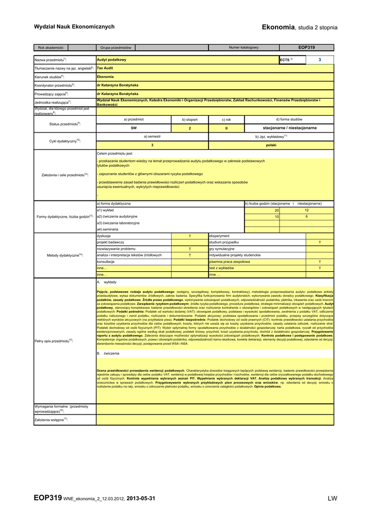 Ekonomia, studia 2 stopnia Wydział Nauk Ekonomicznych Rok akademicki: Nazwa przedmiotu1): EOP319 Numer katalogowy: Grupa przedmiotów 3 ECTS 2) Audyt podatkowy Tłumaczenie nazwy na jęz. angielski3): Tax Audit Kierunek studiów4): Ekonomia Koordynator przedmiotu5): dr Katarzyna Boratyńska Prowadzący zajęcia6): dr Katarzyna Boratyńska Jednostka realizująca7): Wydział Nauk Ekonomicznych, Katedra Ekonomiki i Organizacji Przedsiębiorstw, Zakład Rachunkowości, Finansów Przedsiębiorstw i Bankowości Wydział, dla którego przedmiot jest realizowany8): a) przedmiot b) stopień c) rok d) forma studiów SW 2 II stacjonarne / niestacjonarne Status przedmiotu9): a) semestr b) Jęz. wykładowy11) 3 polski Cykl dydaktyczny10): Celem przedmiotu jest: - przekazanie studentom wiedzy na temat przeprowadzania audytu podatkowego w zakresie podstawowych tytułów podatkowych Założenia i cele przedmiotu12): - zapoznanie studentów z głównymi obszarami ryzyka podatkowego - przedstawienie zasad badania prawidłowości rozliczeń podatkowych oraz wskazania sposobów usunięcia ewentualnych, wykrytych nieprawidłowości a) forma dydaktyczna b) liczba godzin (stacjonarne i a1) wykład Formy dydaktyczne, liczba godzin13): a2) ćwiczenia audytoryjne niestacjonarne) 20 12 10 6 a3) ćwiczenia laboratoryjne a4) seminaria dyskusja T projekt badawczy Metody dydaktyczne14): rozwiazywanie problemu T analiza i interpretacja tekstów źródłowych T T gry symulacyjne indywidualne projekty studenckie konsultacje pisemna praca zespołowa T inne… test z wykładów T inne… inne … A. Pełny opis przedmiotu15): eksperyment studium przypadku wykłady Pojęcie, podstawowe rodzaje audytu podatkowego: (wstępny, szczegółowy, kompleksowy, kontraktowy), metodologia przeprowadzania audytu: podatkowe ankiety przedaudytowe, wykaz dokumentów źródłowych, zakres badania. Specyfika funkcjonowania firm audytorskich, wykonywanie zawodu doradcy podatkowego. Klasyfikacja podatków, zasady podatkowe. Źródła prawa podatkowego, wykonywanie zobowiązań podatkowych, odpowiedzialność podatnika, płatnika, inkasenta oraz osób trzecich za zobowiązania podatkowe. Zarządzanie ryzykiem podatkowym: źródła ryzyka podatkowego, procedura podatkowa, strategie minimalizacji obciążeń podatkowych. Audyt podatkowy, stanowiący kompleksowe badanie prawidłowości określenia oraz rozliczenia kontrahenta z obowiązków i zobowiązań podatkowych w następujących tytułach podatkowych: Podatki pośrednie: Podatek od wartości dodanej (VAT): obowiązek podatkowy, podstawa i wysokość opodatkowania, zwolnienia z podatku VAT, odliczenie podatku naliczonego i zwrot podatku, rozliczanie i dokumentowanie. Podatek akcyzowy: podstawa opodatkowania i przedmiot podatku, przepisy szczególne dotyczące niektórych wyrobów akcyzowych (na przykładzie piwa). Podatki bezpośrednie: Podatek dochodowy od osób prawnych (CIT): kontrola prawidłowości ustalania przychodów oraz kosztów uzyskania przychodów dla celów podatkowych, koszty, których nie uważa się za koszty uzyskania przychodów, zasady ustalania zaliczek, rozliczanie strat. Podatek dochodowy od osób fizycznych (PIT): Wybór optymalnej formy opodatkowania przychodów z działalności gospodarczej: karta podatkowa, ryczałt od przychodów ewidencjonowanych, zasady ogólne według skali podatkowej, podatek liniowy, przychód, koszt uzyskania przychodu, dochód z działalności gospodarczej. Przygotowanie raportu z audytu podatkowego. Zalecenia dotyczące możliwości optymalizacji wysokości zobowiązań podatkowych. Kontrola podatkowa i postępowanie podatkowe. Kompetencje organów podatkowych, prawa i obowiązki podatnika, odpowiedzialność karno-skarbowa, korekta deklaracji, elementy decyzji podatkowej, odwołanie od decyzji, stwierdzenie nieważności decyzji, postępowanie przed WSA i NSA. B. ćwiczenia Ocena prawidłowości prowadzenia ewidencji podatkowych. Charakterystyka dowodów księgowych będących podstawą ewidencji, badanie prawidłowości prowadzenia rejestrów zakupu i sprzedaży dla celów podatku VAT, ewidencji w podatkowej księdze przychodów i rozchodów, ewidencji dla celów zryczałtowanego podatku dochodowego od osób fizycznych. Kontrola wypełniania wybranych zeznań PIT. Wypełnianie wybranych deklaracji VAT. Analiza podatkowa wybranych transakcji. Analiza orzecznictwa w sprawach podatkowych. Przygotowywanie wybranych przykładowych pism procesowych oraz wniosków, np. odwołania od decyzji, wniosku o rozłożenie podatku na raty, wniosku o odroczenie płatności podatku, wniosku o umorzenie zaległości podatkowych. Opinia podatkowa. Wymagania formalne (przedmioty wprowadzające)16): Założenia wstępne17): EOP319 WNE_ekonomia_2_12.03.2012, 2013-05-31 LW Ekonomia, studia 2 stopnia Wydział Nauk Ekonomicznych 01 - zna specyfikę wykonywania zawodu doradcy podatkowego 05 - 02 - posiada wiedzę z zakresu podatków oraz przeprowadzania audytu 06 podatkowego 18) Efekty kształcenia : (z kolejnymi numerami, 01, 02, 03 itd.) Sposób weryfikacji efektów kształcenia19): 03 - potrafi przygotowywać analizy podatkowe/ opinie podatkowe 07 - 04 - praca w zespole 08 - kolokwium na zajęciach ćwiczeniowych ocena wykonanie zadania projektowego na zdefiniowany temat praca pisemna przygotowywana w ramach pracy własnej studenta ocena wynikająca z obserwacji w trakcie zajęć ocena eksperymentów wykonywanych w trakcie zajęć przygotowanie zespołowej analizy zdefiniowanego problemu ocena wystąpień i prezentacji w trakcie zajęć test komputerowy egzamin ustny test z wykładów inne… inne.. T złożone projekty złożone prace w formie elektronicznej i/lub papierowej Element oceny imienne karty oceny studenta test z wykładów Waga w % Element oceny T T Waga w % ocena wykonania zadania projektowego na zdefiniowany temat praca pisemna przygotowywana w ramach pracy własnej studenta ocena wynikająca z obserwacji w trakcie zajęć ocena eksperymentów wy