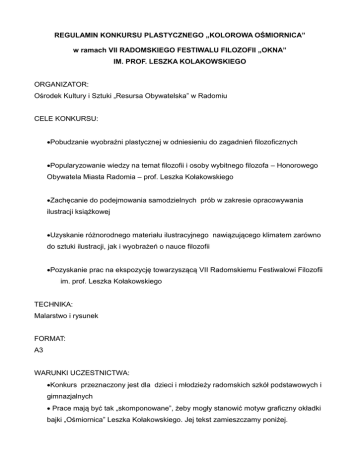 REGULAMIN KONKURSU PLASTYCZNEGO „KOLOROWA OŚMIORNICA” w ramach VII RADOMSKIEGO FESTIWALU FILOZOFII „OKNA” IM. PROF. LESZKA KOLAKOWSKIEGO ORGANIZATOR: Ośrodek Kultury i Sztuki „Resursa Obywatelska” w Radomiu CELE KONKURSU: Pobudzanie wyobraźni plastycznej w odniesieniu do zagadnień filozoficznych Popularyzowanie wiedzy na temat filozofii i osoby wybitnego filozofa – Honorowego Obywatela Miasta Radomia – prof. Leszka Kołakowskiego Zachęcanie do podejmowania samodzielnych prób w zakresie opracowywania ilustracji książkowej Uzyskanie różnorodnego materiału ilustracyjnego nawiązującego klimatem zarówno do sztuki ilustracji, jak i wyobrażeń o nauce filozofii Pozyskanie prac na ekspozycję towarzyszącą VII Radomskiemu Festiwalowi Filozofii im. prof. Leszka Kołakowskiego TECHNIKA: Malarstwo i rysunek FORMAT: A3 WARUNKI UCZESTNICTWA: Konkurs przeznaczony jest dla dzieci i młodzieży radomskich szkół podstawowych i gimnazjalnych Prace mają być tak „skomponowane”, żeby mogły stanowić motyw graficzny okładki bajki „Ośmiornica” Leszka Kołakowskiego. Jej tekst zamieszczamy poniżej. Każdy uczestnik może dostarczyć na konkurs do dwóch prac. Wyklucza się prace zbiorowe oraz pomoc osób dorosłych. Prace powinny być zaopatrzone w metryczkę (na odwrocie) z następującymi danymi: - imię i nazwisko autora, - wiek uczniów, klasa i szkoła - tel. kontaktowy Prace należy składać w Ośrodku Kultury i Sztuki „Resursa Obywatelska” w Radomiu, ul. Malczewskiego 16 do 8 maja br w godz. 9 – 15.30 z dopiskiem: konkurs plastyczny „Kolorowa ośmiornica” JURY: Jury, powołane przez organizatorów dokona oceny prac, kwalifikacji najlepszych z nich na wystawę pokonkursową i wyłoni zwycięzcę . Prace będą rozpatrywane w dwóch kategoriach wiekowych: - Uczniowie szkół podstawowych - Uczniowie szkół gimnazjalnych NAGRODY: Autor najciekawszej pracy stanie się zarazem autorem tytułowej okładki bajki „Ośmiorniczka”, autorstwa prof. Leszka Kołakowskiego, która zostanie wydana drukiem. Prace wyróżnione ozdobią środek książki i stronę tylną. UWAGI KOŃCOWE: Otwarcie wystawy pokonkursowej nastąpi w maju w Ośrodku Kultury i Sztuki „Resursa Obywatelska” podczas trwania VII Radomskiego Festiwalu Filozofii. Reklamę konkursu zamieścimy na stronie internetowej www.resursa.radom.pl i w mediach radomskich Organizatorzy zastrzegają sobie prawo do publikowania reprodukcji prac w mediach i na stronach www.resursa.radom.pl i www.radom.pl Dodatkowych informacji o konkursie udziela kurator konkursu Elżbieta Raczkowska, „Resursa Obywatelska”, tel. (048) 36-242-63 w godz. 8-16. “OŚMIORNICA” Jackowi przyśniła się ośmiornica. Machała ośmioma ramionami i wypuszczała kłęby czarnej farby, sycząc jednocześnie coś, co z początku było całkiem niewyraźne, ale z czasem dawało się zrozumieć. Jacek był najpierw przerażony, bo nie wiedział, skąd nagle znalazł się w wodzie, a poza tym przypomniał sobie, że ośmiornice bywają groźne i lepiej się z nimi nie zadawać. Ale po chwili uprzytomnił sobie, że wszystko jest we śnie i nie ma się czego bać: ani zielonej wody, ani wodorostów, ani nawet ośmiornicy. Stał więc spokojnie i przyglądał się, jak ośmiornica otacza się czarnymi chmurami i ginie w nich na krótko, jak fale rozrzedzają atramentową ciecz, ośmiornica znów pojawia się na chwilę i wypuszcza nową porcję farby. Wsłuchiwał się uważnie w syczenie potwora i po dłuższej chwili udało mu się zrozumieć jego mowę. - Jacusiu - syczała ośmiornica. - Zabierz mnie stąd, bo jestem bardzo nieszczęśliwa. Jacek zupełnie już pozbył się strachu i nie widział właściwie nic złego w rozmowie z ośmiornicą, a nawet pomyślał, że może się dowie czegoś ciekawego. Zapytał więc zaraz: - Dlaczegóż to jesteś nieszczęśliwa, moja ośmiorniczko? - Jestem nieszczęśliwa, bo mnie nikt mnie lubi - odsyczała ośmiornica, ale tak niewyraźnie, że musiała na prośbę Jacka trzy razy powtórzyć to zdanie, zanim chłopiec zrozumiał. - A któż to cię nie lubi, ośmiorniczko kochana? - spytał Jacek. - Nikt, nikt, po prostu nikt mnie nie lubi. I zapłakała gorzko. Jacek zatroskał się. Uważał, że powinien pomóc ośmiornicy, ale nie wiedział dobrze, w jaki sposób. Zapytał jednak, udając **** (brak słowa): - Ośmiorniczko, zdaje mi się, że ty łapiesz ryby i żabki i meduzy, żeby je pożreć. - Łapię, łapię - zapłakała ośmiornica. - I pożerasz? - Tak, pożeram, pożeram. Ośmiornica szlochała już tak rozpaczliwie, że nawet na chwilę przestała wypuszczać czarną farbę i zrobiła się zupełnie niewidoczna. - Więc jakże chcesz, żeby cię lubiły, jeśli je pożerasz? – pytał jeszcze Jacek, nie bardzo zadowolony. - A czy to moja wina? – załkała ośmiornica. - Pożeram, bo nie mogę inaczej. To jest natura, rozumiesz? Ale dlaczego one mnie nie lubią? I znowu szlochała bardzo głośno, wymachując wszystkimi ramionami. - A poza tym - dodała przez łzy - to żyję ciągle w ciemności i nic nie widzę. - Ale dlaczego żyjesz w ciemności? - Bo mi puszczają tę czarną farbę, a ona wszystko mi zasłania. - Ośmiorniczko, przecież to ty sama puszczasz tę farbę! - Puszczam, puszczam! No to co z tego? Przecież wszystko jedno, kto puszcza farbę! Chodzi o to, że jestem nieszczęśliwa, bo nic nie widzę. Jackowi zrobiło się przykro. Pomyślał, że może ośmiornica jest niewinna, bo żyje po prostu, jak żyje, i nie może inaczej, ale że może niesprawiedliwie tak jej nie lubią. - I wszyscy mnie prześladują! - jęczała ośmiornica. - I uciekają ode mnie. I nikt się ze mną nie bawi. I nikt mnie nie pogłaszcze. I nikt mnie nie bierze do berka. Ani do kółeczka. Potem zaśpiewała smutną piosenkę: Ach, jak źle być ośmiornicą! Ośmiornicy nikt nie kocha! Ośmiornicę wszyscy ****(brak słowa) Nawet pająk, nawet foka. Wszyscy **** 