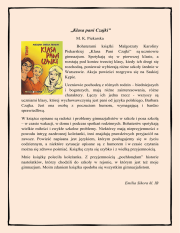 „Klasa pani Czajki” M. K. Piekarska Bohaterami książki Małgorzaty Karoliny Piekarskiej „Klasa Pani Czajki” są uczniowie gimnazjum. Spotykają się w pierwszej klasie, a rozstają pod koniec trzeciej klasy, kiedy ich drogi się rozchodzą, ponieważ wybierają różne szkoły średnie w Warszawie. Akcja powieści rozgrywa się na Saskiej Kępie. Uczniowie pochodzą z różnych rodzin – biedniejszych i bogatszych, mają różne zainteresowania, różne charaktery. Łączy ich jedna rzecz - wszyscy są uczniami klasy, której wychowawczynią jest pani od języka polskiego, Barbara Czajka. Jest ona osobą z poczuciem humoru, wymagającą i bardzo sprawiedliwą. W książce opisane są radości i problemy gimnazjalistów w szkole i poza szkołą – w czasie wakacji, w domu i podczas spotkań rodzinnych. Bohaterów spotykają wielkie miłości i zwykłe szkolne problemy. Niektórzy mają nieprzyjemności z powodu intryg zazdrosnej koleżanki, inni znajdują prawdziwych przyjaciół na zawsze. Powieść napisana jest językiem, którym posługujemy się w życiu codziennym, a niektóre sytuacje opisane są z humorem i w czasie czytania można się zdrowo pośmiać. Książkę czyta się szybko i z wielką przyjemnością. Mnie książkę poleciła koleżanka. Z przyjemnością „pochłonęłam” historie nastolatków, którzy chodzili do szkoły w rejonie, w którym jest też moje gimnazjum. Moim zdaniem książka spodoba się wszystkim gimnazjalistom. Emilia Sikora kl. IB