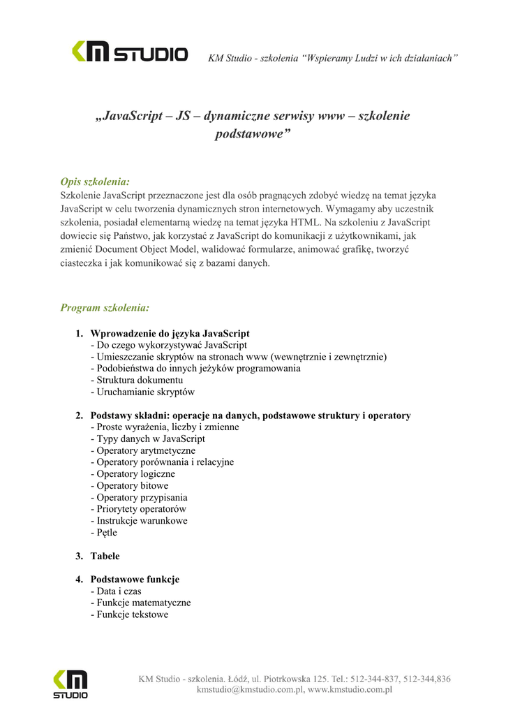 „JavaScript – JS – dynamiczne serwisy www – szkolenie podstawowe” Opis szkolenia: Szkolenie JavaScript przeznaczone jest dla osób pragnących zdobyć wiedzę na temat języka JavaScript w celu tworzenia dynamicznych stron internetowych. Wymagamy aby uczestnik szkolenia, posiadał elementarną wiedzę na temat języka HTML. Na szkoleniu z JavaScript dowiecie się Państwo, jak korzystać z JavaScript do komunikacji z użytkownikami, jak zmienić Document Object Model, walidować formularze, animować grafikę, tworzyć ciasteczka i jak komunikować się z bazami danych. Program szkolenia: 1. Wprowadzenie do języka JavaScript - Do czego wykorzystywać JavaScript - Umieszczanie skryptów na stronach www (wewnętrznie i zewnętrznie) - Podobieństwa do innych jeżyków programowania - Struktura dokumentu - Uruchamianie skryptów 2. Podstawy składni: operacje na danych, podstawowe struktury i operatory - Proste wyrażenia, liczby i zmienne - Typy danych w JavaScript - Operatory arytmetyczne - Operatory porównania i relacyjne - Operatory logiczne - Operatory bitowe - Operatory przypisania - Priorytety operatorów - Instrukcje warunkowe - Pętle 3. Tabele 4. Podstawowe funkcje - Data i czas - Funkcje matematyczne - Funkcje tekstowe - Zdarzenia i ich obsługa - Lista zdarzeń - Wyrażenia regularne 5. Obiekty wbudowane w język JavaScript - Konstruktor obiektu - Obiekt Number - Obiekt String - Obiekt RegExp - Obiekt Date - Obiekt Math 6. Formularze 7. BOM 8. DOM 9. Tworzenie własnych obiektów 10. Ajax - Ajax w JavaScript - Ajax z JQery Metodologia: - mini wykłady w Power Point - ćwiczenia przy komputerach (każdy uczestnik pracuje na osobnym komputerze) - mini filmiki szkoleniowe Informacje organizacyjne: Ilość godzin szkolenia: 6 Godziny szkolenia: 9:15-16:15 Miejsce szkolenia: Łódź, ul Piotrkowska 125 – KM Studio - szkolenia