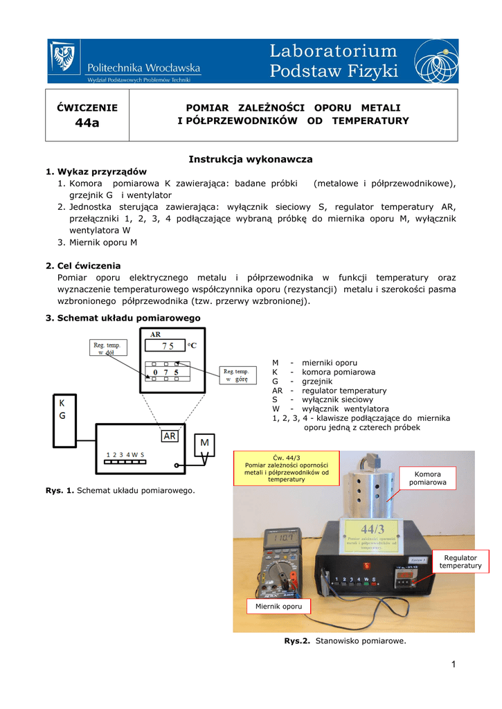 ĆWICZENIE 44a POMIAR ZALEŻNOŚCI OPORU METALI I PÓŁPRZEWODNIKÓW OD TEMPERATURY Instrukcja wykonawcza 1. Wykaz przyrządów 1. Komora pomiarowa K zawierająca: badane próbki (metalowe i półprzewodnikowe), grzejnik G i wentylator 2. Jednostka sterująca zawierająca: wyłącznik sieciowy S, regulator temperatury AR, przełączniki 1, 2, 3, 4 podłączające wybraną próbkę do miernika oporu M, wyłącznik wentylatora W 3. Miernik oporu M 2. Cel ćwiczenia Pomiar oporu elektrycznego metalu i półprzewodnika w funkcji temperatury oraz wyznaczenie temperaturowego współczynnika oporu (rezystancji) metalu i szerokości pasma wzbronionego półprzewodnika (tzw. przerwy wzbronionej). 3. Schemat układu pomiarowego M - mierniki oporu K - komora pomiarowa G - grzejnik AR - regulator temperatury S - wyłącznik sieciowy W - wyłącznik wentylatora 1, 2, 3, 4 - klawisze podłączające do miernika oporu jedną z czterech próbek Ćw. 44/3 Pomiar zależności oporności metali i półprzewodników od temperatury Rys. 1. Schemat układu pomiarowego. Komora pomiarowa Regulator temperatury Miernik oporu Rys.2. Stanowisko pomiarowe. 1 4. Przebieg pomiarów 1. Podłączyć miernik M do wyjścia badanych próbek. 2. Na regulatorze temperatury ustawić wartość mniejszą od temperatury pokojowej, np. 15oC. 3. Włączyć zasilanie urządzenia S (sprawdzić czy wentylator W jest wyłączony). Odczytać temperaturę próbek oraz ich opory. Następnie podwyższać stopniowo temperaturę, np. co ok. 5 oC. Po ustabilizowaniu się temperatury odczytywać wskazywane przez mierniki wartości temperatury i oporu próbek. Pomiary wykonać do temperatury ok. 100 o C. Może występować drobna różnica między wartościami temperatury: nastawioną, a wskazywaną. NIE PRZEKRACZAĆ 110 C ! 4. Schłodzić próbki: regulator temperatury ustawić na 20 oC i włączyć wentylator. Przed opuszczeniem stanowiska pomiarowego wyłączyć wentylator W i zasilanie urządzenia S. 5. Opracowanie wyników 1. Na podstawie wyników pomiarów ustalić które próbki są wykonane z metalu, a które z półprzewodnika. Do dalszej analizy wybrać jedną próbkę metalową i jedną półprzewodnikową. 2. Na podstawie pomiarów narysować wykres zależności: Rm = f (t) dla metalu oraz lnRs = f (1000/T) dla półprzewodnika. T oraz t oznaczają temperaturę wyrażoną odpowiednio w Kelwinach i stopniach Celsjusza. 3. Na wykresach dla wybranych punktów pomiarowych zaznaczyć graficznie niepewności pomiarowe wynikające z dokładności użytych przyrządów. 4.a) Metodą regresji liniowej wyznaczyć wraz z niepewnościami współczynniki a i b prostej najlepiej dopasowanej do punktów pomiarowych zależności Rm = f (t) Nanieść tę prostą na wykres. Porównując równanie wyznaczonej prostej dla metalu. z równaniem na opór metalu w funkcji temperatury wyznaczyć temperaturowy współczynnik oporu występujący w równaniu. Zauważając, że zmienna x odpowiada temperaturze t, z porównania wynika, że oraz . czyli: . Stąd otrzymujemy: , (1) Mając uzyskane metodą regresji liniowej współczynniki prostej a i b oraz ich niepewności u(a) i u(b), na podstawie ostatniego równania (1) obliczyć niepewność złożoną uc() temperaturowego współczynnika oporu. b) Wiemy, że w zakresie wyższych temperatur w półprzewodniku dominuje przewodnictwo samoistne, a więc opór półprzewodnika opisany jest równaniem: . Po zlogarytmowaniu tego równania otrzymujemy , co można zapisać w postaci: . Widzimy, że jest to zależność liniowa lnRs od 1000/T. 2 (2) Metodą regresji liniowej wyznaczyć wraz z niepewnościami współczynniki A i B prostej najlepiej dopasowanej do punktów pomiarowych dla półprzewodnika. Nanieść tę prostą na wykres. Porównując równanie wyznaczonej prostej zależności lnRs = f (1000/T) z równaniem (2) i zauważając, że 1000/T odpowiada zmiennej x wyznaczyć szerokość pasma wzbronionego Eg. Z tego porównania wynika, że: , Zatem: (3) -23 4. gdzie: k = 1,3806 10 J/K - stała Boltzmanna. Mając uzyskany metodą regresji liniowej współczynnik kierunkowy prostej A i jego niepewność u(A), na podstawie równania (3) obliczyć niepewność uc(Eg) przerwy wzbronionej (niepewność stałej Boltzmana pomijamy). Wyniki pomiarów i obliczeń wpisać do odpowiednich tabel. 6. Informacje dodatkowe Szerokość przerwy energetycznej Eg w półprzewodniku wyrazić w dżulach [J] i elektronowoltach [eV]. 7. Proponowane tabele (do zatwierdzenia u prowadzącego) Tabela 1. Wyniki pomiarów temperatury i oporu metalu oraz obliczeń współczynników linii prostej i temperaturowego współczynnika oporu oraz ich niepewności. t Rm a l. p. C Ω o b C-1 C 1 2 3 ⁞ n X (1) (1) (1) (1) (2) (2) (1) Obliczenia t, u(t), Rm , u(Rm) przeprowadzić dla jednaj wybranej liczby porządkowej l.p. (2) Niepewności u(a) i u(b) otrzymane metodą regresji liniowej. 3 Tabela 2. Wyniki pomiarów temperatury i oporu półprzewodnika oraz obliczeń współczynnika kierunkowego prostej i szerokości przerwy wzbronionej oraz ich niepewności. t l. p. 1000/T 1 C RS lnRS K A Eg Eg K J eV 1 2 3 ⁞ n X (3) (3) (3) (3) (3) (3) Obliczenia t, u(t), uc(1000/T),RS , u(RS), uc(lnRS) przeprowadzić dla jednej wybranej (4) liczby porządkowej l.p. uc(lnRS)=u(RS)/RS. Niepewność u(A) otrzymana metodą regresji liniowej. (5) 4 (5) (3) (4)