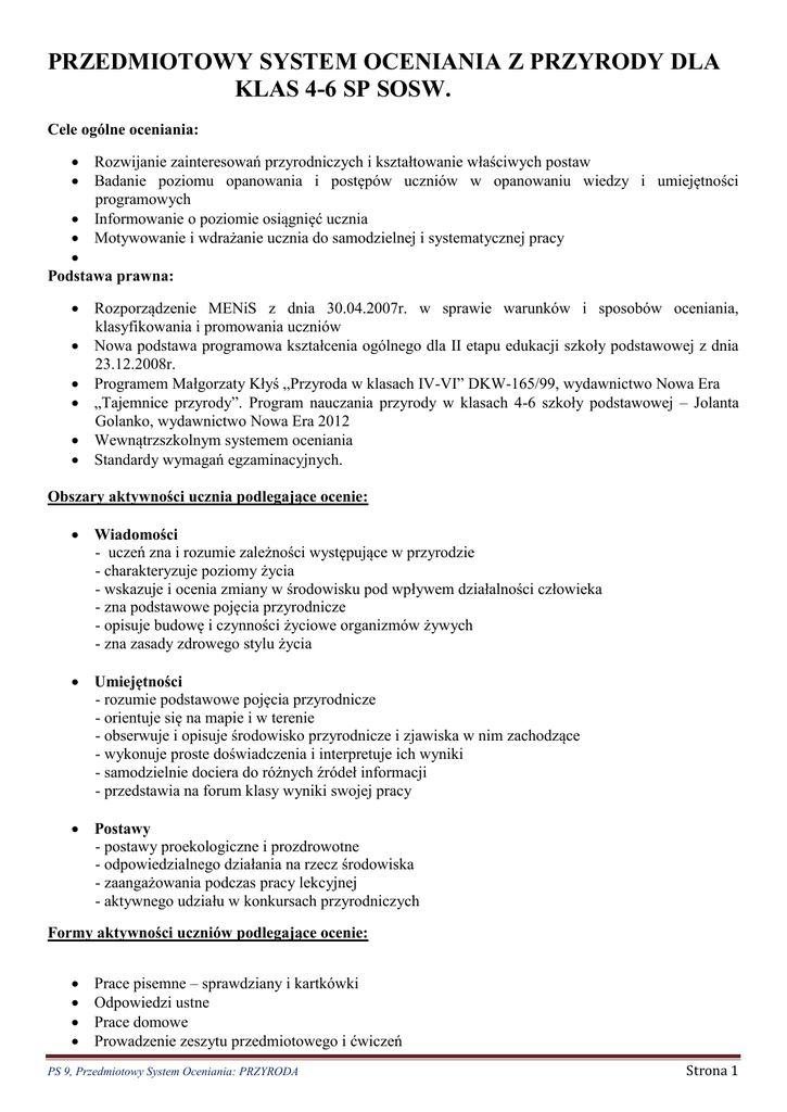 PRZEDMIOTOWY SYSTEM OCENIANIA Z PRZYRODY DLA KLAS 4-6 SP SOSW. Cele ogólne oceniania: Rozwijanie zainteresowań przyrodniczych i kształtowanie właściwych postaw Badanie poziomu opanowania i postępów uczniów w opanowaniu wiedzy i umiejętności programowych Informowanie o poziomie osiągnięć ucznia Motywowanie i wdrażanie ucznia do samodzielnej i systematycznej pracy Podstawa prawna: Rozporządzenie MENiS z dnia 30.04.2007r. w sprawie warunków i sposobów oceniania, klasyfikowania i promowania uczniów Nowa podstawa programowa kształcenia ogólnego dla II etapu edukacji szkoły podstawowej z dnia 23.12.2008r. Programem Małgorzaty Kłyś „Przyroda w klasach IV-VI” DKW-165/99, wydawnictwo Nowa Era „Tajemnice przyrody”. Program nauczania przyrody w klasach 4-6 szkoły podstawowej – Jolanta Golanko, wydawnictwo Nowa Era 2012 Wewnątrzszkolnym systemem oceniania Standardy wymagań egzaminacyjnych. Obszary aktywności ucznia podlegające ocenie: Wiadomości - uczeń zna i rozumie zależności występujące w przyrodzie - charakteryzuje poziomy życia - wskazuje i ocenia zmiany w środowisku pod wpływem działalności człowieka - zna podstawowe pojęcia przyrodnicze - opisuje budowę i czynności życiowe organizmów żywych - zna zasady zdrowego stylu życia Umiejętności - rozumie podstawowe pojęcia przyrodnicze - orientuje się na mapie i w terenie - obserwuje i opisuje środowisko przyrodnicze i zjawiska w nim zachodzące - wykonuje proste doświadczenia i interpretuje ich wyniki - samodzielnie dociera do różnych źródeł informacji - przedstawia na forum klasy wyniki swojej pracy Postawy - postawy proekologiczne i prozdrowotne - odpowiedzialnego działania na rzecz środowiska - zaangażowania podczas pracy lekcyjnej - aktywnego udziału w konkursach przyrodniczych Formy aktywności uczniów podlegające ocenie: Prace pisemne – sprawdziany i kartkówki Odpowiedzi ustne Prace domowe Prowadzenie zeszytu przedmiotowego i ćwiczeń PS 9, Przedmiotowy System Oceniania: PRZYRODA Strona 1 Praca w grupach Prace długoterminowe – albumy, zielniki, plakaty, gazetki itp. Aktywność w czasie lekcji i działalność pozalekcyjna – konkursy, udział w akcjach ekologicznych itp. Skala ocen Skala ocen na lekcjach przyrody jest zgodna z wewnątrzszkolnym systemem oceniania i obejmuje oceny w skali od 1 do 6. Warunki ocen cząstkowych: Formy pisemne: Sprawdziany pisemne po każdym dziale – testy wyboru, zadań otwartych i zadania z luką. Każdy sprawdzian zapowiedziany jest co najmniej z tygodniowym wyprzedzeniem. Obejmuje materiał z działu, który jest powtórzony i utrwalony na lekcji powtórzeniowej. W przypadku nieobecności lub uzyskania oceny niedostatecznej przez ucznia, jest on zobowiązany zaliczyć lub poprawić sprawdzian w terminie ustalonym wspólnie z nauczycielem. Poprawę uczeń może pisać tylko jeden raz. Do dziennika wpisuje się ocenę ze sprawdzianu oraz poprawy, bez względu czy jest ona wyższa czy niższa od uzyskanej pierwotnie. Sprawdzian może zawierać zadanie wykraczające poza podstawy programowe, oceniane na stopień celujący, pod warunkiem uzyskania przez ucznia punktacji na ocenę bardzo dobrą. Sprawdziany semestralne – obejmują materiał z całego semestru i są zapowiadane z co najmniej dwutygodniowym wyprzedzeniem. Sprawdzianu semestralnego uczeń nie poprawia. W przypadku nieobecności jest zobowiązany go zaliczyć. Kartkówki – sprawdzają bieżące wiadomości i umiejętności. Obejmują 2 ostatnie lekcje i nie podlegają poprawie tylko zaliczeniu w przypadku nieobecności. Kartkówki mogą być zapowiedziane lub nie. Prace domowe – sprawdzają samodzielność ucznia i merytoryczny związek z tematem. Dłuższe prace oceniane są stopniem, a krótsze + lub -. Karty pracy samodzielnej. Prowadzenie zeszytu przedmiotowego i ćwiczeń, który co najmniej raz w semestrze jest oceniany. W przypadku zeszytu przedmiotowego sprawdzany jest fakt jego posiadania na lekcji. W przypadku zgłoszenia jego braku, uczeń otrzymuje -. Formy ustne: Odpowiedzi ustne zawierające dłuższą wypowiedź – obejmują dwie ostatnie lekcje i oceniane są stopniem. Krótkie formy wypowiedzi – wynikają z aktywności ucznia na lekcji. Ocena może być wyrażona stopniem lub +, brak odpowiedzi wynikający nieprzygotowaniem lub brakiem zainteresowania lekcją, znakiem -. Za pięć + uczeń otrzymuje ocenę bardzo dobrą, a za pięć – ocenę niedostateczną. Prace praktyczne: Wykonanie zielnika lub innego zbioru przyrodniczego Gromadzenie różnorodnych materiałów Wykonywanie pomocy dydaktycznych Aktywność pozalekcyjna wpływająca na podwyższenie oceny: Sukcesy w konkursach przyrodniczych i ekologicznych Duże zaangażowanie w pracy na rzecz ochrony środowiska PS 9, Przedmiotowy System Oceniania: PRZYRODA Strona 2 Przygotowanie do lekcji: Uczeń ma prawo zgłosić nieprzygotowanie do lekcji przed jej rozpoczęciem. Jest to odnotowane w dzienniku jako -. Za nie zgłoszone nieprzygotowanie do lekcji, a wykryte w czasie jej trwania, uczeń otrzymuje ocenę niedostateczną. W ciągu semestru uczeń ma prawo 5 razy być nie przygotowany, nie posiadać zeszytu przedmiotowego lub ćwiczeń, nie odrobione zadanie domowe. Po wykorzystaniu limitu, każdorazowo uczeń otrzymuje ocenę niedostateczną. Warunki ocen semestralnych i końcoworocznych Ocena semestralna i końcoworoczna nie jest średnią arytmetyczną ocen cząstkowych. O ocenie decydują: oceny samodzielnej pracy ucznia ( prace pisemne, testy, kartkówki, oceny z odpowiedzi ustnych, prace praktyczne, prace domowe ), oceny wspomagające ( aktywność na lekcji, prace dodatkowe, udział w zajęciach pozalekcyjnych) Największą wartość mają: prace pisemne, odpowiedzi ustne prace praktyczne rozwiązywanie problemów, uzasadnianie, wnioskowanie aktywność Ustalona przez nauczyciela końcoworoczna ocena niedostateczna może być zmieniona w wyniku egzaminu poprawkowego według obowią