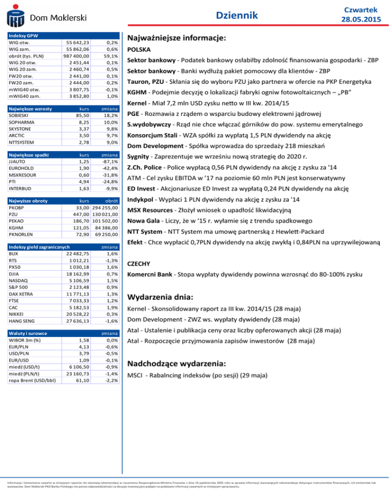 Dziennik Indeksy GPW WIG otw. WIG zam. obrót (tys. PLN) WIG 20 otw. WIG 20 zam. FW20 otw. FW20 zam. mWIG40 otw. mWIG40 zam. 55 642,23 55 862,06 987 400,00 2 451,44 2 460,74 2 441,00 2 444,00 3 807,75 3 852,80 0,2% 0,6% 59,1% 0,1% 0,5% 0,1% 0,2% -0,1% 1,0% Największe wzrosty SOBIESKI SOPHARMA SKYSTONE ARCTIC NTTSYSTEM kurs 85,50 8,25 3,37 3,50 2,78 zmiana 18,2% 10,0% 9,8% 9,7% 9,0% Największe spadki JJAUTO EUROHOLD MSXRESOUR PTI INTERBUD kurs 1,25 1,90 0,60 4,94 1,63 zmiana -87,1% -42,4% -31,8% -24,8% -9,9% Najwyższe obroty PKOBP PZU PEKAO KGHM PKNORLEN kurs obrót 33,00 294 255,00 447,00 130 021,00 186,70 101 502,00 121,05 84 386,00 72,90 69 250,00 Indeksy giełd zagranicznych BUX 22 482,75 RTS 1 012,21 PX50 1 030,18 DJIA 18 162,99 NASDAQ 5 106,59 S&P 500 2 123,48 DAX XETRA 11 771,13 FTSE 7 033,33 CAC 5 182,53 NIKKEI 20 528,22 HANG SENG 27 636,13 zmiana 1,6% -1,3% 1,6% 0,7% 1,5% 0,9% 1,3% 1,2% 1,9% 0,3% -1,6% Waluty i surowce WIBOR 3m (%) EUR/PLN USD/PLN EUR/USD miedź (USD/t) miedź (PLN/t) ropa Brent (USD/bbl) zmiana 0,0% -0,6% -0,5% -0,1% -0,9% -1,4% -2,2% 1,58 4,13 3,79 1,09 6 106,50 23 160,73 61,10 Czwartek 28.05.2015 Najważniejsze informacje: POLSKA Sektor bankowy - Podatek bankowy osłabiłby zdolność finansowania gospodarki - ZBP Sektor bankowy - Banki wydłużą pakiet pomocowy dla klientów - ZBP Tauron, PZU - Skłania się do wyboru PZU jako partnera w ofercie na PKP Energetyka KGHM - Podejmie decyzję o lokalizacji fabryki ogniw fotowoltaicznych – „PB” Kernel - Miał 7,2 mln USD zysku netto w III kw. 2014/15 PGE - Rozmawia z rządem o wsparciu budowy elektrowni jądrowej S.wydobywczy - Rząd nie chce włączać górników do pow. systemu emerytalnego Konsorcjum Stali - WZA spółki za wypłatą 1,5 PLN dywidendy na akcję Dom Development - Spółka wprowadza do sprzedaży 218 mieszkań Sygnity - Zaprezentuje we wrześniu nową strategię do 2020 r. Z.Ch. Police - Police wypłacą 0,56 PLN dywidendy na akcję z zysku za '14 ATM - Cel zysku EBITDA w ’17 na poziomie 60 mln PLN jest konserwatywny ED Invest - Akcjonariusze ED Invest za wypłatą 0,24 PLN dywidendy na akcję Indykpol - Wypłaci 1 PLN dywidendy na akcję z zysku za '14 MSX Resources - Złożył wniosek o upadłość likwidacyjną Nowa Gala - Liczy, że w ‘15 r. wyłamie się z trendu spadkowego NTT System - NTT System ma umowę partnerską z Hewlett-Packard Efekt - Chce wypłacić 0,7PLN dywidendy na akcję zwykłą i 0,84PLN na uprzywilejowaną CZECHY Komercni Bank - Stopa wypłaty dywidendy powinna wzrosnąć do 80-100% zysku Wydarzenia dnia: Kernel - Skonsolidowany raport za III kw. 2014/15 (28 maja) Dom Development - ZWZ ws. wypłaty dywidendy (28 maja) Atal - Ustalenie i publikacja ceny oraz liczby opferowanych akcji (28 maja) Atal - Rozpoczęcie przyjmowania zapisów inwestorów (28 maja) Nadchodzące wydarzenia: MSCI - Rabalncing indeksów (po sesji) (29 maja) Informacje i komentarze zawarte w niniejszym raporcie nie stanowią rekomendacji w rozumieniu Rozporządzenia Ministra Finansów z dnia 19 października 2005 roku w sprawie informacji stanowiących rekomendacje dotyczące instrumentów finansowych, ich emitentów lub wystawców. Dom Maklerski PKO Banku Polskiego nie ponosi odpowiedzialności za decyzje inwestycyjne podjęte na podstawie informacji zawartych w niniejszym opracowaniu. Dziennik Najważniejsze informacje POLSKA Sektor bankowy Podatek bankowy osłabiłby zdolność finansowania gospodarki przez banki – ZBP Prezes Związku Banków Polskich Krzysztof Pietraszkiewicz poinformował, że wprowadzenie podatku bankowego spowolniłoby wzrost gospodarczy i osłabiłoby zdolność finansowania gospodarki przez banki. Sektor bankowy Banki wydłużą pakiet pomocowy dla klientów - ZBP Z deklaracji podpisanych przez banki zaangażowane w kredyty CHF wynika, że banki wydłużą do końca 2015 r. pierwszy pakiet pomocowy dla kredytobiorców mieszkaniowych. Banki będą tworzyć indywidualne fundusze stabilizacyjne w celu wdrożenia rozwiązań finansowych do przewalutowania kredytów mieszkaniowych w CHF, na co przeznaczą w najbliższym czasie 300-600 mln PLN, a także zasilą kwotą 125 mln PLN Fundusz Wsparcia Restrukturyzacji Kredytów Hipotecznych. System dopłat będzie dostępny po przekroczeniu określonego poziomu granicznego kursu CHF. Warunkiem udzielenia wsparcia lub pomocy będzie: mieszkanie do 75 m 2 lub dom do 100 m2 i dochód kredytobiorcy niższy od średniej krajowej w momencie złożenia wniosku o podpisanie aneksu. Banki zadeklarowały wydłużenie okresu funkcjonowania pierwszego pakietu pomocy dla kredytobiorców do końca 2015 roku z możliwością jego dalszego przedłużenia. ZBP podał, że poniesione przez bank koszty realizacji pierwszego pakietu w 2015 roku wyniosą łączne ponad 300 mln zł. Pakiet ten obejmował m.in. uwzględnienie ujemnej stawki LIBOR CHF, zmniejszenie spreadu walutowego, czy przewalutowanie po średnim kursie NBP. Przewodniczący KNF Andrzej Jakubiak poinformował, że Komisja będzie oceniała propozycje ZBP pod kątem tego czy zawierają one rozwiązanie problemu niskiej wartości nieruchomości stanowiących zabezpieczenie kredytów hipotecznych. Prezes ZBP Krzysztof Pietraszkiewicz poinformował, że banki zaangażowane w walutowe kredyty hipoteczne gotowe są przeznaczyć w 2015 roku ponad 800 mln PLN na pomoc kredytobiorcom. W ciągu 10 lat suma dopłat banków z tytułu funduszów stabilizacyjnych może wynieść 3,5 mld PLN. Deklarację podpisały: mBank, PKO BP, BGŻ BNP, Bank Millennium, BZ WBK, Raiffeisen Bank, Getin Noble Bank, Santander Consumer Bank, Deutsche Bank Polska i Bank BPH. (J. Szortyka) Tauron, PZU Skłania się do wyboru PZU jako partnera w ofercie na PKP Energetyka Prezes Tauronu Dariusz Lubera poinformował „Rzeczspospolitą”, że grupa skłania się do wyboru PZU jako partnera przy składaniu oferty na PKP Energetykę. Wcześniej w kontekście współfinansowania tej transakcji wymieniano też fundusz 
