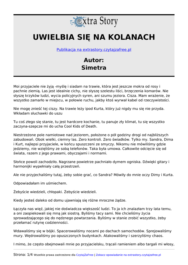 UWIELBIA SIĘ NA KOLANACH Publikacja na extrastory.czytajzafree.pl Autor: Simetra Moi przyjaciele nie żyją -myślę i siadam na trawie, która jest jeszcze mokra od rosy i pachnie ziemią. Las jest idealnie cichy, nie słyszę szelestu liści, brzęczenia komarów. Nie słyszę krzyków ludzi, wycia policyjnych syren, ani szumu jeziora. Cisza. Mam wrażenie, że wszystko zamarło w miejscu, w połowie ruchu, jakby ktoś wyrwał kabel od rzeczywistości. Nie mogę znieść tej ciszy. Na trawie leży ipod Kurta, który już nigdy mu się nie przyda. Wkładam słuchawki do uszu Tu coś złego się stanie, tu jest hardcore kochanie, tu panuje zły klimat, tu się wszystko zaczyna-szepcze mi do ucha Cool Kids of Death. Niestrzeżone pole namiotowe nad jeziorem, położone o pół godziny drogi od najbliższych zabudowań. Obok wielki, ciemny las. Zero kontroli. Zero świadków. Tylko my. Sandra, Dima i Kurt, najlepsi przyjaciele, w końcu spuszczeni ze smyczy. Nikomu nie mówiliśmy gdzie jedziemy, nie wzięliśmy ze sobą telefonów. Taka była umowa. Całkowite odcięcie się od świata, razem z jego prawami, obyczajami i normami. Słońce powoli zachodziło. Nagrzane powietrze pachniało dymem ogniska. Dźwięki gitary i harmonijki wypełniały całą przestrzeń. Ale nie przyjechaliśmy tutaj, żeby sobie grać, co Sandra? Mówiły do mnie oczy Dimy i Kurta. Odpowiadałam im uśmiechem. Żebyście wiedzieli, chłopaki. Żebyście wiedzieli. Kiedy jesteś daleko od domu ujawniają się różne mroczne żądze. Łączyła nas więź, jakiej nie doświadcza większość ludzi. To ja ich znalazłam trzy lata temu, a oni zaopiekowali się mną jak siostrą. Byliśmy tacy sami. Nie chcieliśmy życia sprowadzającego się do nędznego powtarzania. Byliśmy w stanie zrobić wszystko, żeby przełamać rutynę codzienności. Wdawaliśmy się w bójki. Spacerowaliśmy nocami po dachach samochodów. Sprejowaliśmy mury. Wędrowaliśmy po opuszczonych budynkach. Atakowaliśmy i szerzyliśmy chaos. I mimo, że często obejmowali mnie po przyjacielsku, trącali ramieniem albo targali mi włosy, Strona: 1/4 Wszelkie prawa zastrzeżone dla CzytajZaFree | Zobacz opowiadanie na extrastory.czytajzafree.pl to czasem widziałam w ich oczach błysk. Niemy głód, którego nie mogli ukryć. Chociaż tak bardzo się starali. Dima wziął łyk jabola i pocałował mnie, nie przełykając go. Potem ja wpiłam się w Kurta, aż alkohol wędrował tam i z powrotem, pomiędzy naszymi ustami. Śmialiśmy się, wino ciekło nam po brodach i uwalniało umysły. Powoli wyplątywałam się ze stanika, koszulki i spódnicy, a oni rozpinali paski nabite ćwiekami, które wyglądały groźnie. Zdejmowali koszulki z nazwami zespołów, zrzucali bojówki i skórzane kurtki, które zawsze podniecały mnie do granicy wytrzymałości. W końcu rzuciliśmy się do wody. Wrzeszczeliśmy na cały głos. Nie było nikogo kto mógłby nas za to ochrzanić, byliśmy bezkarni, zupełnie bezkarni. Jezioro było chłodne i ciemne, kolorem prawie nie różniło się od granatowego nieba nad nami. Granice się zacierały. Pływaliśmy obok siebie, stopniując napięcie. Staraliśmy nie musnąć się nawzajem nawet kawałkiem ciała. To musiała być dla nich pieprzona męczarnia, widziałam to w ich oczach. Później zostawiłam ich samych w wodzie i wróciłam do namiotu. Zasunęłam zamek, położyłam się w ciemnościach i czekałam. Słyszałam jak wracają, porządnie narąbani. Jeszcze długo słyszałam ich przytłumione głosy, a potem zapadła cisza. Czekałam. W końcu -zgrzyt rozsuwanego zamka. Dima wsadził rozczochraną głowę do namiotu i wyciągnął do mnie rękę. -Chodź. -A Kurt? -Śpi. Nie dowie się. Poszliśmy na pomost. Dima miał na sobie tylko dżinsy, był pijany i napalony. Patrzyłam na niego spokojnie, przekrzywiając głowę. Myślałam o tym jak zawsze mnie pociągał. -Co pan powie na mały eksperyment?-zapytałam -Jaki eksperyment? Przestań się w końcu nad nami znęcać, Sandra- wydyszał- Wiesz, że cię uwielbiam. -Uwielbia się na kolanach. –odpowiedziałam cicho Dimę wyłowili z jeziora przed świtem. Kurt i ja jeszcze spaliśmy. Znalazła go jakaś dwójka ludzi, która postanowiła popływać łódką. A potem panika, policja, pogotowie, spokojne pole namiotowe zamienione w piekło. Siedziałam przed namiotem i bawiłam się piaskiem. Przesypywałam go pomiędzy palcami. Podobała mi się jego uległość. Policjanci próbowali zadawać mi jakieś pytania, ale nic do mnie nie docierało. Kurt poszedł zidentyfikować ciało. Kiedy po chwili podniosłam wzrok, zobaczyłam, że stoi na brzegu i rzyga do wody. Podeszłam do niego i pogłaskałam go po plecach. -Kurt, chodź ze mną.- poprosiłam Otarł usta rękawem i spojrzał na mnie nieprzytomnym wzrokiem. Był tak blady jakby sam przeleżał noc na dnie jeziora. Po twarzy płynęły mu łzy. -Co…gdzie? -Chodź ze mną, proszę cię, chodź. Wzięłam go za rękę i pociągnęłam. Nie opierał się, szedł za mną zamroczony kacem i Strona: 2/4 Wszelkie prawa zastrzeżone dla CzytajZaFree | Zobacz opowiadanie na extrastory.czytajzafree.pl szokiem. Podobała mi się jego uległość. Zaprowadziłam go do lasu. -Jak to się stało?- bełkotał w kółko- Przecież wróciliśmy razem… Gdzie mnie prowadzisz? O co ci chodzi? Musimy tam wrócić… Nie odpowiadałam, tylko szłam przed siebie, coraz dalej, kalecząc sobie bose stopy o szyszki i kamienie. -Sandra, stój, dobra? Zatrzymałam się i odwróciłam. Podszedł do mnie. Patrzył w tym samym kierunku, co ja. Długie, ciemnoblond włosy wpadały mu do oczu, ręce drżały. -Pamiętasz to miejsce?- zapytałam stając za jego plecami i obejmując go od tyłu ramionami. Przytuliłam go mocno. -Co? -Byłeś tu kiedyś na koloni. – sięgnęłam do kieszeni- Jakieś sześć lat temu. Pamiętasz? Rozejrzał się jeszcze raz, uważnie. Wsunęłam dłoń do kieszeni. Las był cichy. Zacisnę