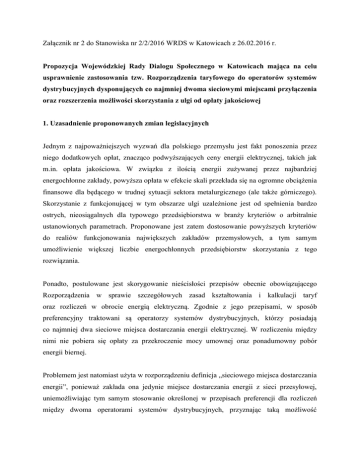 Załącznik nr 2 do Stanowiska nr 2/2/2016 WRDS w Katowicach z 26.02.2016 r. Propozycja Wojewódzkiej Rady Dialogu Społecznego w Katowicach mająca na celu usprawnienie zastosowania tzw. Rozporządzenia taryfowego do operatorów systemów dystrybucyjnych dysponujących co najmniej dwoma sieciowymi miejscami przyłączenia oraz rozszerzenia możliwości skorzystania z ulgi od opłaty jakościowej 1. Uzasadnienie proponowanych zmian legislacyjnych Jednym z najpoważniejszych wyzwań dla polskiego przemysłu jest fakt ponoszenia przez niego dodatkowych opłat, znacząco podwyższających ceny energii elektrycznej, takich jak m.in. opłata jakościowa. W związku z ilością energii zużywanej przez najbardziej energochłonne zakłady, powyższa opłata w efekcie skali przekłada się na ogromne obciążenia finansowe dla będącego w trudnej sytuacji sektora metalurgicznego (ale także górniczego). Skorzystanie z funkcjonującej w tym obszarze ulgi uzależnione jest od spełnienia bardzo ostrych, nieosiągalnych dla typowego przedsiębiorstwa w branży kryteriów o arbitralnie ustanowionych parametrach. Proponowane jest zatem dostosowanie powyższych kryteriów do realiów funkcjonowania największych zakładów przemysłowych, a tym samym umożliwienie większej liczbie energochłonnych przedsiębiorstw skorzystania z tego rozwiązania. Ponadto, postulowane jest skorygowanie nieścisłości przepisów obecnie obowiązującego Rozporządzenia w sprawie szczegółowych zasad kształtowania i kalkulacji taryf oraz rozliczeń w obrocie energią elektryczną. Zgodnie z jego przepisami, w sposób preferencyjny traktowani są operatorzy systemów dystrybucyjnych, którzy posiadają co najmniej dwa sieciowe miejsca dostarczania energii elektrycznej. W rozliczeniu między nimi nie pobiera się opłaty za przekroczenie mocy umownej oraz ponadumowny pobór energii biernej. Problemem jest natomiast użyta w rozporządzeniu definicja „sieciowego miejsca dostarczania energii”, ponieważ zakłada ona jedynie miejsce dostarczania energii z sieci przesyłowej, uniemożliwiając tym samym stosowanie określonej w przepisach preferencji dla rozliczeń między dwoma operatorami systemów dystrybucyjnych, przyznając taką możliwość wyłącznie w rozliczeniach z operatorem systemu przesyłowego. Proponowane zmiany legislacyjne dążą do rozszerzenia możliwości skorzystania z tej preferencji. 2. Proponowane brzmienie zmian legislacyjnych W rozporządzeniu Ministra Gospodarki z dnia 18 sierpnia 2011 r. w sprawie szczegółowych zasad kształtowania i kalkulacji taryf oraz rozliczeń w obrocie energią elektryczną wprowadza się następujące zmiany: 1) w § 25 ust. 2. otrzymuje brzmienie „2. Współczynniki oznaczone symbolami „kos” i „kok”, o których mowa w § 24 ust. 1, ustala się dla odbiorców końcowych: 1) którzy w roku kalendarzowym (n-2), poprzedzającym o rok dany rok kalendarzowy (n), w którym jest stosowana stawka jakościowa, zużyli na własne potrzeby nie mniej niż 100 GWh energii elektrycznej, z wykorzystaniem nie mniej niż 40% mocy umownej, dla których koszt energii elektrycznej obliczonej przy zastosowaniu współczynnika „kos” = 1 stanowi nie mniej niż 3% wartości produkcji i których przeważającą działalnością gospodarczą jest działalność określona w Polskiej Klasyfikacji Działalności (PKD) i oznaczona następującymi kodami: 0510; 0729; 0811; 0891; 0893; 0899; 1032; 1039; 1041; 1062; 1104; 1106; 1310; 1320; 1394; 1395; 1411; 1610; 1621; 1711; 1712; 1722; 1920; 2012; 2013; 2014; 2015; 2016; 2017; 2060; 2110; 2221; 2222; 2311; 2312; 2313; 2314; 2319; 2320; 2331; 2342; 2343; 2349; 2399; 2410; 2420; 2431; 2432; 2434; 2441; 2442; 2443; 2444; 2445; 2446; 2720; 3299; 2011; 2332; 2351; 2352; 2451; 2452; 2453; 2454; 2611; 2680; 3832 jako „kos” = 0,1; 2) w krajowym systemie elektroenergetycznym innych niż odbiorcy, o których mowa w pkt 1, przyłączonych do sieci, w której usługi przesyłania lub dystrybucji energii elektrycznej świadczy operator lub przedsiębiorstwo energetyczne niebędące operatorem, którzy całość kupowanej energii zużywają na własne potrzeby - jako „kok”; współczynnik ten oblicza się według wzoru: Propozycja Wojewódzkiej Rady Dialogu Społecznego w Katowicach mająca na celu usprawnienie zastosowania tzw. Rozporządzenia taryfowego do operatorów systemów dystrybucyjnych dysponujących co najmniej dwoma sieciowymi miejscami przyłączenia oraz rozszerzenia możliwości skorzystania z ulgi od opłaty jakościowej strona 2 z 4 gdzie symbole Eos i Eok oznaczają ilość energii elektrycznej planowaną do zużycia w każdym roku okresu regulacji przez odbiorców, o których mowa w pkt 1, lub odbiorców końcowych innych niż odbiorcy, o których mowa w pkt 1, przyłączonych do sieci, w której usługi przesyłania lub dystrybucji energii elektrycznej świadczy operator lub przedsiębiorstwo energetyczne niebędące operatorem, którzy całość kupowanej energii zużywają na własne potrzeby [w MW lub kWh]”. 2) w § 45 ust. 9 otrzymuje brzmienie: „9. Opłaty za ponadumowny pobór energii biernej w okresie rozliczeniowym nie pobiera się w rozliczeniach między: 1) operatorem systemu przesyłowego elektroenergetycznego a operatorem systemu dystrybucyjnego elektroenergetycznego posiadającym co najmniej dwa sieciowe miejsca dostarczania energii elektrycznej połączone siecią tego operatora, w odniesieniu do tych miejsc dostarczania; 2) operatorami systemów dystrybucyjnych elektroenergetycznych, z których każdy posiada co najmniej po dwa sieciowe miejsca dostarczania energii elektrycznej połączone siecią tego operatora lub z których przynajmniej jeden posiada co najmniej dwa miejsca dostarczania energii elektrycznej z sieci dystrybucyjnej operatora systemu dystrybucyjnego elektroenergetycznego.” 3) w § 46 ust. 7 otrzymuje brzmienie: „7. Opłaty za przekroczenia mocy umownej w okresie rozliczeni