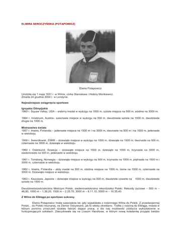 ELWIRA SEROCZYŃSKA (POTAPOWICZ) Elwira Potapowicz Urodziła się 1 maja 1931 r. w Wilnie, córka Stanisława i Heleny Monkiewicz. Zmarła 24 grudnia 2004 r. w Londynie. Najważniejsze osiągnięcia sportowe Igrzyska Olimpijskie 1960 r. Squaw Valley, USA – srebrny medal w wyścigu na 1500 m, szóste miejsce na 500 m, siódme na 3000 m; 1964 r. Innsbruck, Austria– szesnaste miejsce w wyścigu na 500 m, dwudzieste szóste na 1500 m, dwudzieste drugie na 1000 m. Mistrzostwa świata 1957 r. Imatra, Finlandia – jedenaste miejsca na 1500 m i na 3000 m, dwunaste na 500 m i na 1000 m, jedenaste w wieloboju. 1959 r. Swierdłowsk, ZSRR – dziewiąte miejsce w wyścigu na 1000 m, dziesiąte na 1500 m, dwunaste na 500 m, czternaste na 3000 m, dziesiąte w wieloboju. 1960 r. Ostersund, Szwecja – dziewiąte miejsce na 1500 m, dziesiąte na 1000 m, trzynaste na 3000 m, siedemnaste na 500 m, jedenaste w wieloboju. 1961 r. Tonsberg, Norwegia – dziewiąte miejsce w wyścigu na 500 m, trzynaste na 1000 m, piętnaste na 1500 m i 3000 m, czternaste w wieloboju. 1962 r. Imatra, Finlandia – złoty medal na 500 m, siódme miejsce na 1000 m, ósme na 1500 m, czternaste na 3000 m. Dziewiąte miejsce w wieloboju. 1963 r. Kauizawa, Japonia – dziesiąte miejsce w wyścigu na 500 m, dwudziste czwarte na szóste na 1500 m. 1000 m, dwudzieste Dwudziestosześciokrotna Mistrzyni Polski, siedemnastokrotna rekordzistka Polski. Rekordy życiowe – 500 m – 46,80, 1000 m – 1.39,20, 1500 m – 2.25.70, 3000 m – 8.11,10, 5000 m – 10.35,40. Z Wilna do Elbląga po sportowe sukcesy Elwira Potapowicz miała szesnaście lat, gdy wyjeżdżała z rodzinnego Wilna do Polski. Z przedwojennej Polski... do Polski nieznanej, na Ziemie Odzyskane, jak to wtedy określano. Trafiła z rodziną do Elbląga, miasta w którym pomimo zniszczeń działały fabryki dające pracę, a dla niej możliwość zdobycia wykształcenie w funkcjonujących szkołach. Zdecydowała się na Liceum Handlowe, w którym nową koleżankę przyjęto bardzo życzliwie. Nic w tym dziwnego, bo tacy jak ona „nie tutejsi” byli tu wszyscy. W mieście ludzie zabiegali o tworzenie podstaw normalności. Jednym z takich działań było tworzenie klubów sportowych, których głównym celem było organizowanie zajęć dla młodzieży. Elwira przypadkowo zainteresowała się łyżwiarstwem szybkim. Oto jak wspominała swoje „wyczynowe” początki w tej, jak się okazało, medalowej dla niej dyscyplinie sportu, w programie sportowym TV Elbląg, który miałem przyjemność przez kilka lat prowadzić : - Gdzieś na początku grudnia 1950 roku, przy pierwszych mrozach, moja koleżanka Baśka zapytała, czy umiem jeździć na łyżwach? Umiałam, na łyżwach przykręconych specjalną korbką do wysokich butów. W Wilnie jeździłyśmy na takich po ubitym śniegu ulic i na ślizgawkach wylewanych szlauchami przez dozorców. Basia trenowała w klubie Stal i wybierała się na obóz sportowy do Zakopanego. Mój Boże! Zobaczyć Zakopane, fajnie spędzić ferie w górach, śpiewać kolędy pod Giewontem... jeśli koniecznie trzeba, to mogę tam nawet jeździć na łyżwach, bo przecież nie z powodu sportu pragnęłam wsiąść z Baśką do pociągu. Czy mogę pojechać? Czy wezmą mnie ze sobą? Wzięli! I to był chyba moment decydujący o całym moim życiu. O tym, że zostanę sportsmenką, że poznam Jacka, przyszłego męża, że wyruszę w świat, by odnosić sukcesy, że z wylęknionej tułaczki, wypędzonej z własnego domu, stanę się osobą o twardym kręgosłupie, dumną z tego, co udało mi się w życiu dokonać... I tak Elwira pojawiła się na zgrupowaniu w Zakopanem i tam zaczęła się nawijać spirala zdarzeń sportowych, w których grała pierwszoplanowe role. Troska o sprzęt podstawą sportowych sukcesów Do programu Zimowych Igrzysk Olimpijskich w Squaw Valley po raz pierwszy w historii Olimpiad włączono łyżwiarstwo szybkie. Elwira Seroczyńska w roku 1958 urodziła syna Darka. Do przygotowań olimpijskich stanęła szczęśliwsza, mocniejsza, umotywowana do walki o sukces. Miała dla kogo walczyć o medale. 21 lutego 1960 roku na stadionie lodowym w Squaw Valley panowały idealne warunki. Słoneczna pogoda przy temperaturze minus 8 stopni i słabym wietrze pozwalała na dobre wyniki. Seroczyńska do biegu na 1500 m wystartowała w siódmej parze z Amerykanką Jeanne Omelenczuk. Już w połowie pierwszego okrążenia łatwo minęła swoją rywalkę i systematycznie powiększała nad nią przewagę. Niezagrożona minęła celownik mety w czasie 2.25,7 zaledwie o 0,2 sek gorszym od rekordu świata. Ustanowiła nowy rekord Polski i zdobyła srebrny medal olimpijski. Była o krok od kolejnego medalu w wyścigu na 1000 m, ale zabrakło przysłowiowego, sportowego szczęścia. Na ostatnim wirażu biegnąc po złoto, wjechała w roztopiony przez słońce fragment śnieżnej bandy i wywróciła się... Tak straciła swoją złotą szansę. Nic dwa razy się nie zdarza, jak mówi przysłowie. Była zaliczana do grona faworytek do medali na Igrzyskach Olimpijskich roku 1964 w Innsbrucku, ale tam wypadła znacznie poniżej swoich możliwości. Na zgrupowaniu w Berlinie przeziębiła się i ten fakt wpłynął negatywnie na jej dyspozycję. Zdecydowała o zakończeniu kariery sportowej. Dla magister Elwiry Seroczyńskiej praca trenerska stała się nową pasją Elwira bez łyżew w towarzystwie Romany Troickiej, Grzegorza Wysockiego i Heleny Pilejczyk Zdecydowała się na studia na warszawskiej AWF i pracę w charakterze instruktora w warszawskim klubie Sarmata. Powołana na selekcjonera kadry narodowej łyżwiarek szybkich (1971 – 1976) stworzyła silną grupę utalentowanych zawodniczek. Podopieczne Erwina Rysiówna, Stanisława Pietruszczak, Janina Korowicka, Ewa Malewicka i Wanda Król, nie potrafiły jednak powtórzyć olimpijskiego sukcesu swojej trenerki. Elwira Seroczyńska, jedyna polska panczenistka ze srebrnym medalem olimpijs
