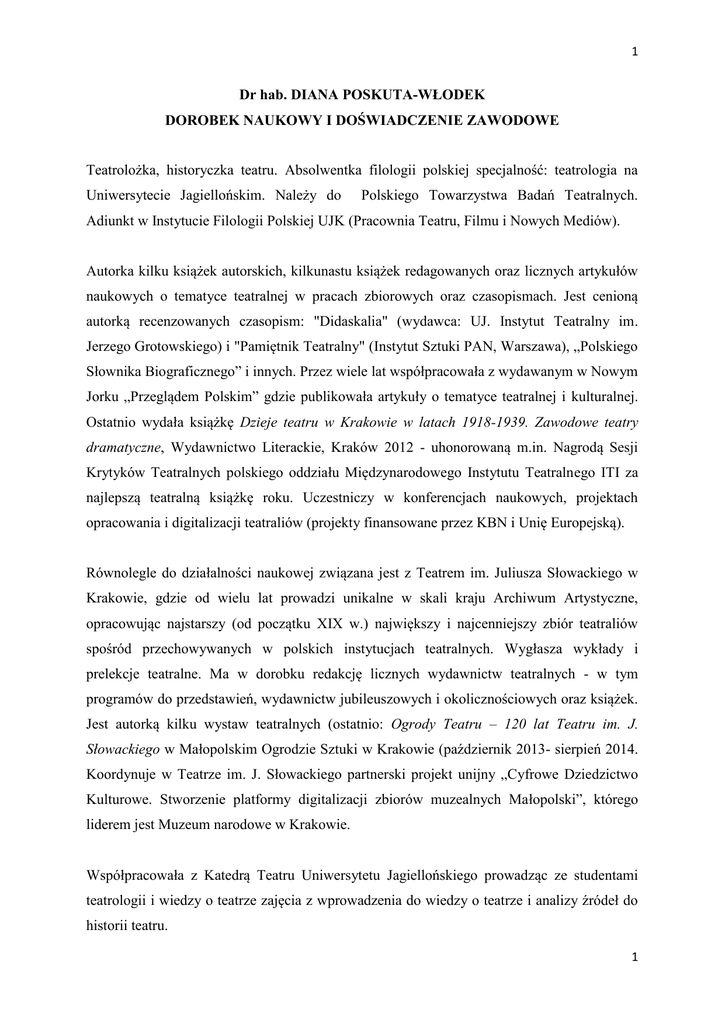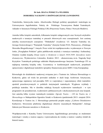 1 Dr hab. DIANA POSKUTA-WŁODEK DOROBEK NAUKOWY I DOŚWIADCZENIE ZAWODOWE Teatrolożka, historyczka teatru. Absolwentka filologii polskiej specjalność: teatrologia na Uniwersytecie Jagiellońskim. Należy do Polskiego Towarzystwa Badań Teatralnych. Adiunkt w Instytucie Filologii Polskiej UJK (Pracownia Teatru, Filmu i Nowych Mediów). Autorka kilku książek autorskich, kilkunastu książek redagowanych oraz licznych artykułów naukowych o tematyce teatralnej w pracach zbiorowych oraz czasopismach. Jest cenioną autorką recenzowanych czasopism: "Didaskalia" (wydawca: UJ. Instytut Teatralny im. Jerzego Grotowskiego) i "Pamiętnik Teatralny" (Instytut Sztuki PAN, Warszawa), „Polskiego Słownika Biograficznego” i innych. Przez wiele lat współpracowała z wydawanym w Nowym Jorku „Przeglądem Polskim” gdzie publikowała artykuły o tematyce teatralnej i kulturalnej. Ostatnio wydała książkę Dzieje teatru w Krakowie w latach 1918-1939. Zawodowe teatry dramatyczne, Wydawnictwo Literackie, Kraków 2012 - uhonorowaną m.in. Nagrodą Sesji Krytyków Teatralnych polskiego oddziału Międzynarodowego Instytutu Teatralnego ITI za najlepszą teatralną książkę roku. Uczestniczy w konferencjach naukowych, projektach opracowania i digitalizacji teatraliów (projekty finansowane przez KBN i Unię Europejską). Równolegle do działalności naukowej związana jest z Teatrem im. Juliusza Słowackiego w Krakowie, gdzie od wielu lat prowadzi unikalne w skali kraju Archiwum Artystyczne, opracowując najstarszy (od początku XIX w.) największy i najcenniejszy zbiór teatraliów spośród przechowywanych w polskich instytucjach teatralnych. Wygłasza wykłady i prelekcje teatralne. Ma w dorobku redakcję licznych wydawnictw teatralnych - w tym programów do przedstawień, wydawnictw jubileuszowych i okolicznościowych oraz książek. Jest autorką kilku wystaw teatralnych (ostatnio: Ogrody Teatru – 120 lat Teatru im. J. Słowackiego w Małopolskim Ogrodzie Sztuki w Krakowie (październik 2013- sierpień 2014. Koordynuje w Teatrze im. J. Słowackiego partnerski projekt unijny „Cyfrowe Dziedzictwo Kulturowe. Stworzenie platformy digitalizacji zbiorów muzealnych Małopolski”, którego liderem jest Muzeum narodowe w Krakowie. Współpracowała z Katedrą Teatru Uniwersytetu Jagiellońskiego prowadząc ze studentami teatrologii i wiedzy o teatrze zajęcia z wprowadzenia do wiedzy o teatrze i analizy źródeł do historii teatru. 1 2 Tematyka pracy badawczej: Teatr polski XX w. w kontekście teatru europejskiego, awangarda teatralna w dwudziestoleciu międzywojennym, nurty estetyczne inscenizacji, reżyserii i sztuki aktorskiej, historia teatrów instytucjonalnych i alternatywnych, krytyka teatralna. Projekty badawcze: 2003-2006, 2007-2010 – grant KBN: „Opracowanie ikonografii teatralnej Biblioteki Jagiellońskiej oraz Archiwum Artystycznego Teatru im. Juliusza Słowackiego w Krakowie” udział w zespole badawczym Wydziału Polonistyki UJ. Nagrody za publikacje naukowe: 2013 Nagroda Sekcji Krytyków Teatralnych Międzynarodowego Stowarzyszenia Teatralnego ITI za najlepszą książkę teatralną roku; 2013 Nominacja Polskiego Towarzystwa Badań Teatralnych do nagrody najlepszej publikacji teatralnej roku; 2013 Nagroda Krakowska Książka Miesiąca. STYPENDIA 2007 – Dwukrotnie (w I i II półroczu) Stypendium twórcze z budżetu Ministra Kultury i Dziedzictwa Narodowego. GRANTY 1. 2003-2006, udział w pierwszej edycji programu badawczo-dokumentacyjnego KBN: Opracowanie ikonografii teatralnej Biblioteki Jagiellońskiej, kierownik projektu dr hab. Marek Dębowski, prof. UJ. 2. 2007-2010, udział w drugiej edycji programu badawczo-dokumentacyjnego KBN: Opracowanie ikonografii teatralnej Biblioteki Jagiellońskiej oraz Archiwum Artystycznego i 2 3 Biblioteki Teatru im. Juliusza Słowackiego, kierownik projektu dr hab. Marek Dębowski, prof. UJ. . ODZNACZENIA 2003 – Srebrny Krzyż Zasługi 2009 – Honorowa Odznaka Zasłużony dla Kultury Polskiej przyznawana przez Ministra Kultury i Dziedzictwa Narodowego 3