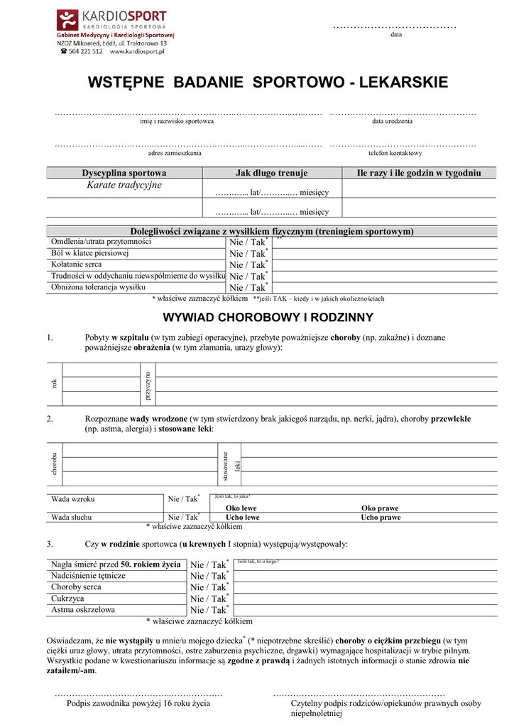 ……………………………… data WSTĘPNE BADANIE SPORTOWO - LEKARSKIE ……………………………..………………………..………………..…..…… …………………………………………… imię i nazwisko sportowca data urodzenia ……………………………..…………………………..………………....…… …………………………………………… adres zamieszkania telefon kontaktowy Dyscyplina sportowa Jak długo trenuje Karate tradycyjne Ile razy i ile godzin w tygodniu …….…... lat/………..… miesięcy …….…... lat/………..… miesięcy Dolegliwości związane z wysiłkiem fizycznym (treningiem sportowym) ** Nie / Tak* Nie / Tak* Nie / Tak* Nie / Tak* Nie / Tak* Omdlenia/utrata przytomności Ból w klatce piersiowej Kołatanie serca Trudności w oddychaniu niewspółmierne do wysiłku Obniżona tolerancja wysiłku * właściwe zaznaczyć kółkiem **jeśli TAK – kiedy i w jakich okolicznościach WYWIAD CHOROBOWY I RODZINNY przyczyna Pobyty w szpitalu (w tym zabiegi operacyjne), przebyte poważniejsze choroby (np. zakaźne) i doznane poważniejsze obrażenia (w tym złamania, urazy głowy): rok 1. Wada wzroku Wada słuchu 3. Nie / Tak* leki stosowane Rozpoznane wady wrodzone (w tym stwierdzony brak jakiegoś narządu, np. nerki, jądra), choroby przewlekłe (np. astma, alergia) i stosowane leki: choroba 2. Jeśli tak, to jaka? Oko lewe Nie / Tak* Ucho lewe * właściwe zaznaczyć kółkiem Oko prawe Ucho prawe Czy w rodzinie sportowca (u krewnych I stopnia) występują/występowały: Nagła śmierć przed 50. rokiem życia Nie / Tak* Jeśli tak, to u kogo? Nadciśnienie tętnicze Nie / Tak* Choroby serca Nie / Tak* Cukrzyca Nie / Tak* Astma oskrzelowa Nie / Tak* * właściwe zaznaczyć kółkiem Oświadczam, że nie wystąpiły u mnie/u mojego dziecka* (* niepotrzebne skreślić) choroby o ciężkim przebiegu (w tym ciężki uraz głowy, utrata przytomności, ostre zaburzenia psychiczne, drgawki) wymagające hospitalizacji w trybie pilnym. Wszystkie podane w kwestionariuszu informacje są zgodne z prawdą i żadnych istotnych informacji o stanie zdrowia nie zataiłem/-am. …………………………………..……………… Podpis zawodnika powyżej 16 roku życia …………………………………………………… Czytelny podpis rodziców/opiekunów prawnych osoby niepełnoletniej WYWIAD SPORTOWO-MEDYCZNY Aktualnie zgłaszane dolegliwości, w tym w trakcie wysiłku NIE/TAK - (jakie i w jakich okolicznościach) BADANIE PRZEDMIOTOWE Wzrost RR Masa ciała cm HR kg mmHg /min Stan ogólny dobry, budowa ciała prawidłowa, stan odżywienia prawidłowy, skóra czysta, bez wykwitów patologicznych, węzły chłonne obwodowe niepowiększone, głowa średniowymiarowa, gałki oczne prawidłowo osadzone, gardło różowe, migdałki podniebienne bez nalotów, uzębienie bez zmian próchniczych, klatka piersiowa prawidłowo wysklepiona, płuca i serce osłuchowo bez zmian, tętno udowe wyczuwalne, brzuch miękki, niebolesny, bez oporów patologicznych, wątroba i śledziona niepowiększone, objaw Goldflama obustronnie ujemny, objawy oponowe ujemne, narząd ruchu bez zmian chorobowych Odchylenia od normy w badaniu przedmiotowym: WYNIKI BADAŃ DODATKOWYCH/KONSULTACJI OB Morfologia L E Glukoza data…………………….……………………………. Badanie ogólne moczu Wynik prawidłowy – TAK/NIE - odchylenia od Hb PLT normy: Odchylenia w rozmazie białokrwinkowym data……………….…………………………………….…... EKG HR ………..…………..…/min. PQ ……………..…s QT ………………..…s. Uwagi: QTc ……………..…s. Wyniki innych badań i konsultacji Badanie/konsultacja………………………………………………………….…….….. Wniosek: (data ……………..……………) Orzeczenie: Zdolny/a do uprawiania sportu do ………………………………..…………….. r. ……………………………………………………. pieczątka i podpis WYDANE SKIEROWANIA NA BADANIA I KONSULTACJE OB, morfologia, glukoza, mocz Spoczynkowe EKG Próba wysiłkowa EKG RTG KRĘGOSŁUPA EEG + NEUROLOG Spirometria STOMATOLOG OKULISTA LARYNGOLOG Inne