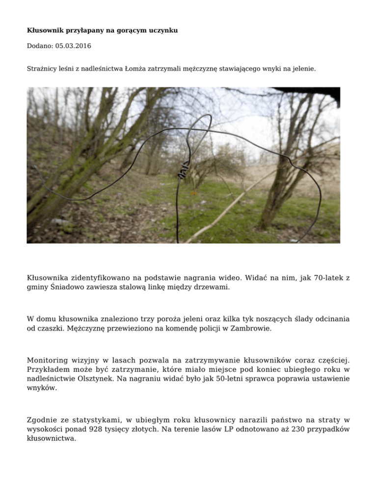 Kłusownik przyłapany na gorącym uczynku Dodano: 05.03.2016 Strażnicy leśni z nadleśnictwa Łomża zatrzymali mężczyznę stawiającego wnyki na jelenie. Kłusownika zidentyfikowano na podstawie nagrania wideo. Widać na nim, jak 70-latek z gminy Śniadowo zawiesza stalową linkę między drzewami. W domu kłusownika znaleziono trzy poroża jeleni oraz kilka tyk noszących ślady odcinania od czaszki. Mężczyznę przewieziono na komendę policji w Zambrowie. Monitoring wizyjny w lasach pozwala na zatrzymywanie kłusowników coraz częściej. Przykładem może być zatrzymanie, które miało miejsce pod koniec ubiegłego roku w nadleśnictwie Olsztynek. Na nagraniu widać było jak 50-letni sprawca poprawia ustawienie wnyków. Zgodnie ze statystykami, w ubiegłym roku kłusownicy narazili państwo na straty w wysokości ponad 928 tysięcy złotych. Na terenie lasów LP odnotowano aż 230 przypadków kłusownictwa. Najczęściej ofiarą kłusowników padają jelenie, a następnie sarny, dziki, daniele i łosie. Sprawcy zwykle używają wnyków w ktorych zwierzyna ginie powolną, wielogodzinną śmiercią. Rzadziej używana jest broń palna. Wszystko to dzieje się pomimo wysokich kar nakładanych na kłusowników. Za przestępstwo grozi do 5 lat pozbawienia wolności, grzywna do 20 tys. złotych i przepadek mienia użytego do wykonania czynu zabronionego. Informacje: Lasy Państwowe Komentarze (0) Nie dodano jeszcze żadnego komentarza.
