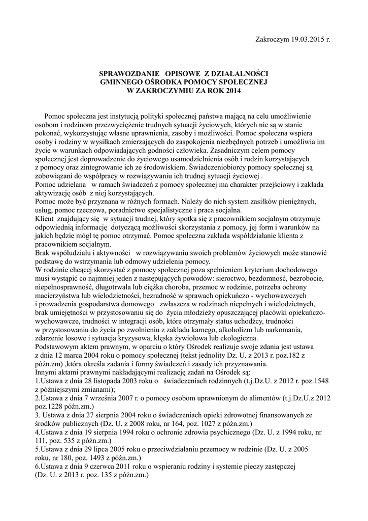 Zakroczym 19.03.2015 r. SPRAWOZDANIE OPISOWE Z DZIAŁALNOŚCI GMINNEGO OŚRODKA POMOCY SPOŁECZNEJ W ZAKROCZYMIU ZA ROK 2014 Pomoc społeczna jest instytucją polityki społecznej państwa mającą na celu umożliwienie osobom i rodzinom przezwyciężenie trudnych sytuacji życiowych, których nie są w stanie pokonać, wykorzystując własne uprawnienia, zasoby i możliwości. Pomoc społeczna wspiera osoby i rodziny w wysiłkach zmierzających do zaspokojenia niezbędnych potrzeb i umożliwia im życie w warunkach odpowiadających godności człowieka. Zasadniczym celem pomocy społecznej jest doprowadzenie do życiowego usamodzielnienia osób i rodzin korzystających z pomocy oraz zintegrowanie ich ze środowiskiem. Świadczeniobiorcy pomocy społecznej są zobowiązani do współpracy w rozwiązywaniu ich trudnej sytuacji życiowej . Pomoc udzielana w ramach świadczeń z pomocy społecznej ma charakter przejściowy i zakłada aktywizację osób z niej korzystających. Pomoc może być przyznana w różnych formach. Należy do nich system zasiłków pieniężnych, usług, pomoc rzeczowa, poradnictwo specjalistyczne i praca socjalna. Klient znajdujący się w sytuacji trudnej, który spotka się z pracownikiem socjalnym otrzymuje odpowiednią informację dotyczącą możliwości skorzystania z pomocy, jej form i warunków na jakich będzie mógł tę pomoc otrzymać. Pomoc społeczna zakłada współdziałanie klienta z pracownikiem socjalnym. Brak współudziału i aktywności w rozwiązywaniu swoich problemów życiowych może stanowić podstawę do wstrzymania lub odmowy udzielenia pomocy. W rodzinie chcącej skorzystać z pomocy społecznej poza spełnieniem kryterium dochodowego musi wystąpić co najmniej jeden z następujących powodów: sieroctwo, bezdomność, bezrobocie, niepełnosprawność, długotrwała lub ciężka choroba, przemoc w rodzinie, potrzeba ochrony macierzyństwa lub wielodzietności, bezradność w sprawach opiekuńczo - wychowawczych i prowadzenia gospodarstwa domowego zwłaszcza w rodzinach niepełnych i wielodzietnych, brak umiejętności w przystosowaniu się do życia młodzieży opuszczającej placówki opiekuńczowychowawcze, trudności w integracji osób, które otrzymały status uchodźcy, trudności w przystosowaniu do życia po zwolnieniu z zakładu karnego, alkoholizm lub narkomania, zdarzenie losowe i sytuacja kryzysowa, klęska żywiołowa lub ekologiczna. Podstawowym aktem prawnym, w oparciu o który Ośrodek realizuje swoje zdania jest ustawa z dnia 12 marca 2004 roku o pomocy społecznej (tekst jednolity Dz. U. z 2013 r. poz.182 z późn.zm) ,która określa zadania i formy świadczeń i zasady ich przyznawania. Innymi aktami prawnymi nakładającymi realizację zadań na Ośrodek są: 1.Ustawa z dnia 28 listopada 2003 roku o świadczeniach rodzinnych (t.j.Dz.U. z 2012 r. poz.1548 z późniejszymi zmianami); 2.Ustawa z dnia 7 września 2007 r. o pomocy osobom uprawnionym do alimentów (t.j.Dz.U.z 2012 poz.1228 późn.zm.) 3. Ustawa z dnia 27 sierpnia 2004 roku o świadczeniach opieki zdrowotnej finansowanych ze środków publicznych (Dz. U. z 2008 roku, nr 164, poz. 1027 z późn.zm.) 4.Ustawa z dnia 19 sierpnia 1994 roku o ochronie zdrowia psychicznego (Dz. U. z 1994 roku, nr 111, poz. 535 z późn.zm.) 5.Ustawa z dnia 29 lipca 2005 roku o przeciwdziałaniu przemocy w rodzinie (Dz. U. z 2005 roku, nr 180, poz. 1493 z późn.zm.) 6.Ustawa z dnia 9 czerwca 2011 roku o wspieraniu rodziny i systemie pieczy zastępczej (Dz. U. z 2013 r. poz. 135 z późn.zm.) Udzielana pomoc kierowana jest do indywidualnego klienta/rodziny – mieszkańców gminy Zakroczym. Przyznanie pomocy następuje na podstawie złożonego wniosku w formie decyzji administracyjnej. W sprawach świadczeń pomocy społecznej w 2014 r. wydano 4223 decyzje administracyjne. Każda wydana decyzja poprzedzona jest wywiadem środowiskowym przeprowadzonym przez pracownika socjalnego w miejscu zamieszkania /pobytu klienta/rodziny. Jedynie udzielenie świadczeń w postaci pracy socjalnej i poradnictwa nie wymaga wydania decyzji. W sytuacjach w których stwierdzamy marnotrawienie środków finansowych lub bezradność w prowadzeniu gospodarstwa domowego , świadczenia pomocowe są realizowane w formie niepieniężnej. STRUKTURA ZATRUDNIENIA W Gminnym Ośrodku Pomocy Społecznej według stanu na dzień 31.12.2014 r. zatrudnionych było 13 pracowników w pełnym wymiarze czasu pracy w ramach umowy, 1 osoba na ½ etatu , 1 osoba na ¼ etatu w tym Asystent rodziny w 75% finansowany był ze środków pozyskanych w ramach Resortowego programu wspierania rodziny i systemu pieczy zastępczej na rok 2014. z tego: Struktura zatrudnienia Liczba osób Liczba etatów (osoby zatrudnione na umowę o pacę ) OGÓŁEM 15 13,75 Kierownik GOPS 1 1 Główna Księgowa 1 1 Starszy specjalista pracy socjalnej 1 1 Starszy pracownik socjalny 4 3,5 Asystent rodziny 1 1 Stanowiska urzędnicze ds. świadczeń rodzinnych i funduszu alimentacyjnego 2 2 Stanowisko urzędnicze ds. ogólnoorganizacyjnych 1 1 Opiekunki środowiskowe 3 3 Informatyk 1 0,25 REALIZACJA ZADAŃ Z ZAKRESU POMOCY SPOŁECZNEJ W roku sprawozdawczym pomocą społeczną w postaci świadczeń pieniężnych i niepieniężnych objęto w Gminie Zakroczym 1277 osób w 503 rodzinach. Rodziny te korzystały z szeroko rozumianej pomocy społecznej tj. m.in. z : - pracy socjalnej, poradnictwa prawnego, załatwiania spraw w urzędach , sądach , orzecznictwie do spraw niepełnosprawności, ustalania uprawnień do rent, emerytur . Ponadto pracownicy Ośrodka przeprowadzali wywiady alimentacyjne dla innych ośrodków, wydawali opinie i informacje (po przeprowadzeniu wywiadu) dla PCPR, Policji, sądów i innych uprawnionych instytucji. Wśród klientów Ośrodka dominują osoby mające trudności z funkcjonowaniem społecznym, u których występują problemy rodzinne, zdrowotne i prawne . Wiele rodzin w szuka w Ośrodku informacji na temat możliwości skorzyst