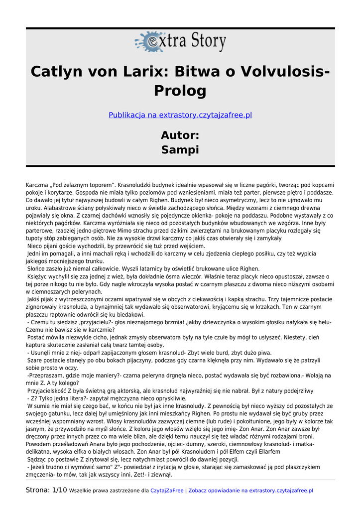 Catlyn von Larix: Bitwa o VolvulosisProlog Publikacja na extrastory.czytajzafree.pl Autor: Sampi Karczma „Pod żelaznym toporem”. Krasnoludzki budynek idealnie wpasował się w liczne pagórki, tworząc pod kopcami pokoje i korytarze. Gospoda nie miała tylko poziomów pod wzniesieniami, miała też parter, pierwsze piętro i poddasze. Co dawało jej tytuł najwyższej budowli w całym Righen. Budynek był nieco asymetryczny, lecz to nie ujmowało mu uroku. Alabastrowe ściany połyskiwały nieco w świetle zachodzącego słońca. Między wzorami z ciemnego drewna pojawiały się okna. Z czarnej dachówki wznosiły się pojedyncze okienka- pokoje na poddaszu. Podobne wystawały z co niektórych pagórków. Karczma wyróżniała się nieco od pozostałych budynków wbudowanych we wzgórza. Inne były parterowe, rzadziej jedno-piętrowe Mimo strachu przed dzikimi zwierzętami na brukowanym placyku rozlegały się tupoty stóp zabieganych osób. Nie za wysokie drzwi karczmy co jakiś czas otwierały się i zamykały Nieco pijani goście wychodzili, by przewrócić się tuż przed wejściem. Jedni im pomagali, a inni machali ręką i wchodzili do karczmy w celu zjedzenia ciepłego posiłku, czy też wypicia jakiegoś mocniejszego trunku. Słońce zaszło już niemal całkowicie. Wyszli latarnicy by oświetlić brukowane ulice Righen. Księżyc wychylił się zza jednej z wież, była dokładnie ósma wieczór. Właśnie teraz placyk nieco opustoszał, zawsze o tej porze nikogo tu nie było. Gdy nagle wkroczyła wysoka postać w czarnym płaszczu z dwoma nieco niższymi osobami w ciemnoszarych pelerynach. Jakiś pijak z wytrzeszczonymi oczami wpatrywał się w obcych z ciekawością i kapką strachu. Trzy tajemnicze postacie zignorowały krasnoluda, a bynajmniej tak wydawało się obserwatorowi, kryjącemu się w krzakach. Ten w czarnym płaszczu raptownie odwrócił się ku biedakowi. - Czemu tu siedzisz ,przyjacielu?- głos nieznajomego brzmiał ,jakby dziewczynka o wysokim głosiku nałykała się heluCzemu nie bawisz sie w karczmie? Postać mówiła niezwykle cicho, jednak zmysły obserwatora były na tyle czułe by mógł to usłyszeć. Niestety, cień kaptura skutecznie zasłaniał całą twarz tamtej osoby. - Usunęli mnie z niej- odparł zapijaczonym głosem krasnolud- Zbyt wiele burd, zbyt dużo piwa. Szare postacie stanęły po obu bokach pijaczyny, podczas gdy czarna klęknęła przy nim. Wydawało się że patrzyli sobie prosto w oczy. -Przepraszam, gdzie moje maniery?- czarna peleryna drgnęła nieco, postać wydawała się być rozbawiona.- Wołają na mnie Z. A ty kolego? Przyjacielskość Z była świetną grą aktorską, ale krasnolud najwyraźniej się nie nabrał. Był z natury podejrzliwy - Z? Tylko jedna litera?- zapytał mężczyzna nieco opryskliwie. W sumie nie miał się czego bać, w końcu nie był jak inne krasnoludy. Z pewnością był nieco wyższy od pozostałych ze swojego gatunku, lecz dalej był umięśniony jak inni mieszkańcy Righen. Po prostu nie wydawał się być gruby przez wcześniej wspomniany wzrost. Włosy krasnoludów zazwyczaj ciemne (lub rude) i pokołtunione, jego były w kolorze tak jasnym, że przywodziło na myśl słońce. Z koloru jego włosów wzięło się jego imię- Zon Anar. Zon Anar zawsze był dręczony przez innych przez co ma wiele blizn, ale dzięki temu nauczył się też władać różnymi rodzajami broni. Powodem prześladowań Anara było jego pochodzenie, ojciec- dumny, szeroki, ciemnowłosy krasnolud- i matkadelikatna, wysoka elfka o białych włosach. Zon Anar był pół Krasnoludem i pół Elfem czyli Ellarfem Sądząc po postawie Z zirytował się, lecz natychmiast powrócił do dawniej pozycji. - Jeżeli trudno ci wymówić samo" Z"- powiedział z irytacją w głosie, starając się zamaskować ją pod płaszczykiem zmęczenia- to mów, tak jak wszyscy inni, Zet!- i ziewnął. Strona: 1/10 Wszelkie prawa zastrzeżone dla CzytajZaFree | Zobacz opowiadanie na extrastory.czytajzafree.pl - Och wybacz mi panie lub panienko Zet- odparł młody Ellarf. Zon Anar nie był pijany, wcześniej tylko udawał. - Panie... lub panienko?! - Krzyk Z wytrącił z równowagi również szare postacie. Natomiast Zon śmiał się, obserwując ptaki uciekające z koron drzew spłoszone krzykiem Z. Obserwator musiał zakryć uszy. Anar poczekał kilka minut( aż minie gniew Zet) i powiedział: - No tak, przecież twoją mor... twarz zakrywa ten kaptur- wskazał palcem na ciemny materiał- a taki głos może mieć każdy kto ma na sobie syntezator głosu. Taki jak twój na lewym nadgarstku. Nawet obserawor nie zdołał go wcześniej dostrzec, bowiem srebrna bransoletka była skryta pod długim rękawem bluzki. Zarówno Zet i szare postacie jak i obserwator byli zdziwieni spostrzegawczością Ellarfa. - No cóż...- szepnął Z- w takim wypadku pokażę ci. Nagłym ruchem ręki Zet ściągnął kaptur z pod którego wysypały się ciemne, długie loki. Oprócz loków pod kapturem było schowane jeszcze coś- szare kocie uszy. Więc Zet jest kotołakiem. - Więc jednak panienka...- mruknął Zon Anar. W następnej chwili Z już narzuciła kaptur na głowę chowając swoje loki. Jednak źle założyła kaptur, bo jej uszka odstawały, tworząc dwie ostro zkończone górki na jej głowie. - Niech któryś z was mi pomoże!- warknęła do swoich towarzyszy. Obie szare postacie natychmiastowo doskoczyły do Zet i obydwoje przyklepali po jednym uchu do jej głowy. - Zadowolony?- zapytała Zona.- Nie zapominaj, że nie odpowiedziałeś mi na pytanie.- Z pomachała mu palcem udając ,że grozi. Zon nie wiedział co, ale coś kazało mu skłamać. Może to jego instynkt samozachowawczy? W końcu kto zaakceptuje jakąś hybrydę? W całym Righen nie było innego Ellarfa. Zresztą wszyscy mieszkańcy znali jego imię i straszyli nim dzieci, przez co Zon Anar nie miał żadnych przyjaciół. No prawie żadnych, kilka lat temu mieszkał tu jasnowłosy ch