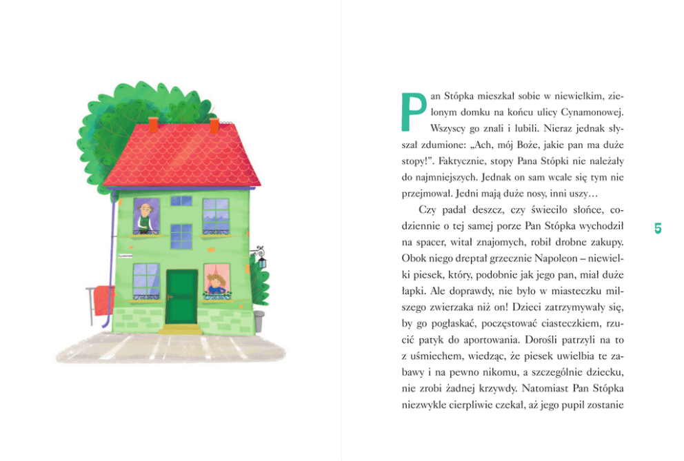 P an Stópka mieszkał sobie w niewielkim, zielonym domku na końcu ulicy Cynamonowej. Wszyscy go znali i lubili. Nieraz jednak sły- szał zdumione: „Ach, mój Boże, jakie pan ma duże stopy!”. Faktycznie, stopy Pana Stópki nie należały do najmniejszych. Jednak on sam wcale się tym nie przejmował. Jedni mają duże nosy, inni uszy… Czy padał deszcz, czy świeciło słońce, codziennie o tej samej porze Pan Stópka wychodził na spacer, witał znajomych, robił drobne zakupy. Obok niego dreptał grzecznie Napoleon – niewielki piesek, który, podobnie jak jego pan, miał duże łapki. Ale doprawdy, nie było w miasteczku milszego zwierzaka niż on! Dzieci zatrzymywały się, by go pogłaskać, poczęstować ciasteczkiem, rzucić patyk do aportowania. Dorośli patrzyli na to z uśmiechem, wiedząc, że piesek uwielbia te zabawy i na pewno nikomu, a szczególnie dziecku, nie zrobi żadnej krzywdy. Natomiast Pan Stópka niezwykle cierpliwie czekał, aż jego pupil zostanie 5 wygłaskany, wychwalony i nakarmiony smakołykami. Dopiero potem obaj ruszali w swoją stronę. Tego dnia Pan Stópka wybrał się nad rzekę. Napoleon uwielbiał pływać. Ledwie minęli karłowatą wierzbę, duży kamień i głęboki dół, a pies wskoczył do rzeki, rozpryskując fontannę lśniących kropelek. Pan Stópka usiadł na trawie i wyjął z kieszeni gazetę. Jednak nie dane mu było zagłębić się w lekturę, bo nagle coś okropnie mokrego pacnęło tuż obok. I to wprost z pyska Napoleona! Bynajmniej nie była to wielka ryba ani nawet żaba czy wydra. Pan Stópka 6 zerknął na nieszczęsne stworzenie i mruknął z głębo- 7 kim współczuciem: – Biedactwo! Stworzonko było bardzo przerażone, ale nie miało siły uciekać. Widok psa dodatkowo je paraliżował. – Pójdziemy do weterynarza. Niech obejrzy topielca, a wtedy zastanowimy się co dalej… – powiedział Pan Stópka trochę do siebie, a trochę do psa. Trzęsło się więc okropnie i wydawało co chwilę piskliwe dźwięki niczym śmiertelnie wystraszona mysz- *** ka. Napoleon przysiadł i czekał cierpliwie na to, co Napoleon nie przepadał za weterynarzem, za- uczyni jego pan. Pan Stópka, nie namyślając się wiele, pachem unoszącym się w jego gabinecie, widokiem zdjął marynarkę, swoją najlepszą niedzielną marynar- lekarstw, strzykawek i innych dziwnych przyrządów, kę, i okrył nieszczęśnika. Napoleon zamachał ogonem których wiele się tam znajdowało. Czuł jednak, że nie- z radości, jakby właśnie tego od swego pana oczekiwał. szczęśnik uratowany przez niego z rzeki potrzebuje pomocy. Weterynarz przypominający Świętego Miko- piękny wygląd i okazał się… kotem! Nie, nie żeby łaja (Napoleon był pewien, że to Mikołaj, który poza Napoleon miał coś przeciwko kotom, wszak z kil- sezonem świątecznym prowadzi lecznicę dla zwie- koma się nawet przyjaźnił, choćby z Kocią Mordką rząt) natychmiast zainteresował się losem niedoszłe- czy Urwisem, lecz co innego spotykać je przelotnie go topielca. na ulicy, a co innego dzielić z takim przytulny kącik – Tak, tak – mruczał pod nosem. – Tak, tak. Nie- w domu Pana Stópki. A wyglądało na to, że jego wła- chybnie groziłoby nieszczęśnikowi coś najgorszego… ściciel ma wielką ochotę przygarnąć topielca. Jakby Ale na szczęście. Na szczęście Napoleon w porę wy- na potwierdzenie obaw Napoleona jego pan pogła- ciągnął go z wody. Dzielny pies! Dzielny! skał kota po kształtnym łebku i powiedział: Napoleon był zadowolony, że dzisiaj nie przeby- 8 – Jest fantastyczny. Przygarniemy go! wa tu jako pacjent, lecz wybawca i bohater. Nieszczę- – To szlachetne z pana strony – ucieszył się wete- śnik po wysuszeniu i uczesaniu futerka odzyskał swój rynarz. – Kot na pewno będzie panu bardzo wdzięczny. W długie zimowe wieczory będzie ogrzewał panu stopy. – Weterynarz spojrzał wymownie na buty Pana Stópki. – No, może przydałyby się dwa koty… Pan Stópka roześmiał się, bo miał ogromne poczucie humoru i nigdy się nie gniewał, gdy ktoś robił uwagi na temat wielkości jego stóp. – Jak pan go nazwie? – zapytał weterynarz, zakładając kotu w prezencie piękną niebieską obrożę. – Jeszcze nie wiem – odpowiedział Pan Stópka. „Ale ja wiem!” – szczeknął Napoleon. „I niech sobie idzie swoją drogą!” 9 – Cicho, piesku. Już wychodzimy. – Pan Stópka – Napoleonie, cóż to za mina? Boli cię ząb? Mam podrapał Napoleona za uchem. – Mam nadzieję, że nadzieję, że zaprzyjaźnisz się z… Zaraz… jak by cię zaprzyjaźnisz się z nowym domownikiem. nazwać… Pan Stópka wziął kota na ręce i przysiadł z nim *** Napoleon obserwował Pana Stópkę. Legowisko dla kota miało znajdować się niemal obok psiego. Nowy domownik przyglądał się Napoleonowi z wysokości fotela. Pies czuł całym sobą, że to niesprawie- 10 w fotelu. Tego dla Napoleona było za wiele. Nie wytrzymał i podbiegł, aby również i jego wzięto na kolana i drapano za uchem. Kot natychmiast zjeżył sierść na grzbiecie i prychnął groźnie. Napoleon zawarczał. dliwe! Do tej pory tylko Pan Stópka mógł siedzieć na – Oj, zwierzaki, zwierzaki… – uśmiechnął się owym niezmiernie wygodnym i obszernym siedze- Pan Stópka. – Mam nadzieję, że dojdziecie do porozu- niu. Napoleon to wiedział, bo raz udało mu się zająć mienia. Wszak starczy tu miejsca dla nas wszystkich. to miejsce, z czego pan nie był zadowolony. Czy teraz Przyjrzał się kotu, który od czubków uszu do koń- nie widzi, jak ten kot się rządzi? – A to twoja miseczka na karmę. – Pan Stópka postawił obok kociego legowiska naczynie z obrazkiem rybiej ości, a przy nim drugie na wodę. „Ja mam zwykłą miseczkę. Żadnych obrazków. Choćby nalepki z kością”. – Napoleon nie miał pojęcia, że najzwyczajniej w świecie jest zazdrosny. Cóż, do tej pory nie było do tego okazji. Nie mia
