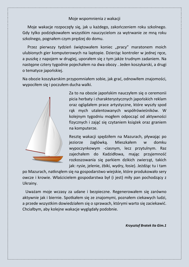 Moje wspomnienia z wakacji Moje wakacje rozpoczęły się, jak u każdego, zakończeniem roku szkolnego. Gdy tylko podziękowałem wszystkim nauczycielom za wytrwanie ze mną roku szkolnego, pognałem czym prędzej do domu. Przez pierwszy tydzień świętowałem koniec „pracy” maratonem moich ulubionych gier komputerowych na laptopie. Dzierżąc kontroler w jednej ręce, a puszkę z napojem w drugiej, uporałem się z tym jakże trudnym zadaniem. Na następne cztery tygodnie pojechałem na dwa obozy . Jeden koszykarski, a drugi o tematyce japońskiej. Na obozie koszykarskim przypomniałem sobie, jak grać, odnowiłem znajomości, wypociłem się i poczułem ducha walki. Za to na obozie japońskim nauczyłem się o ceremonii picia herbaty i charakterystycznych japońskich reklam oraz oglądałem prace artystyczne, które wyszły spod rąk mych utalentowanych współrówieśników. W kolejnym tygodniu mogłem odpocząć od aktywności fizycznych i zająć się czytaniem książek oraz graniem na komputerze. Resztę wakacji spędziłem na Mazurach, pływając po jeziorze żaglówką. Mieszkałem w domku wypoczynkowym -ciasnym, lecz przytulnym. Raz zajechałem do Kadzidłowa, mając przyjemność rozkoszowania się parkiem dzikich zwierząt, takich jak: rysie, jelenie, żbiki, wydry, łosie). Jeżdżąc tu i tam po Mazurach, natknąłem się na gospodarstwo wiejskie, które produkowało sery owcze i krowie. Właścicielem gospodarstwa był (i jest) miły pan pochodzący z Ukrainy. Uważam moje wczasy za udane i bezpieczne. Regenerowałem się zarówno aktywnie jak i biernie. Spotkałem się ze znajomymi, poznałem ciekawych ludzi, a przede wszystkim dowiedziałem się o sprawach, którymi warto się zaciekawić. Chciałbym, aby kolejne wakacje wyglądały podobnie. Krzysztof Bratek IIa Gim.1
