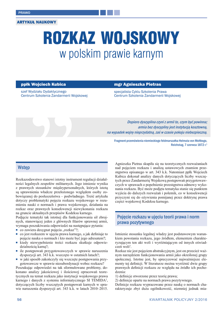 prawo artykuł naukowy Rozkaz wojskowy w polskim prawie karnym ppłk Wojciech Kubica mgr Agnieszka Pietras szef Wydziału Dydaktycznego Centrum Szkolenia Żandarmerii Wojskowej specjalista Cyklu Szkolenia Prawa Centrum Szkolenia Żandarmerii Wojskowej Dopiero dyscyplina czyni z armii to, czym być powinna; armia bez dyscypliny jest instytucją kosztowną, na wypadek wojny nieprzydatną, zaś w czasie pokoju niebezpieczną. Fragment przemówienia niemieckiego feldmarszałka Helmuta von Moltkego, Reichstag, 7 czerwca 1872 r.1 Wstęp Rozkazodawstwo stanowi istotny instrument regulacji działalności legalnych zespołów militarnych. Jego istnienie wynika z prawnych stosunków międzypersonalnych, których istotą są uprawnienia władcze przełożonego względem osoby zobowiązanej do posłuszeństwa – podwładnego. Treść artykułu dotyczy problematyki pojęcia rozkazu wojskowego w rozumieniu nauki o normach i prawa wojskowego, działania na rozkaz oraz prawnych konsekwencji niewykonania rozkazu na gruncie aktualnych przepisów Kodeksu karnego.1 Podjęcie tematyki tak istotnej dla funkcjonowania sił zbrojnych, stanowiącej jeden z głównych filarów sprawnej armii, wymaga poszukiwania odpowiedzi na następujące pytania: ▪▪ co zawiera desygnat pojęcia „rozkaz”?; ▪▪ co jest rozkazem w ujęciu prawa karnego, a jak definiuje to pojęcie nauka o normach i kto może być jego adresatem?; ▪▪ kiedy niewypełnienie treści rozkazu skutkuje odpowiedzialnością karną?; ▪▪ ile postępowań przygotowawczych w sprawie naruszenia dyspozycji art. 343 k.k. wszczęto w ostatnich latach?; ▪▪ w jaki sposób zakończyły się wszczęte postępowania przygotowawcze w sprawie niesubordynacji wobec rozkazu? Poszukując odpowiedzi na tak sformułowane problemy, dokonano analizy jakościowej i ilościowej opracowań teoretycznych na temat rozkazu jako instytucji wojskowego prawa karnego i danych z systemu informatycznego SI TEMIDA2, dotyczących liczby wszczętych postępowań karnych w sprawie naruszenia dyspozycji art. 343 k.k. w latach 2010–2015. 56 Agnieszka Pietras skupiła się na teoretycznych rozważaniach nad pojęciem rozkazu i analizą ustawowych znamion przestępstwa opisanego w art. 343 k.k. Natomiast ppłk Wojciech Kubica dokonał analizy danych dotyczących liczby wszczętych przez Żandarmerię Wojskową postępowań przygotowawczych w sprawach o popełnienie przestępstwa odmowy wykonania rozkazu. Być może podjęta tematyka stanie się punktem wyjścia do dalszych rozważań i polemik, co w konsekwencji przyczyni się do ożywienia pomijanej przez doktrynę prawa części wojskowej Kodeksu karnego. Pojęcie rozkazu w ujęciu teorii prawa i norm prawa pozytywnego Istnienie stosunku legalnej władzy jest podstawowym warunkiem powstania rozkazu, jego źródłem, elementem charakteryzującym ten akt woli i wyróżniającym od innych oświadczeń woli3. Rozkaz nie jest pojęciem abstrakcyjnym, jest on przecież ważnym narzędziem funkcjonowania armii jako określonej grupy społecznej. Istotne jest, by sprecyzować najważniejsze elementy tej definicji. W literaturze można wyróżnić dwie grupy prawnych definicji rozkazu ze względu na źródło ich pochodzenia: 1)definicje stworzone przez teorię prawa; 2)definicje oparte na normach prawa pozytywnego. Definicje rozkazu wypracowane przez naukę o normach charakteryzuje zbyt duża ogólnikowość, niemniej jednak miaKWARTALNIK POLICYJNY 2/2016 prawo rozkaz wojskowy w prawie karnym ły one dość duży wpływ na kształtowanie się tego pojęcia w ujęciu przepisów wojskowych i prawnokarnym zakresie. Tak np. według Czesława Znamierowskiego rozkaz jest to pewien szczególny gatunek stanowienia, stanowienie reguły postępowania dla innych ludzi4. Podobne sformułowanie prezentuje Stanisław Cheliński, według którego rozkaz to jednostronne ustanowienie normy zobowiązującej5, a więc adresowana jest ona do kogoś innego. Pierwsze definicje rozkazu na gruncie polskiego prawa sformułowano w okresie międzywojennym, a w swej treści nawiązywały one do przepisów prawa wojskowego i karnego. Rozkaz rozumiany był jako „jednostronne, kategoryczne (stanowcze) oświadczenie woli przełożonego (rozkazującego)”6. Inna grupa definicji opierała się na kryteriach leksykalnych, według których „rozkaz to polecenie określonego działania lub zaniechania”, „wydanie polecenia podwładnemu, podkomendnemu”7. Prezentowane przykłady nie zawierały w swej treści wszystkich elementów właściwych dla rozkazu. Stwierdzenie, że rozkaz stanowi „oświadczenie woli przełożonego”, jest bardzo płynne. Także i „jednostronność” nie jest swoistą cechą rozkazu, gdyż nie pozwala na odróżnienie rozkazu od innych jednostronnych oświadczeń woli. W zorganizowanym pod względem prawnym społeczeństwie często spotykamy się bowiem ze stosunkiem zwierzchnictwa i podporządkowania. Co do zasady zwierzchnicy w zakresie swoich uprawnień podejmują decyzje wykonywane przez podwładnych. Rodzi się zatem pytanie: czy zawsze i we wszystkich strukturach społecznych akty woli zwierzchników kierowane do podwładnych są rozkazami w rozumieniu wojskowego prawa karnego i administracyjnego? Z punktu widzenia aktu rozkazodawczego ważne jest istnienie dwóch jego członów: 1)działanie rozkazującego (wydanie rozkazu, rozkazywanie); 2)treść nakazanego zachowania się rozkazobiorcy (norma rozkazowa – treść rozkazu). W zależności od tego, na który z tych elementów rozkazu będzie położony nacisk, różnie będzie się kształtować jego pojęcie. A zatem patrząc od strony działania rozkazującego, ważna będzie wola rozkazującego, natomiast patrząc od strony treści – polecenie. W obu przypadkach rozkaz ma charakter jednostronny, ale doskonale wiemy, że dopiero połączenie tych dwóch elementów – wyrażenia woli i treści nakazanej czynności – tworzy powinność i narzucenie woli jednego p