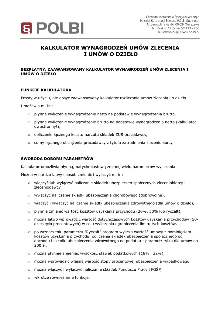 KALKULATOR WYNAGRODZEŃ UMÓW ZLECENIA I UMÓW O DZIEŁO BEZPŁATNY, ZAAWANSOWANY KALKULATOR WYNAGRODZEŃ UMÓW ZLECENIA I UMÓW O DZIEŁO FUNKCJE KALKULATORA Prosty w użyciu, ale dosyć zaawansowany kalkulator rozliczania umów zlecenia i o dzieło. Umożliwia m. in.: • płynne wyliczenie wynagrodzenie netto na podstawie wynagrodzenia brutto, • płynne wyliczenie wynagrodzenie brutto na podstawie wynagrodzenia netto (kalkulator dwustronny!), • obliczenie łącznego kosztu narzutu składek ZUS pracodawcy, • sumy łącznego obciążenia pracodawcy z tytułu zatrudnienia zleceniobiorcy. SWOBODA DOBORU PARAMETRÓW Kalkulator umożliwia płynną, natychmiastową zmianę wielu parametrów wyliczania. Można w bardzo łatwy sposób zmienić i wyliczyć m. in: • włączyć lub wyłączyć naliczanie składek ubezpieczeń społecznych zleceniobiorcy i zleceniodawcy, • wyłączyć naliczanie składki ubezpieczenia chorobowego (dobrowolne), • włączyć i wyłączyć naliczanie składki ubezpieczenia zdrowotnego (dla umów o dzieło), • płynnie zmienić wartość kosztów uzyskania przychodu (20%, 50% lub ryczałt), • można łatwo wprowadzić wartość dotychczasowych kosztów uzyskania przychodów (50dziesięcio procentowych) w celu wyliczenia ograniczenia limitu tych kosztów, • po zaznaczeniu parametru "Ryczałt" program wylicza wartość umowy z pominięciem kosztów uzyskania przychodu, odliczenia składek ubezpieczenia społecznego od dochodu i składki ubezpieczenia zdrowotnego od podatku - parametr tylko dla umów do 200 zł, • można płynnie zmieniać wysokość stawek podatkowych (18% i 32%), • można wprowadzić własną wartość stopy procentowej ubezpieczenia wypadkowego, • można włączyć i wyłączyć naliczanie składek Funduszu Pracy i FGŚP, • wkrótce również inne funkcje. ZASTOSOWANIE KALKULATORA Program ma bardzo uniwersalne zastosowanie. Może być używany: • jako pomoc dla szybkiego ustalania wartości wynagrodzenia brutto dla zadanej wartości wynagrodzenia netto, • jako kalkulator dla szybkiego wyliczenia łącznego kosztu zatrudnienia zleceniobiorcy, • w działach kadrowo-płacowych do łatwego wyliczenia wynagrodzeń netto zleceniobiorców wraz z narzutem kosztów ZUS pracodawcy (przy łatwym wyborze różnego rodzaju parametrów wyliczeniowych) dla umów zlecenia i o dzieło. CO NOWEGO W WERSJI - UAKTUALNIENIA Aktualna wersja: 2.3 (aktualizacja z wersji 2.2) Data publikacji: 15 września 2015 r. UWAGA: Jeżeli dokonujecie Państwo aktualizacji wersji kalkulatora to konieczne jest ręczne usunięcie wersji poprzedniej! (np. pod Windows 7 można tego dokonać w sposób następujący: klikamy przycisk "Start" - potem "Panel sterowania" - potem "Programy i funkcje" a następnie poprzez kliknięcie PPM na liście programów na kalkulatorze wybieramy z menu "Usuń"). Opis zmian: 1. na życzenie Użytkowników dodano pola podglądu wartości: podstawy ubezpieczeń emerytalno - rentowych, podstawy ubezpieczeń chorobowych, podstawy wyliczenia funduszy, 2. drobne zmiany graficzne i ułatwiające pracę z kalkulatorem. INSTALACJA KALKULATORA W celu instalacji kalkulatora należy: 1. pobrać spakowany kalkulator ze strony Polbi (link poniżej) i zapisać go na dysku, 2. rozpakować pobrany plik przy pomocy programu, np. "Winrar", 3. po rozpakowaniu kalkulatora dwukrotnie kliknąć na plik setup.exe w celu ostatecznej instalacji kalkulatora (kalkulator będzie dostępny w menu Start systemu Windows). UWAGA: Jeżeli dokonujecie Państwo aktualizacji wersji kalkulatora to konieczne jest ręczne usunięcie wersji poprzedniej! (np. pod Windows 7 można tego dokonać w sposób następujący: klikamy przycisk "Start" - potem "Panel sterowania" - potem "Programy i funkcje" a następnie poprzez kliknięcie PPM na liście programów na kalkulatorze wybieramy z menu "Usuń"). SPAKOWANY PAKIET INSTALACYJNY - KALKULATOR UMÓW WER. 2.3 – DO POBRANIA ZE STRONY INTERNETOWEJ: http://www.polbi.pl/pl/kalkulatory-umowy-zlecenia-umow-o-dzielo-wynagrodzenia-place UWAGA: Do spakowania pakietu instalacyjnego użyto popularnego, bezpłatnego programu "WINRAR". WYGLĄD KALKULATORA - PRZYKŁADOWE EKRANY INFORMACJE KOŃCOWE "Kalkulator umów zlecenia i o dzieło" jest narzędziem płacowym, którego celem jest ułatwienie wyliczenia wartości wynagrodzenia zleceniobiorcy (przy płynnej zmianie różnych opcji wyliczeniowych). Autor programu dołożył wszelkich starań by zapewnić jego bezbłędną pracę, ale proszę pamiętać, iż niniejszy kalkulator nie może być w żaden sposób źródłem prawa czy wzorcem wyliczeniowym. System wyliczeń wynagrodzeń stosowany w Polsce należy do wyjątkowo skomplikowanych i nie sposób przewidzieć wszystkich możliwych przypadków, z którymi można się zetknąć w pracy zawodowej. Dlatego, proszę traktować kalkulator jedynie jako pomoc przy wyliczeniach. PRAWA AUTORSKIE Niniejszy kalkulator jest programem bezpłatnym, który mogą Państwo bez ograniczeń używać w swojej pracy zawodowej. Program, wraz z kodem źródłowym, podlega prawom autorskim i stanowi własność POLBI Sp. z o. o. z siedzibą w Warszawie. Odpłatne rozpowszechnianie programu, zmiany w kodzie źródłowym czy jego modyfikacje bez zgody właściciela będą traktowane jako naruszenie praw autorskich i będą podlegać ściganiu z mocy prawa. KONTAKT e-mail: [email protected] tel. 22 433 73 55 (w godz. 9-17) fax 22 433 73 56 (całodobowo) 00-024 Warszawa, Al. Jerozolimskie 44, X piętro http://www.polbi.pl/ Autor: Maciej Derwisz [email protected]