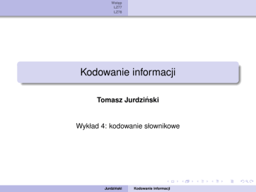 Wstep ˛ LZ77 LZ78 Kodowanie informacji Tomasz Jurdziński Wykład 4: kodowanie słownikowe Jurdziński Kodowanie informacji Wstep ˛ LZ77 LZ78 Motywacja Motywacje 1 2 kodowane dane nie tworza˛ ciagu ˛ wartości niezależnych, rozkład prawdopodobieństwa zależy od symboli poprzedzajacych ˛ symbol kodowany; pewne sekwencje (słowa) cz˛esto sie˛ powtarzaja. ˛ Słowniki statyczne: korzystamy z ustalonego słownika; tekst kodujemy jako ciag ˛ słów ze słownika, każde słowo kodowane przez jego pozycje˛ w słowniku. Co z elementami, których brak w słowniku: można np. umieścić w nim pojedyncze litery. Jurdziński Kodowanie informacji Wstep ˛ LZ77 LZ78 Przykład: kodowanie digramowe Przykład: kodowanie digramowe słownik o ustalonej wielkości składa sie˛ ze wszystkich liter i tylu par liter, ile sie˛ w nim zmieści (wybieramy najbardziej prawdopodobne pary). przykład: dla słownika o rozmiarze 256 i alfabetu złożonego z drukowalnych znaków ASCII, których jest 95, w słowniku można umieścić161 par. Jurdziński Kodowanie informacji Wstep ˛ LZ77 LZ78 Słowniki dynamiczne Dlaczego słowniki statyczne nieskuteczne Wrażliwe na zmiane˛ charakteru danych. Na czym polega słownik dynamiczny dostosowany do charakteru danych; tworzony w trakcie kodowania; zmienia sie˛ w trakcie kodowania; dekoder może go odtworzyć w oparciu o odkodowana˛ cz˛eść danych (nie trzeba słownika dołaczać ˛ do danych); Jurdziński Kodowanie informacji Wstep ˛ LZ77 LZ78 LZ77 czyli nietypowy słownik LZ77 Ziv i Lempel, 1977; Idea: słownikiem jest zakodowana/odkodowana cz˛eść tekstu. Dokładniej: dla zakodowanej cz˛eści x1 . . . xn i niezakodowanej xn+1 . . . xm szukamy najdłuższego podsłowa x1 . . . xn , które jest prefiksem xn+1 . . . xm , czyli dopasowania ... i kodujemy ten prefiks poprzez wskazanie jego pozycji w x1 . . . xn . Jurdziński Kodowanie informacji Wstep ˛ LZ77 LZ78 Jak kodujemy dopasowanie Kodowanie dopasowania jako para (j, k ), gdzie j to odległość miedzy ˛ poczatkiem ˛ kodowanej cz˛eści (pozycja n + 1) a poczatkiem ˛ dopasowania k to długość dopasowania. Przykład tekst: ABXAXABAXAXBBAB zakodowane: ABXAXABA, niezakodowane: XAXBBAB najdłuższe dopasowanie ABXAX ABAXAX BBAB kodowanie: (6, 3). Jurdziński Kodowanie informacji Wstep ˛ LZ77 LZ78 Problem 1 Co z brakiem dopasowania tekst: ABXAXABADAXBBAB zakodowane: ABXAXABA, niezakodowane: DAXBBAB najdłuższe dopasowanie: brak! rozwiazanie: ˛ (0, 0, kod(D)). gdzie kod jest pewnym ustalonym kodem prefiksowym dla alfabetu wejściowego. Ogólnie Kodujemy dopasowanie przy pomocy trójki przesuniecie ˛ długość dopasowania kod symbolu wystepuj ˛ acego ˛ za dopasowaniem w niezakodowanej cz˛eści tekstu. Jurdziński Kodowanie informacji Wstep ˛ LZ77 LZ78 Kodowanie: przykłady Sytuacja typowa tekst: ABXAXABAXAXBBAB zakodowane: ABXAXABA, niezakodowane: XAXBBAB najdłuższe dopasowanie ABXAX ABAXAX BBAB kodowanie: (6, 3, kod(B)). Sytuacja nietypowa tekst: ABXAXABADAXBBAB zakodowane: ABXAXABA, niezakodowane: DAXBBAB najdłuższe dopasowanie: brak! kodowanie: (0, 0, kod(D)). Jurdziński Kodowanie informacji Wstep ˛ LZ77 LZ78 Kodowanie: przykłady Sytuacja nietypowa Zaczynamy kodowanie, czyli cz˛eść zakodowana jest pusta: pierwsza˛ litere˛ x1 kodujemy jako (0, 0, kod(x1 )) czyli uznajemy, że brakuje dopasowania. Jurdziński Kodowanie informacji Wstep ˛ LZ77 LZ78 Kodowanie: sytuacje nietypowe Dopasowanie wybiega poza zakodowana˛ cz˛eść tekst: ADABRARRARRAD zakodowane: ADABRAR, niezakodowane: RARRAD najdłuższe dopasowanie “standardowo”: ADABRARRARRAD standardowe kodowanie: (3, 3, kod(R)).... można wydłużyć do 5 znaków: (3, 5, kod(D)) Jurdziński Kodowanie informacji Wstep ˛ LZ77 LZ78 Kodowanie ogólnie Ogólnie dla zakodowanej cz˛eści x1 . . . xn i niezakodowanej xn+1 . . . xm szukamy najdłuższego podsłowa x1 . . . xm , które zaczyna sie˛ w cz˛eści x1 . . . xn i jest prefiksem xn+1 . . . xm ... i kodujemy ten prefiks poprzez wskazanie przesuniecia, ˛ dopasowania i znaku za dopasowaniem: (p, d, kod(xn+1+d )) gdzie xn+1−p . . . xn+1−p+d−1 = xn+1 . . . xn+1+d−1 . Jurdziński Kodowanie informacji Wstep ˛ LZ77 LZ78 Problemy z kodowaniem Problemy z kodowaniem trójek wartości przesuniecia ˛ z potencjalnie nieskończonego zbioru; podobnie długości dopasowania. Efekty nie możemy stosować kodów o stałej długości; długi czas poszukiwania dopasowania! konieczność przechowywania (najlepiej) w pamieci ˛ operacyjnej całej zakodowanej już cz˛eści tekstu. Jurdziński Kodowanie informacji Wstep ˛ LZ77 LZ78 LZ 77 Jak na prawde˛ wyglada ˛ LZ77 bufor słownikowy: sufiks już zakodowanej cz˛eści tekstu, o ustalonym rozmiarze s; bufor kodowania: prefiks jeszcze nie zakodowanej cz˛eści tekstu, o ustalonym rozmiarze t; okno: bufor słownikowy + bufor kodowania; rozmiar okna s + t. LZ77: jak kodujemy dopasowań szukamy tylko w buforze słownikowym dopasowanie nie może wybiegać poza bufor kodowania (wcześniejszy tekst): (p, d, kod(xn+1+d )) gdzie xn+1−p . . . xn+1−p+d−1 = xn+1 . . . xn+1+d−1 oraz n + 1 − p + d − 1 ≤ n + 1 + t − 1 (t: rozmiar bufora kodowania). Jurdziński Kodowanie informacji Wstep ˛ LZ77 LZ78 LZ 77: długość reprezentacji trójek Kodujemy trójk˛e (p, d, kod(a)) p ≤ s, a zatem można zapisać na dlog se bitach; d ≤ s + t, a zatem można zapisać na dlog(s + d)e bitach; Jurdziński Kodowanie informacji Wstep ˛ LZ77 LZ78 LZ77: ostateczny algorytm kodowania Krok algorytmu LZ77 Znajdź najdłuższe dopasowanie dla prefiksu bufora kodowania w buforze słownikowym: szukamy w buforze słownikowym od końca (zakładamy, że bardziej prawdopodobne sa˛ powtórzenia w małej odległości). Zakoduj dopasowanie przy pomocy trójki: (p, d, C), gdzie: p to przesuniecie ˛ (odległość poczatku ˛ najlepszego dopasowania od bufora kodowania) d to długość dopasowania C to kod symbolu wystepuj ˛ acego ˛ za dopasowanym prefiksem b