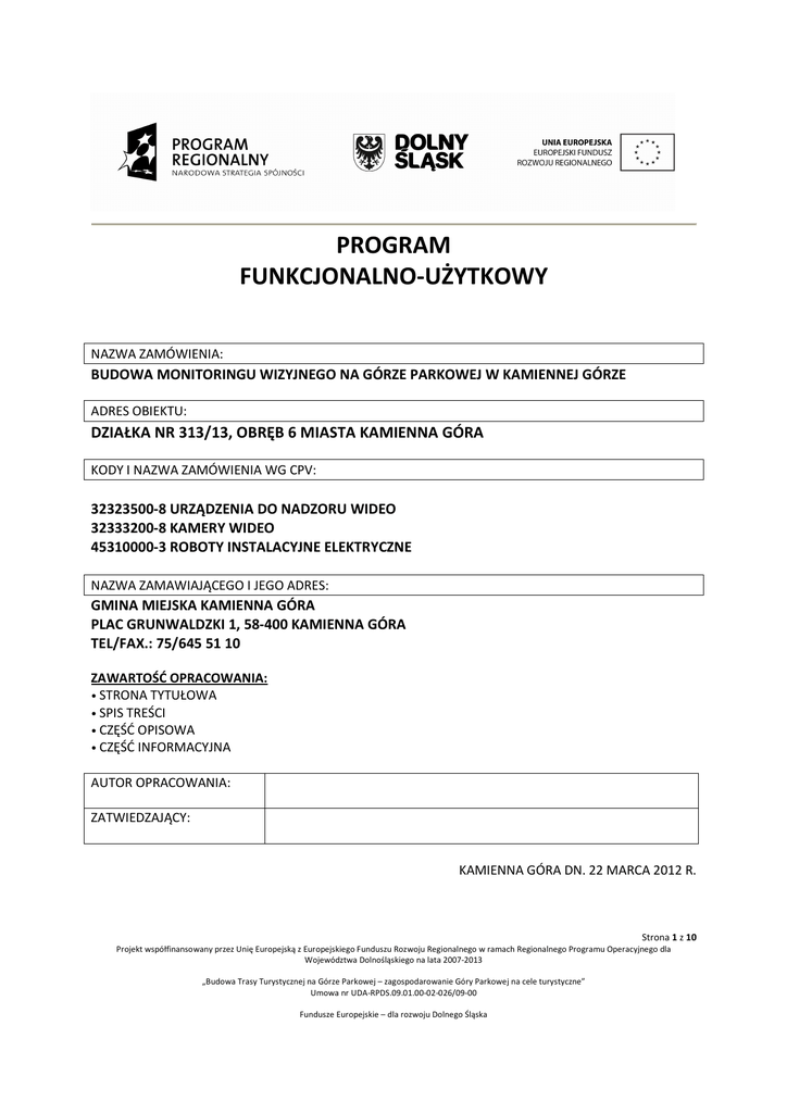 PROGRAM FUNKCJONALNO-UŻYTKOWY NAZWA ZAMÓWIENIA: BUDOWA MONITORINGU WIZYJNEGO NA GÓRZE PARKOWEJ W KAMIENNEJ GÓRZE ADRES OBIEKTU: DZIAŁKA NR 313/13, OBRĘB 6 MIASTA KAMIENNA GÓRA KODY I NAZWA ZAMÓWIENIA WG CPV: 32323500-8 URZĄDZENIA DO NADZORU WIDEO 32333200-8 KAMERY WIDEO 45310000-3 ROBOTY INSTALACYJNE ELEKTRYCZNE NAZWA ZAMAWIAJĄCEGO I JEGO ADRES: GMINA MIEJSKA KAMIENNA GÓRA PLAC GRUNWALDZKI 1, 58-400 KAMIENNA GÓRA TEL/FAX.: 75/645 51 10 ZAWARTOŚĆ OPRACOWANIA: • STRONA TYTUŁOWA • SPIS TREŚCI • CZĘŚĆ OPISOWA • CZĘŚĆ INFORMACYJNA AUTOR OPRACOWANIA: ZATWIEDZAJĄCY: KAMIENNA GÓRA DN. 22 MARCA 2012 R. Strona 1 z 10 Projekt współfinansowany przez Unię Europejską z Europejskiego Funduszu Rozwoju Regionalnego w ramach Regionalnego Programu Operacyjnego dla Województwa Dolnośląskiego na lata 2007-2013 „Budowa Trasy Turystycznej na Górze Parkowej – zagospodarowanie Góry Parkowej na cele turystyczne” Umowa nr UDA-RPDS.09.01.00-02-026/09-00 Fundusze Europejskie – dla rozwoju Dolnego Śląska SZKOLNY PLAC ZABAWW RAMACH PROGRAMU RZADOWEGO „RADOSNA SZKOŁA” PRZY SZKOLE PODSTAWOWEJ NR 1 W KAMIENNEJ GÓRZE Spis treści I. CZĘŚĆ OPISOWA:...................................................................................................................3 1. CEL SPORZĄDZENIA OPRACOWANIA ........................................................................................3 2. OPIS OGÓLNY PRZEDMIOTU ZAMÓWIENIA..............................................................................3 3. SZCZEGÓŁOWY OPIS OGÓLNY PRZEDMIOTU ZAMÓWIENIA.....................................................3 3.1. ZAKRES PRZEDMIOTU ZAMÓWIENIA ..............................................................................................................3 3.2. LOKALIZACJA MONITORINGU WIZYJNEGO ......................................................................................................3 3.3. BUDOWA PUNKTÓW KAMEROWYCH ..............................................................................................................4 3.4. WARUNKI TECHNICZNE BUDOWY SYSTEMU MONITORINGU .........................................................................4 3.5. WYMAGANE UZGODNIENIA ............................................................................................................................4 3.6. WYMAGANIA FUNKCJONALENE I TECHNICZNE DLA MONITORINGU WIZYJNEGO ..........................................4 3.7. POZOSTAŁE WYMAGANIA ...............................................................................................................................8 II. CZĘŚĆ INFORAMACYJNA.......................................................................................................9 1. DOKUMENTY POTWIERDZAJĄCE ZGODNOŚĆ ZAMIERZENIA BUDOWLANEGO Z WYMAGANIAMI WYNIKAJĄCYMI Z ODRĘBNYCH PRZEPISÓW................................................9 2. OŚWIADCZENIE ZAMAWIAJĄCEGO POTWIERDZAJĄCE JEGO PRAWO DO DYSPONOWANIA NIERUCHOMOŚCIĄ NA CELE BUDOWLANE ……………………………………………………........................9 3. TERMINY REALIZACJI PRZEDSIĘWZIĘCIA, FINASOWANIE ZADANIA ..........................................9 4. PRZEPISY PRAWNE I NORMY ZWIĄZANE Z PROJKTOWANIEM I WYKONANIEM ZAMIERZENIA BUDOWLANEGO........................................................................................................................9 5. INNE POSIADANE INFORMACJE I DOKUMENTY NIEZBĘDNE DO ZAPROJEKTOWANIA ROBÓT BUDOWLANYCH ......................................................................................................................10 5.1. INNE DOKUMENTY BĘDĄCE W POSIADANIU ZAMAWIAJĄCEGO ...................................................................10 5.2. DODATKOWE WYMAGANIA I WYTYCZNE ZAMAWIAJĄCEGO .......................................................................10 Projekt współfinansowany przez Unię Europejską z Europejskiego Funduszu Rozwoju Regionalnego w ramach Regionalnego Programu Operacyjnego dla Województwa Dolnośląskiego na lata 2007-2013 „Budowa Trasy Turystycznej na Górze Parkowej – zagospodarowanie Góry Parkowej na cele turystyczne” Umowa nr UDA-RPDS.09.01.00-02-026/09-00 Fundusze Europejskie – dla rozwoju Dolnego Śląska I. CZĘŚĆ OPISOWA 1. CEL SPORZĄDZENIA OPRACOWANIA Celem sporządzenia niniejszego programu funkcjonalno-użytkowego jest przygotowanie ofert na wykonanie dokumentacji projektowej oraz robót budowlano-montażowych dla zadania pn.: „Budowa monitoringu wizyjnego na Górze Parkowej w Kamiennej Górze” 2. OPIS OGÓLNY PRZEDMIOTU ZAMÓWIENIA Przedmiotem zamówienia publicznego jest wykonanie projektu sytemu monitoringu wizyjnego na terenie planowanej Trasy Turystycznej na Górze Parkowej w Kamiennej Górze oraz jego budowa wraz z uruchomieniem i wdrożeniem. 3. SZCZEGÓŁOWY OPIS PRZEDMIOTU ZAMÓWIENIA 3.1. ZAKRES PRZEDMIOTU ZAMÓWIENIA Przedmiot zamówienia obejmuje: 3.1.1.Projekt i wykonanie kompletnego systemu monitoringu wizyjnego składającego się z 8 nowych punktów kamerowych, wykorzystujący do transmisji sygnału wizyjnego i sterowania cyfrowy system radiowy zgodnie z : − wymaganiami funkcjonalnymi i technicznymi określonymi przez Zamawiającego w pkt 3.6 niniejszego programu funkcjonalno-użytkowego, a także ewentualnymi, dodatkowymi i udokumentowanymi uzgodnieniami w zakresie tych wymagań, dokonanymi z Zamawiającym na etapie prac projektowych lub w trakcie trwania przedmiotu zamówienia, − obowiązującymi przepisami i normami prawnymi oraz instrukcjami producenta urządzeń 3.1.2.Uruchomienie i wdrożenie całego systemu wraz z testami poprawnego funkcjonowania systemu. 3.1.3. Serwis gwarancyjny w okresie objętym gwarancją. 3.2. LOKALIZACJA MONITORINGU WIZYJNEGO Monitoring wizyjny winien być zlokalizowany na terenie planowanej Trasy Turystycznej na Górze Parkowej w Kamiennej Górze. Obszar Trasy Turystycznej na Górze Parkowej przedstawiono na r