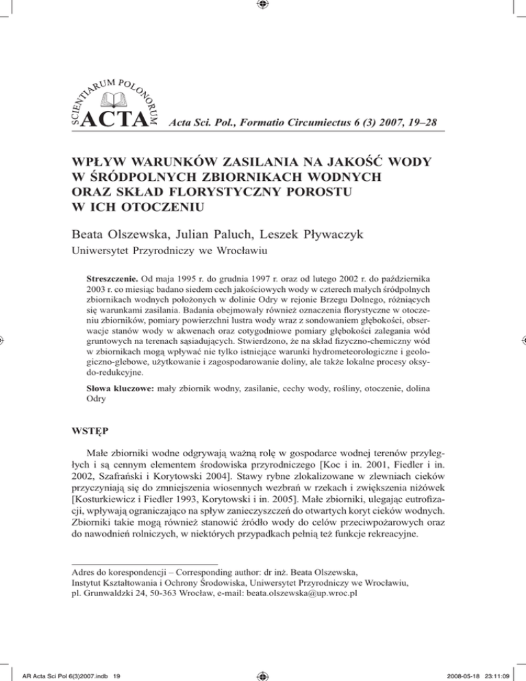 wpływ warunków zasilania na jakość wody w śródpolnych