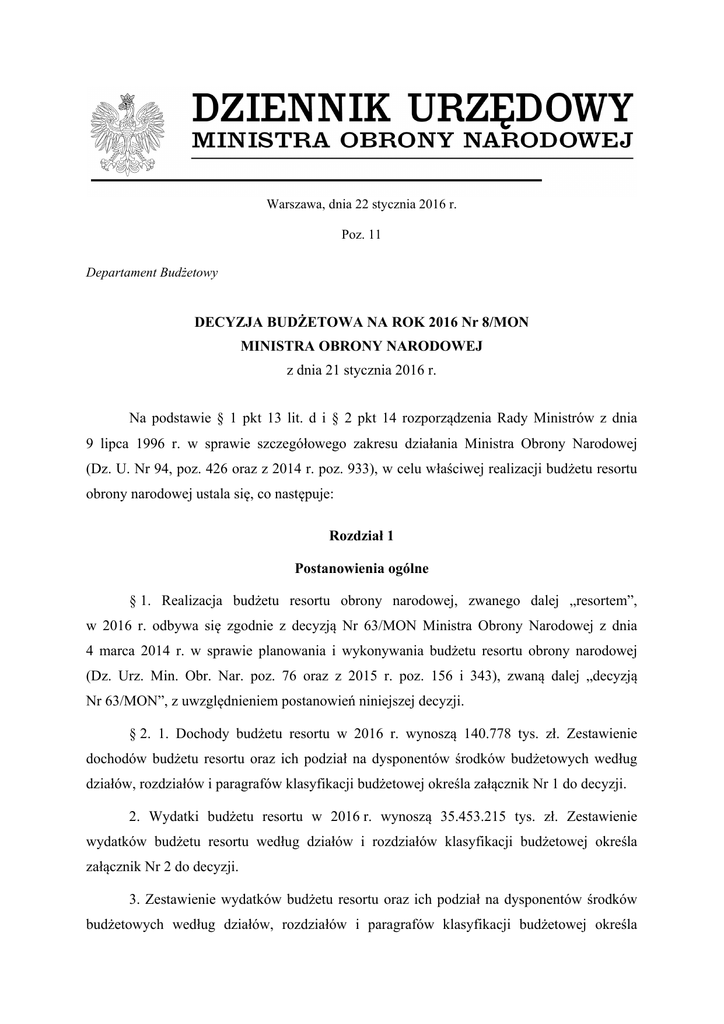 Warszawa, dnia 22 stycznia 2016 r. Poz. 11 Departament Budżetowy DECYZJA BUDŻETOWA NA ROK 2016 Nr 8/MON MINISTRA OBRONY NARODOWEJ z dnia 21 stycznia 2016 r. Na podstawie § 1 pkt 13 lit. d i § 2 pkt 14 rozporządzenia Rady Ministrów z dnia 9 lipca 1996 r. w sprawie szczegółowego zakresu działania Ministra Obrony Narodowej (Dz. U. Nr 94, poz. 426 oraz z 2014 r. poz. 933), w celu właściwej realizacji budżetu resortu obrony narodowej ustala się, co następuje: Rozdział 1 Postanowienia ogólne § 1. Realizacja budżetu resortu obrony narodowej, zwanego dalej „resortem”, w 2016 r. odbywa się zgodnie z decyzją Nr 63/MON Ministra Obrony Narodowej z dnia 4 marca 2014 r. w sprawie planowania i wykonywania budżetu resortu obrony narodowej (Dz. Urz. Min. Obr. Nar. poz. 76 oraz z 2015 r. poz. 156 i 343), zwaną dalej „decyzją Nr 63/MON”, z uwzględnieniem postanowień niniejszej decyzji. § 2. 1. Dochody budżetu resortu w 2016 r. wynoszą 140.778 tys. zł. Zestawienie dochodów budżetu resortu oraz ich podział na dysponentów środków budżetowych według działów, rozdziałów i paragrafów klasyfikacji budżetowej określa załącznik Nr 1 do decyzji. 2. Wydatki budżetu resortu w 2016 r. wynoszą 35.453.215 tys. zł. Zestawienie wydatków budżetu resortu według działów i rozdziałów klasyfikacji budżetowej określa załącznik Nr 2 do decyzji. 3. Zestawienie wydatków budżetu resortu oraz ich podział na dysponentów środków budżetowych według działów, rozdziałów i paragrafów klasyfikacji budżetowej określa załącznik Nr 3 do decyzji. § 3. 1. Ustala się podział limitów stanów średniorocznych żołnierzy i funkcjonariuszy na 2016 r. w wielkościach określonych w załączniku Nr 4 do decyzji. 2. Liczbę zwolnień z zawodowej służby wojskowej w 2016 r. przewidziano na poziomie 5.500 żołnierzy zawodowych, w tym około 45% żołnierzy posiadających uprawnienia emerytalne. § 4. Wykaz dotacji udzielanych z budżetu resortu w 2016 r. określa załącznik Nr 5 do decyzji. § 5. 1. Przychody i koszty państwowego funduszu celowego „Fundusz Modernizacji Sił Zbrojnych” oraz instytucji gospodarki budżetowej „Zakład Inwestycji Organizacji Traktatu Północnoatlantyckiego”, zwanej dalej „ZIOTP”, wynoszą: 1) państwowy fundusz celowy „Fundusz Modernizacji Sił Zbrojnych”: a) przychody – 60.284 tys. zł, b) koszty – 191.025 tys. zł, c) stan funduszu na początek roku – 170.105 tys. zł; 2) ZIOTP: a) przychody – 252.251 tys. zł, b) koszty – 252.064 tys. zł. 2. Podział kwot, o których mowa w ust. 1, według form organizacyjno-prawnych, określa załącznik Nr 6 do decyzji. § 6. Wydatki budżetu resortu w układzie zadaniowym oraz ich podział na dysponentów określa załącznik Nr 7 do decyzji. § 7. Katalog funkcji, zadań, podzadań, działań, celów i mierników ich wykonania oraz osób funkcyjnych odpowiedzialnych (współodpowiedzialnych) za ich planowanie, monitorowanie realizacji i ocenę wykonania w ramach części 29 Obrona narodowa na 2016 r. określa załącznik Nr 8 do decyzji. § 8. Ustala się wydatki budżetowe pozostające w limicie dysponenta części przeznaczone na: 1) fundusz na nagrody uznaniowe i zapomogi dla żołnierzy zawodowych w wysokości 2 51.360 tys. zł, w tym na nagrody uznaniowe 41.088 tys. zł, a na zapomogi 10.272 tys. zł (rozdział 75213); 2) fundusz na nagrody i zapomogi dla żołnierzy niezawodowych w wysokości 607 tys. zł (rozdział 75213), w tym na nagrody 486 tys. zł, a na zapomogi 121 tys. zł; 3) fundusz na zapomogi dla byłych żołnierzy niezawodowych w wysokości 145 tys. zł (rozdział 75213); 4) fundusz na zapomogi dla weteranów-żołnierzy i weteranów poszkodowanych-żołnierzy w wysokości 400 tys. zł (rozdział 75301); 5) fundusz nagród i zapomóg dla strażaków Państwowej Straży Pożarnej pełniących służbę w jednostkach organizacyjnych Wojskowej Ochrony Przeciwpożarowej w wysokości 156 tys. zł (rozdział 75213); 6) celowy fundusz nagród dla pracowników objętych Ponadzakładowym Układem Zbiorowym Pracy dla Pracowników Wojskowych Jednostek Organizacyjnych Sfery Budżetowej w wysokości 407 tys. zł (rozdział 75213); 7) fundusz nagród dla nauczycieli akademickich w wysokości 130 tys. zł (rozdział 80302), naliczony stosownie do postanowień art. 155 ust. 2 ustawy z dnia 27 lipca 2005 r. – Prawo o szkolnictwie wyższym (Dz. U. z 2012 r. poz. 572, z późn. zm.1)); 8) fundusz na wyróżnienia, o którym mowa w rozporządzeniu Ministra Obrony Narodowej z dnia 23 czerwca 2010 r. w sprawie wyróżniania żołnierzy, byłych żołnierzy oraz pododdziałów, oddziałów i instytucji wojskowych (Dz. U. Nr 124, poz. 841), w wysokości 1.516 tys. zł (rozdział 75213); 9) zmiany organizacyjno-etatowe oraz należności osobowe i świadczenia żołnierzy zawodowych pozostających w rezerwie kadrowej w wysokości 179.978 tys. zł (rozdziały 75201, 75213), w tym uposażenia 147.374 tys. zł, wydatki bieżące 32.604 tys. zł, uruchamiane na wniosek dysponentów finansujących te wydatki; 10) składki na ubezpieczenia emerytalne i rentowe dla żołnierzy zwolnionych z zawodowej służby wojskowej, niespełniających warunków do nabycia prawa do emerytury wojskowej lub wojskowej renty inwalidzkiej, od uposażenia wypłacanego żołnierzowi po 1) Zmiany tekstu jednolitego wymienionej ustawy zostały ogłoszone w Dz. U. z 2012 r. poz. 742 i 1544, z 2013 r. poz. 675, 829, 1005, 1588 i 1650, z 2014 r. poz. 7, 768, 821, 1004, 1146, 1198 oraz z 2015 r. poz. 357, 860, 1187, 1240, 1268, 1767 i 1923. 3 dniu 31 grudnia 1998 r. do dnia zwolnienia ze służby, w wysokości 103.426 tys. zł (rozdział 75213), uruchamiane na wniosek dysponentów finansujących te wydatki; 11) składki do organizacji międzynarodowych finansowane bezpośrednio z rachunku dysponenta części w wysokości 214.386 tys. zł (rozdziały 75213, 75280) nadzorowanych merytorycznie przez osoby 