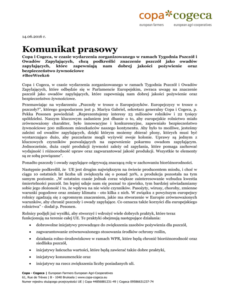 14.06.2016 r. Komunikat prasowy Copa i Cogeca, w czasie wydarzenia zorganizowanego w ramach Tygodnia Pszczół i Owadów Zapylają cych, chcą podkreślić znaczenie pszczół jako owadów zapylaj ą cych, które zapewniaj ą nam dobrej jakości pożywienie oraz bezpieczeństwo żywnościowe #BeeWeek16 Copa i Cogeca, w czasie wydarzenia zorganizowanego w ramach Tygodnia Pszczół i Owadów Zapylających, które odbędzie się w Parlamencie Europejskim, zwraca uwagę na znaczenie pszczół jako owadów zapylających, które zapewniają nam dobrej jakości pożywienie oraz bezpieczeństwo żywnościowe. Przemawiając na wydarzeniu „Pszczoł y w trosce o Europejczyków. Europejczycy w trosce o pszczoł y?”, którego gospodarzem jest p. Mariya Gabriel, sekretarz generalny Copa i Cogeca, p. Pekka Pesonen powiedział : „Reprezentujemy interesy 23 milionów rolników i 22 tysięcy spół dzielni. Naszym kluczowym zadaniem jest dbanie o to, aby europejskie rolnictwo miał o zrównoważony charakter, był o innowacyjne i konkurencyjne, zapewniał o bezpieczeństwo żywnościowe 500 milionom mieszkańców naszego kontynentu. Aby był o to możliwe, jesteśmy zależni od owadów zapylających, dzięki którym możemy zbierać plony, których musi być wystarczająco dużo, aby pszczelarze mogli wyżywić swoje kolonie. Uprawy są jednym z kluczowych czynników pozwalających na zapewnienie pokarmu owadom zapylającym. Jednocześnie, duża część produkcji żywności zależy od zapylania, które pomaga zachować wydajność i różnorodność upraw oraz zagwarantować jakość produkcji. Wszystkie te elementy są ze sobą powiązane”. Ponadto pszczoły i owady zapylające odgrywają znaczącą rolę w zachowaniu bioróżnorodności. Następnie podkreślił, że UE jest drugim największym na świecie producentem miodu, i choć w ciągu 10 ostatnich lat liczba uli zwiększył a się o ponad 30%, a produkcja pozostał a na tym samym poziomie. „W ostatnim czasie jednak coraz większe zainteresowanie wzbudza kwestia śmiertelności pszczół. Im lepiej udaje nam się poznać to zjawisko, tym bardziej uświadamiamy sobie jego złożoność i to, że wpływa na nie wiele czynników. Pasożyty, wirusy, choroby, zmienne warunki pogodowe oraz zmiany klimatu - oto kilka z nich. W związku z powyższym europejscy rolnicy zgadzają się z ogromnym znaczeniem, jakie ma stworzenie w Europie zrównoważonych warunków, aby chronić pszczoły i owady zapylające. Co oznacza także korzyści dla europejskiego rolnictwa” - dodał p. Pesonen. Rolnicy podjęli już wysiłki, aby stworzyć i wdrożyć wiele dobrych praktyk, które teraz funkcjonują na terenie całej UE. Te praktyki obejmują następujące działania: dobrowolne inicjatywy prowadzące do zwiększenia zasobów pożywienia dla pszczół, zagwarantowanie zrównoważonego stosowania środków ochrony roślin, działania rolno-środowiskowe w ramach WPR, które będą chronić bioróżnorodność oraz siedliska pszczół, inicjatywy łańcucha wartości, które będą zawierać także dobre praktyki, inicjatywy konsumenckie oraz inicjatywy na rzecz zwiększenia liczby posiadanych uli. Copa - Cogeca | European Farmers European Agri-Cooperatives 61, Rue de Trèves | B - 1040 Bruksela | www.copa-cogeca.eu Numer rejestru służącego przejrzystości UE | Copa 44856881231-49 | Cogeca 09586631237-74 Podsumowując, p. Pesonen powiedział : „Copa i Cogeca są przekonane, że dialog i współ praca między rolnikami i pszczelarzami są warunkami koniecznymi, aby znaleźć rozwiązanie satysfakcjonujące obie strony. Chcemy jeszcze raz podkreślić znaczenie rolnictwa dla owadów zapylających i odwrotnie, a także konieczność podejścia lokalnego, kreowanego oddolnie, które będzie się opierać na informacjach z terenu. W interesie nas wszystkich jest, aby rolnicy nadal stosowali dobre praktyki, które są przyjazne owadom zapylającym, a jednocześnie rentowne z ekonomicznego punktu widzenia. Natomiast pszczelarze powinni nadal prowadzić rozmowy, które pozwolą stworzyć rozwiązania dopasowane do lokalnych warunków i będą korzystne dla wszystkich stron”. Dalszych informacji udziela: Cynthia Benites Doradca ds. polityk Tel. +32 2 287 27 70 [email protected] CDP(16)5479:1 Amanda Cheesley Rzecznik prasowy Tel. kom. + 32 474 840 836 [email protected]
