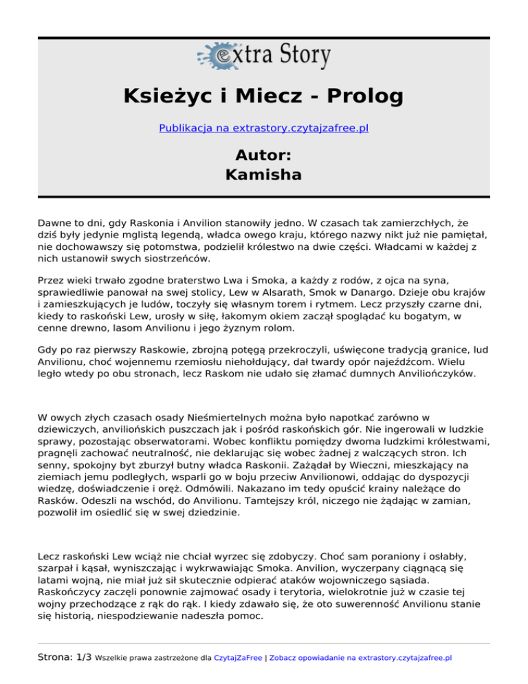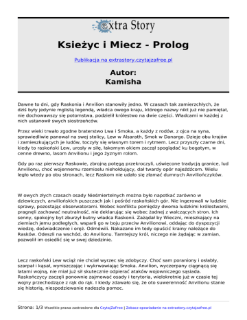 Ksieżyc i Miecz - Prolog Publikacja na extrastory.czytajzafree.pl Autor: Kamisha Dawne to dni, gdy Raskonia i Anvilion stanowiły jedno. W czasach tak zamierzchłych, że dziś były jedynie mglistą legendą, władca owego kraju, którego nazwy nikt już nie pamiętał, nie dochowawszy się potomstwa, podzielił królestwo na dwie części. Władcami w każdej z nich ustanowił swych siostrzeńców. Przez wieki trwało zgodne braterstwo Lwa i Smoka, a każdy z rodów, z ojca na syna, sprawiedliwie panował na swej stolicy, Lew w Alsarath, Smok w Danargo. Dzieje obu krajów i zamieszkujących je ludów, toczyły się własnym torem i rytmem. Lecz przyszły czarne dni, kiedy to raskoński Lew, urosły w siłę, łakomym okiem zaczął spoglądać ku bogatym, w cenne drewno, lasom Anvilionu i jego żyznym rolom. Gdy po raz pierwszy Raskowie, zbrojną potęgą przekroczyli, uświęcone tradycją granice, lud Anvilionu, choć wojennemu rzemiosłu niehołdujący, dał twardy opór najeźdźcom. Wielu legło wtedy po obu stronach, lecz Raskom nie udało się złamać dumnych Anviliończyków. W owych złych czasach osady Nieśmiertelnych można było napotkać zarówno w dziewiczych, anviliońskich puszczach jak i pośród raskońskich gór. Nie ingerowali w ludzkie sprawy, pozostając obserwatorami. Wobec konfliktu pomiędzy dwoma ludzkimi królestwami, pragnęli zachować neutralność, nie deklarując się wobec żadnej z walczących stron. Ich senny, spokojny byt zburzył butny władca Raskonii. Zażądał by Wieczni, mieszkający na ziemiach jemu podległych, wsparli go w boju przeciw Anvilionowi, oddając do dyspozycji wiedzę, doświadczenie i oręż. Odmówili. Nakazano im tedy opuścić krainy należące do Rasków. Odeszli na wschód, do Anvilionu. Tamtejszy król, niczego nie żądając w zamian, pozwolił im osiedlić się w swej dziedzinie. Lecz raskoński Lew wciąż nie chciał wyrzec się zdobyczy. Choć sam poraniony i osłabły, szarpał i kąsał, wyniszczając i wykrwawiając Smoka. Anvilion, wyczerpany ciągnącą się latami wojną, nie miał już sił skutecznie odpierać ataków wojowniczego sąsiada. Raskończycy zaczęli ponownie zajmować osady i terytoria, wielokrotnie już w czasie tej wojny przechodzące z rąk do rąk. I kiedy zdawało się, że oto suwerenność Anvilionu stanie się historią, niespodziewanie nadeszła pomoc. Strona: 1/3 Wszelkie prawa zastrzeżone dla CzytajZaFree | Zobacz opowiadanie na extrastory.czytajzafree.pl Krwawa bitwa stoczona pod murami Danargo, nie rozstrzygnęła wprawdzie ostatecznie, o racji którejś z walczących stron. Anvilion otrzymał jednak wsparcie Nieśmiertelnych. Dalsza wojna byłaby powolnym wykrwawianiem się przeciwników, zarówno nieustępliwych Anviliończyków, jak i wojowniczych Rasków. Ci ostatni, z konieczności i rozsądku ustąpili pola. Zrezygnowali z roszczeń, wycofali się i zgodzili się zawrzeć pokój. Nie było jednak łatwo przełknąć niepowodzenie, dumnemu władcy Rasków. Pomoc, jakiej Nieśmiertelni udzielili Anvilionowi, ostrym cierniem utkwiła głęboko w jego sercu. Zażądał, by Wieczny Lud opuścił krainy ludzkie, niezwłocznie i na zawsze. Od spełnienia tego żądania uzależnił swoją zgodę na wytęskniony przez wszystkich pokój. Kassador, władca Nieśmiertelnych odbył długą naradę ze starszymi swego ludu. Trzy dni i trzy noce trwała ich rozmowa. Czwartego dnia, o świcie, każdemu ze śmiertelnych królów, Kassador wręczył zapieczętowany pergamin, oznajmiając, iż jego lud opuści ziemie zamieszkane przez oba narody i nigdy więcej tu nie powróci. Lecz on także postawił warunek. Królowie mieli powierzyć opiece Nieśmiertelnych artefakty: Raskowie – Miecz, Anviliończycy – Koronę. I tak, choć Nieśmiertelni przyczynili się do zawarcia pokoju i wynegocjowania rozsądnych jego warunków, musieli opuścić krainy, o których spokojny sen zabiegali. Jedna tylko z ich krwi pozostała w krainach ludzi, Amavilde, poślubiona człowiekowi, anviliońskiemu grafowi. Lecz po jego śmierci i ona zniknęła, jak piękny sen. Rodzina powiadała, że odeszła za swoimi, gdyż światło żywota jej ukochanego zgasło a życie pośród śmiertelników stało się męką. Po Wiecznych, zarówno na północy, jak i południu pozostały jedynie legendy i przepowiednie. Jedna z nich mówiła, iż przyjdą dni ciemne, gdy znów wojna poróżni Raskonię i Anvilion. I że w ów mroczny czas daleko, na północy, pośród Nieśmiertelnych, Lew odnajdzie Nadzieję, Miecz i Koronę. Miecz należy do Lwa Raskonii, lecz Koronę musi on zwrócić Anvilionowi, ludziom zaś przywrócona zostanie Nadzieja, gdy Lew o Smoczych Skrzydłach ostatecznie zjednoczy dwa zwaśnione kraje. Gdy to się stanie zamknie się trzeci z Kręgów i dopełni się czas Nieśmiertelnych na ziemi. *** - Trzy Kręgi, siostro moja… Trzy Kręgi – powtórzył cicho, jakby do siebie. – I to za twoją sprawą pierwszy z nich się zamyka. - Tak chce przeznaczenie. - Sami możemy tworzyć przeznaczenie – warknął z irytacją. – Jeszcze nie jest za późno. Porzuć śmiertelnego człowieka, Amavilde i odejdź z nami, a przeznaczenie będzie musiało szukać innej drogi. Nam zaś pozostanie nadzieja. - A co pozostawimy ludziom, Helianderze? Wiesz, że krew trojga rodów musi zmieszać się w jednym naczyniu, by los się dopełnił. - Cóż nas obchodzą ludzie?! – zawrzał gniewem. – Czyż nie dosyć już dla nich uczyniliśmy? I jak nam odpłacają?! Skazując na wygnanie! Strona: 2/3 Wszelkie prawa zastrzeżone dla CzytajZaFree | Zobacz opowiadanie na extrastory.czytajzafree.pl - Boją się nas. Nie rozumieją... - Śmiertelni – prychnął pogardliwie. – Nie do nich powinien należeć świat, lecz do nas. Oni nie szanują niczego. Obracają w perzynę wszystko, czego się dotkną, bo sami są jak marne plewy. Nie potrafię zrozumieć, jak możesz kochać jednego z tych, tak nietrwałych, bezwarto