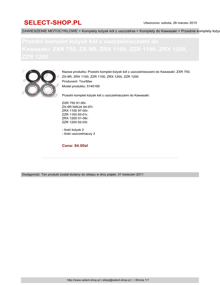 SELECT-SHOP.PL Utworzono: sobota, 28 marzec 2015 ZAWIESZENIE MOTOCYKLOWE > Komplety łożysk kół z uszczelnia > Komplety do Kawasaki > Przednie komplety łożys Przedni komplet łożysk kół z uszczelniaczami do Kawasaki: ZXR 750, ZX-9R, ZRX 1100, ZZR 1100, ZRX 1200, ZZR 1200 Nazwa produktu: Przedni komplet łożysk kół z uszczelniaczami do Kawasaki: ZXR 750, ZX-9R, ZRX 1100, ZZR 1100, ZRX 1200, ZZR 1200 Producent: TourMax Model produktu: 5140195 Przedni komplet łożysk kół z uszczelniaczami do Kawasaki: ZXR 750 91-95r. ZX-9R NINJA 94-97r. ZRX 1100 97-00r. ZZR 1100 93-01r. ZRX 1200 01-06r. ZZR 1200 02-03r. - Ilość łożysk 2 - Ilość uszczelniaczy 2 Cena: 84.00zł Dostępność: Ten produkt został dodany do sklepu w dniu piątek, 01 kwiecień 2011 http://www.select-shop.pl | [email protected] | | Strona 1/1