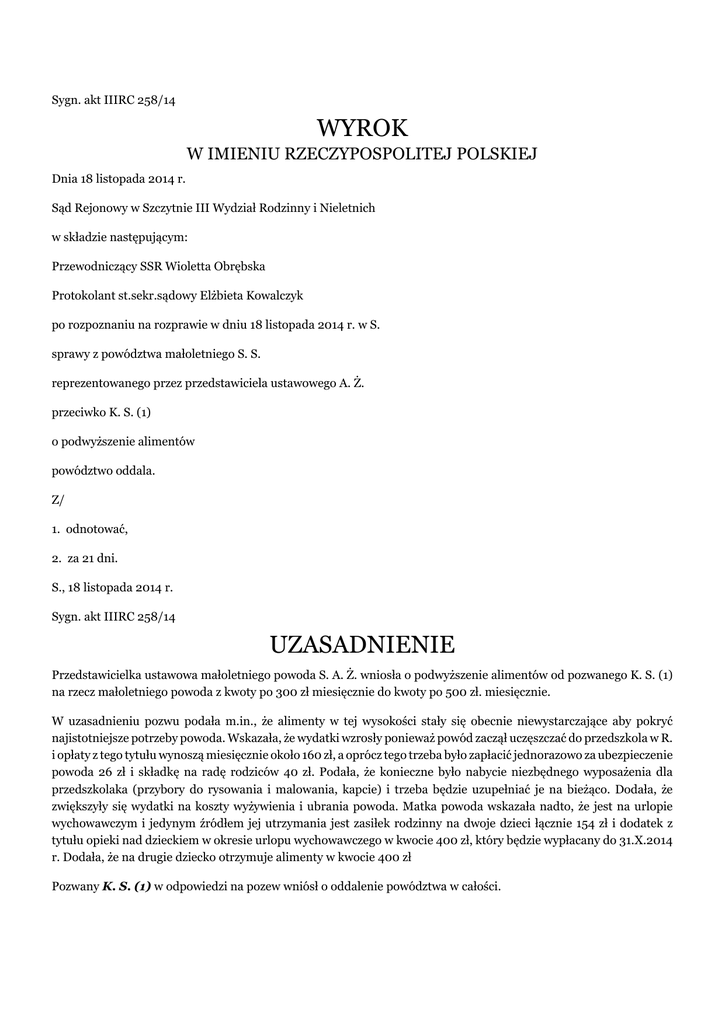 Sygn. akt IIIRC 258/14 WYROK W IMIENIU RZECZYPOSPOLITEJ POLSKIEJ Dnia 18 listopada 2014 r. Sąd Rejonowy w Szczytnie III Wydział Rodzinny i Nieletnich w składzie następującym: Przewodniczący SSR Wioletta Obrębska Protokolant st.sekr.sądowy Elżbieta Kowalczyk po rozpoznaniu na rozprawie w dniu 18 listopada 2014 r. w S. sprawy z powództwa małoletniego S. S. reprezentowanego przez przedstawiciela ustawowego A. Ż. przeciwko K. S. (1) o podwyższenie alimentów powództwo oddala. Z/ 1. odnotować, 2. za 21 dni. S., 18 listopada 2014 r. Sygn. akt IIIRC 258/14 UZASADNIENIE Przedstawicielka ustawowa małoletniego powoda S. A. Ż. wniosła o podwyższenie alimentów od pozwanego K. S. (1) na rzecz małoletniego powoda z kwoty po 300 zł miesięcznie do kwoty po 500 zł. miesięcznie. W uzasadnieniu pozwu podała m.in., że alimenty w tej wysokości stały się obecnie niewystarczające aby pokryć najistotniejsze potrzeby powoda. Wskazała, że wydatki wzrosły ponieważ powód zaczął uczęszczać do przedszkola w R. i opłaty z tego tytułu wynoszą miesięcznie około 160 zł, a oprócz tego trzeba było zapłacić jednorazowo za ubezpieczenie powoda 26 zł i składkę na radę rodziców 40 zł. Podała, że konieczne było nabycie niezbędnego wyposażenia dla przedszkolaka (przybory do rysowania i malowania, kapcie) i trzeba będzie uzupełniać je na bieżąco. Dodała, że zwiększyły się wydatki na koszty wyżywienia i ubrania powoda. Matka powoda wskazała nadto, że jest na urlopie wychowawczym i jedynym źródłem jej utrzymania jest zasiłek rodzinny na dwoje dzieci łącznie 154 zł i dodatek z tytułu opieki nad dzieckiem w okresie urlopu wychowawczego w kwocie 400 zł, który będzie wypłacany do 31.X.2014 r. Dodała, że na drugie dziecko otrzymuje alimenty w kwocie 400 zł Pozwany K. S. (1) w odpowiedzi na pozew wniósł o oddalenie powództwa w całości. W uzasadnieniu podniósł, iż z obowiązku alimentacyjne wywiązuje się sumiennie, pomagając matce swojego syna nawet w większym zakresie niż zobowiązał go do tego Sąd. Wskazał, że w miarę swoich możliwości dodatkowo kupuje synowi ubrania (buty, kurtka) oraz inne drobne rzeczy. Dodał, że jego sytuacja finansowa jest zła z przyczyn leżących po stronie matki powoda. Wskazał, że w związku z oszukaniem go przez matkę powoda przez ponad rok czasu płacił jej dodatkowe alimenty w kwocie 250 zł na jej drugie dziecko O. Ż., która nie jest jego dzieckiem. Podał, że nawet kiedy wygrał sprawę o ustalenie bezskuteczności uznania ojcostwa, powódka nie zrezygnowała z nienależnych jej alimnetów. Wskazał, że dopiero wyrok sądu w sprawie o uchylenie alimnetów spowodował, że nie musi płacić na nie swoje dziecko. Dodał, że konieczność wytoczenia spraw sądowych spowodowała, iż popadł w kłopoty finansowe gdyż sprawy kosztowały go około 15000 zł. Musiał pożyczyć pieniądze od najbliższej rodziny. Wskazał nadto, że nie posiada stałego zatrudnienia, nie jest zarejestrowany jako bezrobotny ponieważ jest ubezpieczony w KRUS-ie. Podał, że utrzymuje się jedynie z prac sezonowych w branży budowlanej, z czego uzyskuje dochód średnio 1100 zł miesięcznie. Dodał, że w sezonie zimowym w ogóle nie osiąga dochodów. Wymienił wydatki które co miesiąc ponosi tj. energia elektryczna 120 zł, 50 zł telefon, 300 zł wyżywienie, środki higieny osobistej, chemia gospodarcza, 36 zł abonament telewizyjny, 200 zł paliwo do samochodu, 300 zł alimenty na syna K. S. (2), 300 zł na powoda. Sąd ustalił następujący stan faktyczny: Alimenty od pozwanego K. S. (1) na rzecz małoletniego powoda S. S. zostały zasądzone w wysokości po 300 zł. miesięcznie w wyroku Sądu Rejonowego w Szczytnie w dniu 8 kwietnia 2013 r., w sprawie sygn. akt III RC 71/13. W wyroku Sąd również zasądził od pozwanego alimenty w kwocie po 250 zł na rzecz małoletniej O. S.. Na sprawie pozwany kwestionował swoje ojcostwo wobec O. S. twierdząc, że ma informację, iż matka dziecka pobiera na nie pieniądze od innego mężczyzny. A. Ż. przed Sądem podała wówczas, że O. S. jest dzieckiem pozwanego a ona nie miała kontaktów z innymi mężczyznami. A. Ż. wówczas nie pracowała, przebywała na urlopie wychowawczym. Utrzymywała się, jak twierdziła, z pomocy siostry i zasiłku wychowawczego oraz rodzinnego w łącznej kwocie około 500 zł. Nie ponosiła kosztów utrzymania domu, w którym mieszkała. Małoletni powód S. S. miał 3 lata, nie chodził do przedszkola, pozostawał pod opieką matki. Dziecko było zdrowe, rozwijało się prawidłowo. Pozwany K. S. (1) miał ziemię ponad 3 ha, którą otrzymał w darowiźnie od rodziców. Utrzymywał się z dopłaty w wysokości 2500 zł otrzymanej miesiąc wcześniej. Pozwany nie pracował. Został zwolniony z pracy w W., gdyż przeciął przewody w trakcie pracy. W W. zarabiał od 60-200 zł dziennie. Dniówka w wysokości 200 zł zdarzała się mu 1-2 razy w miesiącu. W W. mieszkanie zapewniał mu pracodawca. Miesięcznie zarabiał wówczas około 2100-2300 zł. Pracował bez umowy. Po powrocie do miejsca zamieszkania K. S. (1) pracował przez okres około 4,5 tygodnia u stolarza w Ł.. Przestał tam pracować po tym jak został pobity przez partnera siostry A. Ż.. Pozwany mieszkał sam dzieląc budynek z bratem. Ponosił opłaty za światło w wysokości 100 zł, 61 zł za abonament za telefon, za opał płacił 2000 zł za sezon. Ponadto opłacał alimenty na syna z poprzedniego związku w wysokości 300 zł miesięcznie. Pozwany był zdrowy, palił papierosy, choć próbował rzucić. Opłacał nadto ubezpieczenie w KRUS w kwocie 130 zł na kwartał. (dowód: akta IIIRC 71/13). Wyrokiem Sądu Rejonowego w Łomży sygn. akt III RC 162/13 ustalono bezskuteczność uznania ojcostwa przez K. S. (1) wobec małoletniej O. S.. Sąd zasądził też od A. Ż. na rzecz K. S. (1) kwotę 1800 zł tytułem zwrotu kosztów procesu. Obecnie małole