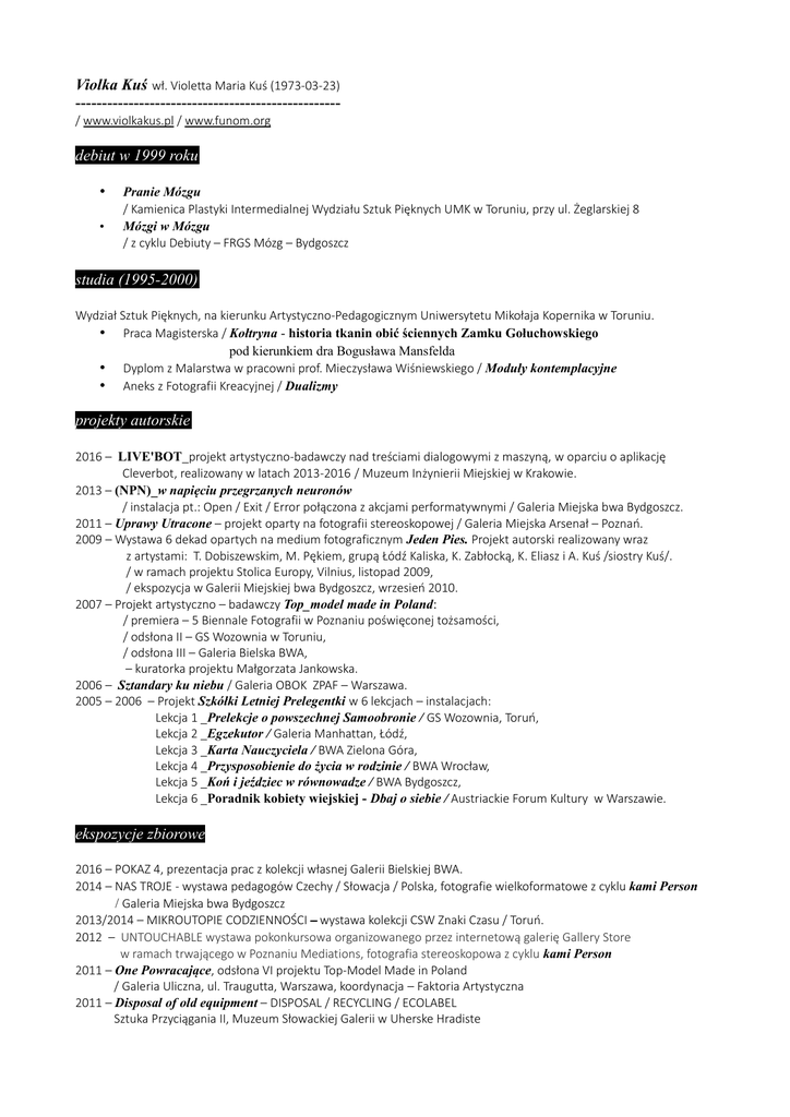 Violka Kuś wł. Violetta Maria Kuś (1973-03-23) -------------------------------------------------/ www.violkakus.pl / www.funom.org debiut w 1999 roku • • Pranie Mózgu / Kamienica Plastyki Intermedialnej Wydziału Sztuk Pięknych UMK w Toruniu, przy ul. Żeglarskiej 8 Mózgi w Mózgu / z cyklu Debiuty – FRGS Mózg – Bydgoszcz studia (1995-2000) Wydział Sztuk Pięknych, na kierunku Artystyczno-Pedagogicznym Uniwersytetu Mikołaja Kopernika w Toruniu. • Praca Magisterska / Kołtryna - historia tkanin obić ściennych Zamku Gołuchowskiego pod kierunkiem dra Bogusława Mansfelda • Dyplom z Malarstwa w pracowni prof. Mieczysława Wiśniewskiego / Moduły kontemplacyjne • Aneks z Fotografii Kreacyjnej / Dualizmy projekty autorskie 2016 – LIVE'BOT_projekt artystyczno-badawczy nad treściami dialogowymi z maszyną, w oparciu o aplikację Cleverbot, realizowany w latach 2013-2016 / Muzeum Inżynierii Miejskiej w Krakowie. 2013 – (NPN)_w napięciu przegrzanych neuronów / instalacja pt.: Open / Exit / Error połączona z akcjami performatywnymi / Galeria Miejska bwa Bydgoszcz. 2011 – Uprawy Utracone – projekt oparty na fotografii stereoskopowej / Galeria Miejska Arsenał – Poznań. 2009 – Wystawa 6 dekad opartych na medium fotograficznym Jeden Pies. Projekt autorski realizowany wraz z artystami: T. Dobiszewskim, M. Pękiem, grupą Łódź Kaliska, K. Zabłocką, K. Eliasz i A. Kuś /siostry Kuś/. / w ramach projektu Stolica Europy, Vilnius, listopad 2009, / ekspozycja w Galerii Miejskiej bwa Bydgoszcz, wrzesień 2010. 2007 – Projekt artystyczno – badawczy Top_model made in Poland: / premiera – 5 Biennale Fotografii w Poznaniu poświęconej tożsamości, / odsłona II – GS Wozownia w Toruniu, / odsłona III – Galeria Bielska BWA, – kuratorka projektu Małgorzata Jankowska. 2006 – Sztandary ku niebu / Galeria OBOK ZPAF – Warszawa. 2005 – 2006 – Projekt Szkółki Letniej Prelegentki w 6 lekcjach – instalacjach: Lekcja 1 _Prelekcje o powszechnej Samoobronie / GS Wozownia, Toruń, Lekcja 2 _Egzekutor / Galeria Manhattan, Łódź, Lekcja 3 _Karta Nauczyciela / BWA Zielona Góra, Lekcja 4 _Przysposobienie do życia w rodzinie / BWA Wrocław, Lekcja 5 _Koń i jeździec w równowadze / BWA Bydgoszcz, Lekcja 6 _Poradnik kobiety wiejskiej - Dbaj o siebie / Austriackie Forum Kultury w Warszawie. ekspozycje zbiorowe 2016 – POKAZ 4, prezentacja prac z kolekcji własnej Galerii Bielskiej BWA. 2014 – NAS TROJE - wystawa pedagogów Czechy / Słowacja / Polska, fotografie wielkoformatowe z cyklu kami Person / Galeria Miejska bwa Bydgoszcz 2013/2014 – MIKROUTOPIE CODZIENNOŚCI – wystawa kolekcji CSW Znaki Czasu / Toruń. 2012 – UNTOUCHABLE wystawa pokonkursowa organizowanego przez internetową galerię Gallery Store w ramach trwającego w Poznaniu Mediations, fotografia stereoskopowa z cyklu kami Person 2011 – One Powracające, odsłona VI projektu Top-Model Made in Poland / Galeria Uliczna, ul. Traugutta, Warszawa, koordynacja – Faktoria Artystyczna 2011 – Disposal of old equipment – DISPOSAL / RECYCLING / ECOLABEL Sztuka Przyciągania II, Muzeum Słowackiej Galerii w Uherske Hradiste 2010 – Jak trudno być kobietą…Top_Model Made In Poland – odsłona V / Dom Polski - Wilno 2010 – Pysia – autoportret - HALL0 – akcja szkoły bydgoskiej / Galeria Miejska bwa Bydgoszcz 2010 – Dance – projekcja w 4 kierunkach – instalacja – wystawa POLYGONUM 2 / Galeria Miejska bwa Bydgoszcz 2010 – Dance – projekcja - IV FESTIWAL IN OUT / CSW Łażnia – Gdańsk 2010 – Endermologie – cykl fotografii / INSIDE OUT / Galeria Miejska bwa Bydgoszcz 2009/2010 – Uff – IV WYSTAWA Kolekcji Dolnośląskiego Towarzystwo Zachęty Sztuk Pięknych, / Muzeum Architektury / Wrocław 2009 – Kasa Chorych Szczęśliwy Traf / The National Health Service “A lucky chance” – prezentacja multimedialna / PRAWA CZŁOWIEKA – w oczach artysty Wystawa Międzynarodowa z okazji 60. rocznicy uchwalenia Karty Praw Człowieka przez ONZ / Galeria Miejska bwa Bydgoszcz. 2009 – Dbaj o siebie / Show me Yours / Galeria Stowarzyszenia Artystów w Mannheim / Galeria Miejska bwa Bydgoszcz 2009 – Endermologie – cykl fotografii / INSIDE OUT / Patras 2008 – Kociarz – instalacja w ramach ZDE/ARZEŃ BYDGOSKICH – kurator Wacław Kuczma / Galeria Krytyków POKAZ, Warszawa 2008 – Symetria Zachowana - w projekcie Słodycz i Zwątpienie - kuratorka Małgorzata Jankowska / GS Wozownia, Toruń 2008 – Jak trudno być kobietą…Top_Model Made in Poland – odsłona w projekcie Ani Wolskiej razem z Anią Nizio, Basią Sokołowskiej, Kasią Majak, z inicjatywy Fundacji PSF CENTRUM KOBIET / Galeria Niecodzienna - Warszawa 2008 – One / 3 / 6 – „Efekt Czerwonych Oczu” Fotografia polska XXI wieku / CSW Zamek Ujazdowski, Warszawa 2006 – Demontaż Atrakcji - Rozpoznanie III: / Waruj Jak Pies, Walcz z Korupcją! / Nie Oszukujmy się Każdy z Nas ma Kota. / Galeria Bałucka – Łódź 2006 – Waleczni – instalacja / działania Galerii Bezdomnej / Muzeum Okręgowe w Bydgoszczy 2005 – Krowa Wielofunkcyjna – instalacja / Demontaż Atrakcji - Rozpoznanie II / Galeria Miejska Arsenał – Poznań / Galeria Bielska BWA 2005 – Akcesoria Kobiety Wiejskiej – 4 Biennale Fotografii w Poznaniu 2005 – Organizmy czarno-białe_Osobliwości – „GDZIE JESTEŚMY?” / WYSTAWA FOTOGRAFII ZPAF 2004 – Akcesoria Kobiety Wiejskiej - XVI EDYCJA GALERII BEZDOMNEJ / Berlin 2004 – Partners – GLOB-ALL? – kuratorka Katarzyna Majak Young Polish Photography, / WomanKraft Gallery Tucson / Arizona 2003 – Wystawa Główna – 25 INTERNATIONAL FOTOFESTIVAL KNOKKE-HEIST / Belgia 2003 – W Stadzie Siła! Wystawa pt.: ROZPOZNANIE / GSW Wozownia , Toruń 2002 – LOOK AT ME – Festiwal Młodej Sztuki - hale targowe w Krakowie / 1. realizacja instalacji 35 Prelekcji o Powszechnej Samoobronie / 2. billbord z fotografiami z cyklu: Przekwalifikowani pasterze radzą: Jedz war