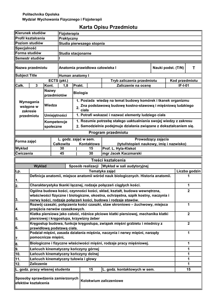 Politechnika Opolska Wydział Wychowania Fizycznego i Fizjoterapii Karta Opisu Przedmiotu Kierunek studiów Profil kształcenia Poziom studiów Specjalność Forma studiów Semestr studiów Fizjoterapia Praktyczny Studia pierwszego stopnia Nazwa przedmiotu Anatomia prawidłowa człowieka I Subject Title Całk. 3 Wymagania wstępne w zakresie przedmiotu Studia stacjonarne I Nauki podst. (T/N) T Human anatomy I ECTS (pkt.) Tryb zaliczenia przedmiotu Kod przedmiotu Kont. 1,8 Prakt. Zaliczenie na ocenę IF-I-01 Nazwy Biologia przedmiotów 1. Posiada wiedzę na temat budowy komórek i tkanek organizmu Wiedza Zna podstawową budowę kostno-stawową i mięśniową ludzkiego 2. ciała 1. Potrafi wskazać i nazwać elementy ludziego ciała Umiejętności … 1. Rozumie potrzebę stałego uaktualniania swojej wiedzy z zakresu Kompetencje 2. Samodzielnie podejmuje działania związane z dokształcaniem się. społeczne … Forma zajęć Wykład Ćwiczenia Program przedmiotu L. godz. zajęć w sem. Prowadzący zajęcia Całkowita Kontaktowa (tytuł/stopień naukowy, imię i nazwisko) 30 15 Prof. L. Hyla-Klekot | 45 30 mgr Jacek Kaczmarski | Treści kształcenia Wykład Lp. Sposób realizacji Wykład w sali audytoryjnej Tematyka zajęć Definicja anatomii, miejsce anatomii wśród nauk biologicznych. Historia anatomii. Liczba godzin 1 1. 2. 3. 4. 5. 6. 7. 8. 9. 10. 11. 12. Charakterystyka tkanki łącznej, rodzaje połączeń ciągłych kości. 1 Ogólna budowa kości, czynności kości, skład, kształt, budowa wewnętrzna, właściwości fizyczne i biologiczne, okostna, ochrzęstna, szpik kostny, naczynia i nerwy kości, rodzaje połączeń kości, budowa i rodzaje stawów. Rozwój czaszki, połączenia kości czaszki, staw skroniowo – żuchwowy, miejsca przejścia nerwów czaszkowych. Klatka piersiowa jako całość, różnice płciowe klatki piersiowej, mechanika klatki piersiowej i kręgosłupa, krzywizny żeber Kręgosłup budowa, funkcje kręgosłupa, związek mięśni grzbietu i miednicy z prawidłową podstawą ciała. Podział mięśni, zasada działania mięśnia, naczynia i nerwy mięśni, narządy pomocnicze mięśni, 2 Biologiczne i fizyczne właściwości mięśni, rodzaje pracy mięśniowej. 1 Łańcuch kinematyczny kończyny górnej Łańcuch kinematyczny kończyny dolnej Łańcuch kinematyczny tułowia i głowy Zaliczenie 1 1 1 1 L. godz. pracy własnej studenta 15 L. godz. kontaktowych w sem. Sposoby sprawdzenia zamierzonych Kolokwium zaliczeniowe efektów kształcenia 1 2 2 1 15 Ćwiczenia Lp. 1. 2. 3. 4. 5. 6. 7. 8. 9. 10. 11. 12. 13. Sposób realizacji Ćwczienia w grupach Tematyka zajęć Plan budowy ciała ludzkiego. Podział ciała wg osi i płaszczyzn. Okolice ciała. Budowa tkanki kostnej. Podział kości i miejsca ich występowania. Połączenia kości. Podział anatomiczny. Kryteria i rodzaje połączeń (ścisłe i wolne). Inne kryteria podziału. Szkielet osiowy – kręgosłup. Ogólna budowa kręgu. Podział kręgosłupa na odcinki z uwzględnieniem różnic w ich budowie. Połączenia w obrębie szkieletu osiowego. Kręgosłup jako całość. Krzywizny kręgosłupa. Budowa anatomiczna klatki piersiowej. Budowa kostna klatki piersiowej – mostek i żebra. Połączenie w obrębie klatki piersiowej i ich mechanika. Kości mózgoczaszki – budowa. Opis budowy kości mózgoczaszki ze szczególnym uwzględnieniem podstawy czaszki – dół przedni, środkowy i tylny. Liczba godzin 2 Anatomiczna budowa trzewioczaszki. Podział kości trzewioczaszki. Budowa kości trzewioczaszki. Czaszka jako całość. Połączenia kości czaszki 2 Szkielet kończyny górnej. Kości obręczy i kości kończyny górnej wolnej. Połączenia w obrębie kończyny górnej. Szkielet kończyny dolnej. Kości obręczy biodrowej i kończyny dolnej wolnej. 2 Połączenia w obrębie kończyny dolnej. Kolokwium z biernego układu ruchu. 2 2 Układ mięśniowy. Ogólna charakterystyka tkanki mięśniowej. Rodzaje mięśni z uwzględnieniem ułożenie i funkcji. Mięśnie szkieletowe tułowia. Mięśnie grzbietu – powierzchowne. Mięśnie grzbietu – głębokie Mięśnie kończyny górnej wolnej. Mięśnie obręczy barkowej . 2 Mięśnie kończyny dolnej wolnej. Mięśnie miednicy. Kolokwium z czynnego układu ruchu. 4 1 L. godz. pracy własnej studenta 15 L. godz. kontaktowych w sem. prezentacja, kolokwium, obserwacja, dyskusja Sposoby sprawdzenia zamierzonych efektów kształcenia Wiedza Efekty kształcenia dla przedmiotu - po zakończonym cyklu kształcenia Umiejętności Kompetencje społeczne 2 2 2 3 4 30 KF_W03 zna budowę anatomiczną człowieka i opisuje układ 1. kostno - stawowy i mięśniowy. 2. KF_U30 rozpoznaje i objaśnia ustnie budowę i funkcje układu 1. kostno - stawowego i mięśniowego 1. KF_K01 jest świadomy potrzeby uaktualniania swojej wiedzy i angażuje się w działania związane z dokształcaniem Metody dydaktyczne: Wykład: Wykład informacyjny. Prezentacje multimedialne Ćwiczenia: Ćwiczenia praktyczne. Dyskusja dydaktyczna. Konsultacje. Forma i warunki zaliczenia przedmiotu: Wykład: kolokwium zaliczeniowe - test wyboru (50% poprawnych odpowiedzi), warunkiem dopuszczenia do zaliczenia wykładu jest pozytywna ocena z ćwiczeń Ćwiczenia: kolowium zaliczeniowe - pytania otwarte (50% poprawnych odpowiedzi) - 50% oceny końcowej ocena z odpowiedzi ustnej - 20% oceny końcowej obserwacja postawy i zachowań studenta 10% - oceny końcowej dyskusja - 10% oceny końcowej prezentacja (praca własna studenta) - 10% oceny końcowej Literatura podstawowa: [1] Ignasiak Z., Janusz A., Jarosińska A:. Anatomia człowieka, część I, AWF Wrocław 2009 [2] Sobotta J.: Atlas anatomii człowieka. Urban & Partner, Wrocław, 1998 [3] Sokołowska-Pituchowa J.: Anatomia człowieka. PZWL, Warszawa 1992. [4] Schünke M.:Prometeusz - atlas anatomii człowieka. T. 1, Anatomia ogólna i układ mięśniowoszkieletowy, Wrocław 2009 Literatura uzupełniająca: [1] Bochenek A.: Anatomia człowie