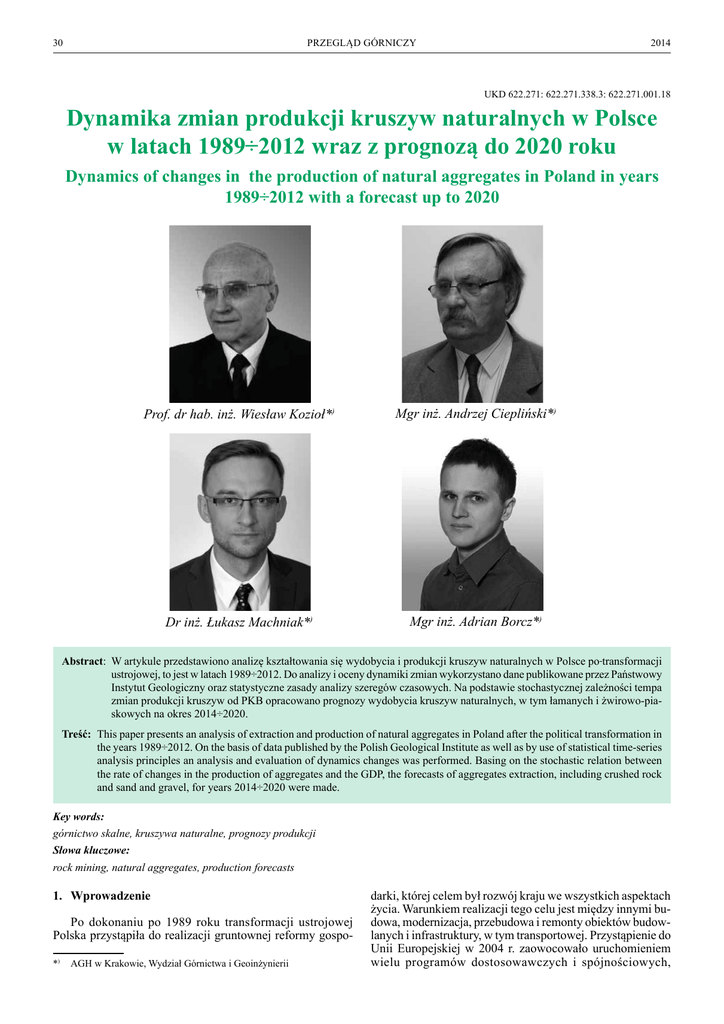 30 PRZEGLĄD GÓRNICZY 2014 UKD 622.271: 622.271.338.3: 622.271.001.18 Dynamika zmian produkcji kruszyw naturalnych w Polsce w latach 1989÷2012 wraz z prognozą do 2020 roku Dynamics of changes in the production of natural aggregates in Poland in years 1989÷2012 with a forecast up to 2020 Prof. dr hab. inż. Wiesław Kozioł*) Mgr inż. Andrzej Ciepliński*) Dr inż. Łukasz Machniak*) Mgr inż. Adrian Borcz*) Abstract: W artykule przedstawiono analizę kształtowania się wydobycia i produkcji kruszyw naturalnych w Polsce po transformacji ustrojowej, to jest w latach 1989÷2012. Do analizy i oceny dynamiki zmian wykorzystano dane publikowane przez Państwowy Instytut Geologiczny oraz statystyczne zasady analizy szeregów czasowych. Na podstawie stochastycznej zależności tempa zmian produkcji kruszyw od PKB opracowano prognozy wydobycia kruszyw naturalnych, w tym łamanych i żwirowo-piaskowych na okres 2014÷2020. Treść: This paper presents an analysis of extraction and production of natural aggregates in Poland after the political transformation in the years 1989÷2012. On the basis of data published by the Polish Geological Institute as well as by use of statistical time-series analysis principles an analysis and evaluation of dynamics changes was performed. Basing on the stochastic relation between the rate of changes in the production of aggregates and the GDP, the forecasts of aggregates extraction, including crushed rock and sand and gravel, for years 2014÷2020 were made. Key words: górnictwo skalne, kruszywa naturalne, prognozy produkcji Słowa kluczowe: rock mining, natural aggregates, production forecasts 1. Wprowadzenie Po dokonaniu po 1989 roku transformacji ustrojowej Polska przystąpiła do realizacji gruntownej reformy gospo*) AGH w Krakowie, Wydział Górnictwa i Geoinżynierii darki, której celem był rozwój kraju we wszystkich aspektach życia. Warunkiem realizacji tego celu jest między innymi budowa, modernizacja, przebudowa i remonty obiektów budowlanych i infrastruktury, w tym transportowej. Przystąpienie do Unii Europejskiej w 2004 r. zaowocowało uruchomieniem wielu programów dostosowawczych i spójnościowych, Nr 10 PRZEGLĄD GÓRNICZY 31 a Polska stała się znaczącym beneficjentem budżetu unijnego. Przyznane środki pozwoliły na rozpoczęcie modernizacji i rozwój wielu gałęzi krajowej gospodarki. Istotna część otrzymanych funduszy została przeznaczona na infrastrukturę, w tym głównie autostrady i drogi krajowe. Celem tego działania jest ich dostosowanie i zsynchronizowanie z europejskim systemem transportowym, bowiem szczególnie budowa nowych dróg publicznych i tras kolejowych jest warunkiem nowej, rzeczywistej spójności z Unią Europejską. Budowa i modernizacja infrastruktury transportowej wymaga znacznej ilości kruszyw, które są podstawowym materiałem budowlanym i w budownictwie drogowym ilościowo stanowią ponad 90 % wykorzystywanych materiałów. Tym niemniej kruszywa, w tym głównie kruszywa naturalne, w Polsce są stosowane w całym budownictwie, a tylko ich część wykorzystuje się w budownictwie drogowym. Zużycie kruszyw do budowy dróg w latach 2000÷2011 wyniosło 15÷30 % całej produkcji [2]. Realizacja przyjętych celów gospodarczych integralnie związana jest z wielkością zapotrzebowania na kruszywa oraz możliwościami produkcyjnymi i wydobywczymi przedsiębiorstw wytwarzających ten surowiec. Celem pracy jest prześledzenie wielkości produkcji (wydobycia) kruszyw naturalnych (żwirowo-piaskowych i łamanych) oraz dynamiki jej zmian w okresie po 1989 roku, a także próba oceny (prognoza) wielkości produkcji do 2020 roku w oparciu o ekonometryczny model, zakładający liniową zależność pomiędzy dynamiką zmian zapotrzebowania i produkcji kruszyw a dynamiką zmian Produktu Krajowego Brutto (PKB). 2. Dynamika zmian produkcji kruszyw naturalnych w Polsce w latach 1989÷2012 ablica 1. Analiza szeregu czasowego produkcji kruszyw łamanych (KNŁ) w latach 1989÷2012 (opracowanie własne na podstawie [4]) Table 1. Crushed rock production time series analysis in 1989÷2012 (own development on the basis [4]) Tablica 2. Analiza szeregu czasowego produkcji kruszyw żwirowo-piaskowych (KNŻ) w latach 1989÷2012 (opracowanie własne) Table 2. Sand and gravel production time series analysis in 1989÷2012 (own development) *) *) Czas t Rok 0 1 2 3 4 5 6 7 8 9 10 11 12 13 14 15 16 17 18 19 20 21 22 23 24*) 1989 1990 1991 1992 1993 1994 1995 1996 1997 1998 1999 2000 2001 2002 2003 2004 2005 2006 2007 2008 2009 2010 2011 2012 2013 szacunkowo estimation Produkcja Przyrost KNŁ absolutny mln Mg mln Mg 31,6 19,9 -11,7 14,7 -5,2 14,8 0,1 13,8 -1,0 16,1 2,3 17,3 1,2 23,0 5,7 24,0 1,0 28,0 4,0 30,3 2,3 27,7 -2,6 25,6 -2,1 29,2 3,6 32,4 3,2 37,1 4,7 43,1 6,0 47,1 4,0 45,0 -2,1 50,9 5,9 55,3 4,4 63,2 7,9 84,6 21,4 64,0 -20,6 55,0 -9,00 Indeks KNŁt/t-1 Indeks KNŁt/0 0,63 0,74 1,01 0,93 1,17 1,07 1,33 1,04 1,17 1,08 0,91 0,92 1,14 1,11 1,15 1,16 1,09 0,96 1,13 1,09 1,14 1,34 0,76 0,86 1,00 0,63 0,47 0,47 0,44 0,51 0,55 0,73 0,76 0,89 0,96 0,88 0,81 0,92 1,03 1,17 1,36 1,49 1,42 1,61 1,75 2,00 2,68 2,03 1,74 Do analizy dynamiki produkcji kruszyw naturalnych w Polsce zastosowano zasady analizy szeregów czasowych z wykorzystaniem miar dynamiki [1], do których zalicza się przyrosty (absolutne i względne) oraz indywidualne indeksy dynamiki. Obliczenia przyrostów, czyli różnic pomiędzy wielkością produkcji w danym roku w stosunku do roku przyjętego za bazowy, informują o wzroście lub obniżeniu produkcji w porównaniu do roku bazowego: tonażowo (przyrost absolutny) lub procentowo (przyrost względny), natomiast indeksy indywidualne łańcuchowe, będące ilorazem poziomu produkcji w dwóch kolejnych latach następujących po sobie, dostarczają oceny dynamiki wielkości produkcji (dynamika „rok do roku”). Na podstawie indeksów łańcuchowych można wyznaczyć średnie tempo zmian wielkości produkcji kruszyw 